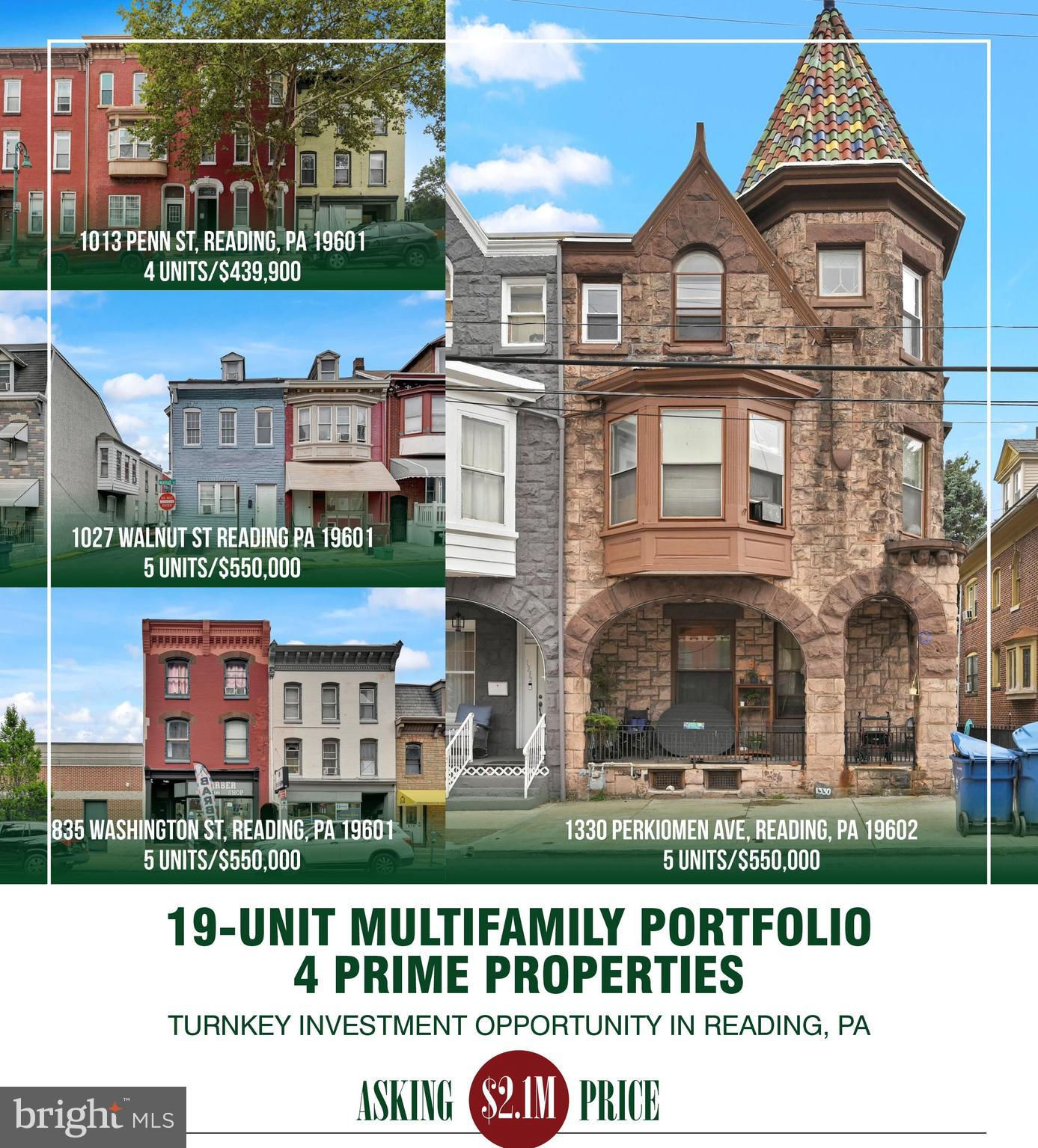 19-Unit Investment Portfolio – Reading, PA Presenting a rare opportunity to acquire a 19-unit multifamily package across 4 properties in Reading, PA. This portfolio offers a diverse mix of residential and commercial income-producing assets, all located within close proximity for ease of management. Property Breakdown: 1330 Perkiomen Ave, Reading, PA 19602 – 5 Residential Units / 1013 Penn St, Reading, PA 19601 – 4 Residential Units / 1027 Walnut St, Reading, PA 19601 – 5 Residential Units / 835 Washington St, Reading, PA 19601 – 5 Units (1 Commercial Storefront + 4 Residential Units) / Utilities & Expenses: Tenants pay their own electricity and electric heat. Owner is responsible for water, sewer, trash, and common area electric This portfolio provides a solid foundation for both new and seasoned investors, offering steady cash flow, strong rental demand, and upside potential in a growing market. Additional rental details and financials are available upon request. Please contact us today to schedule a walkthrough and learn more about this opportunity.