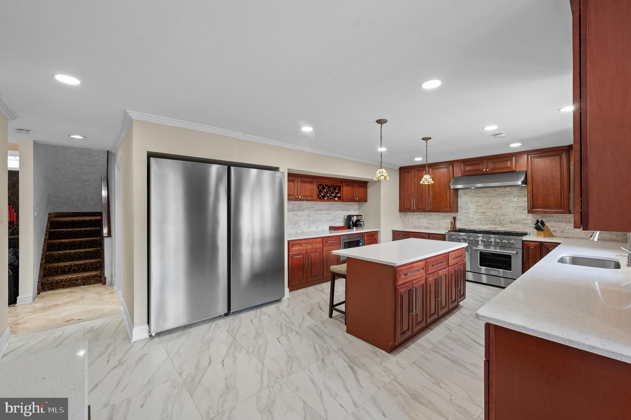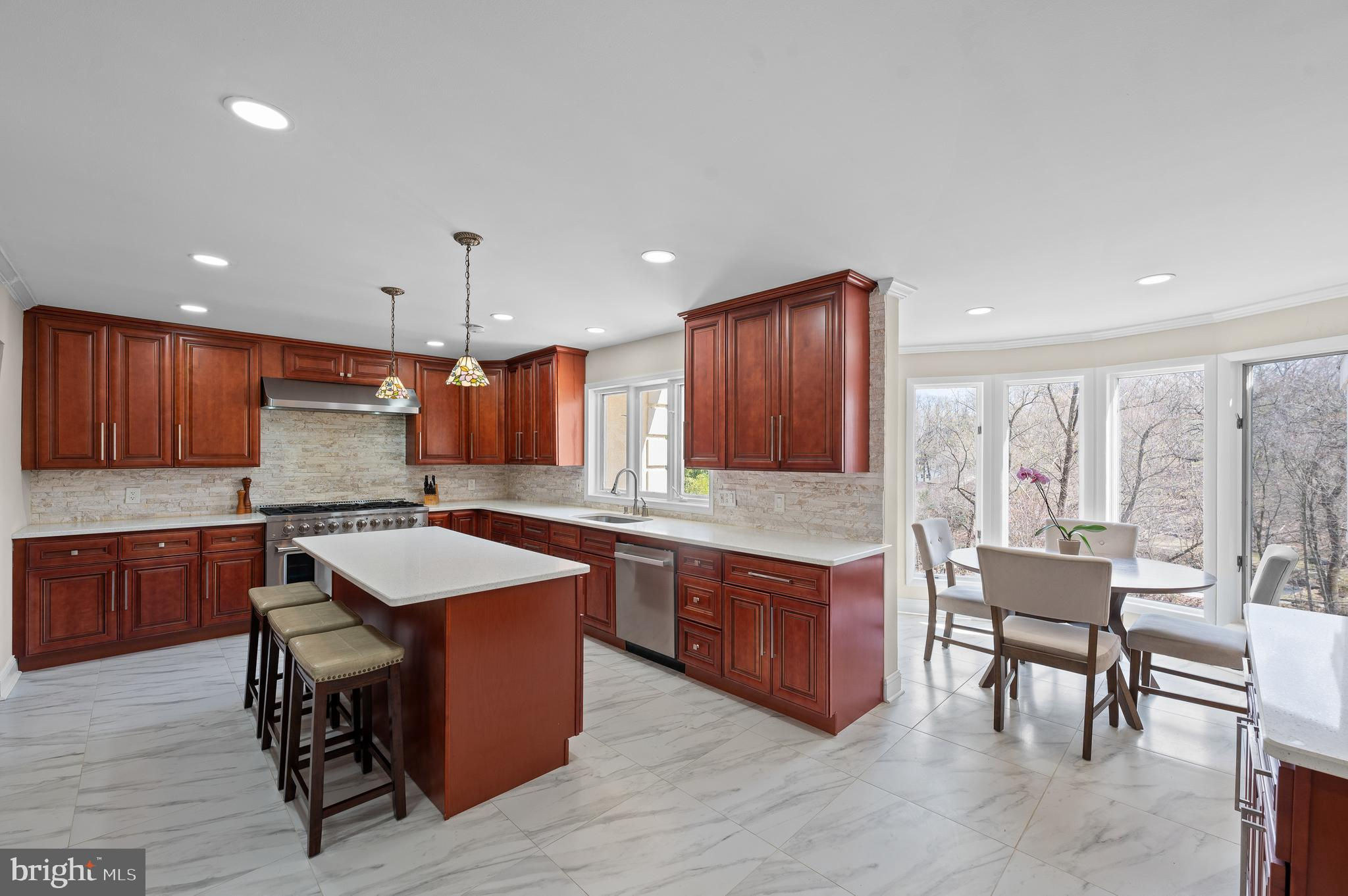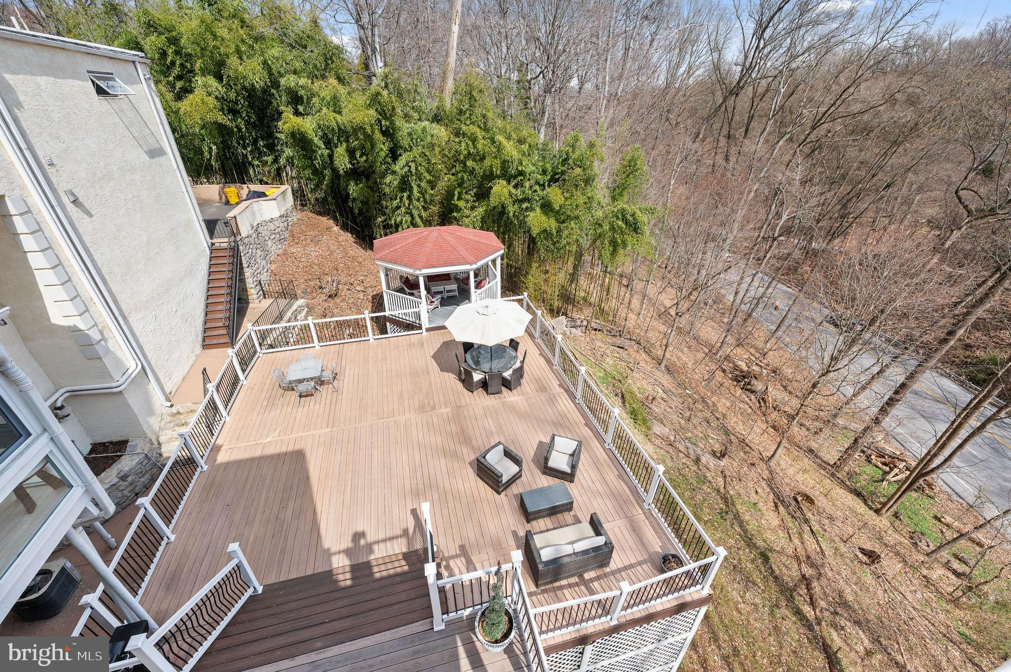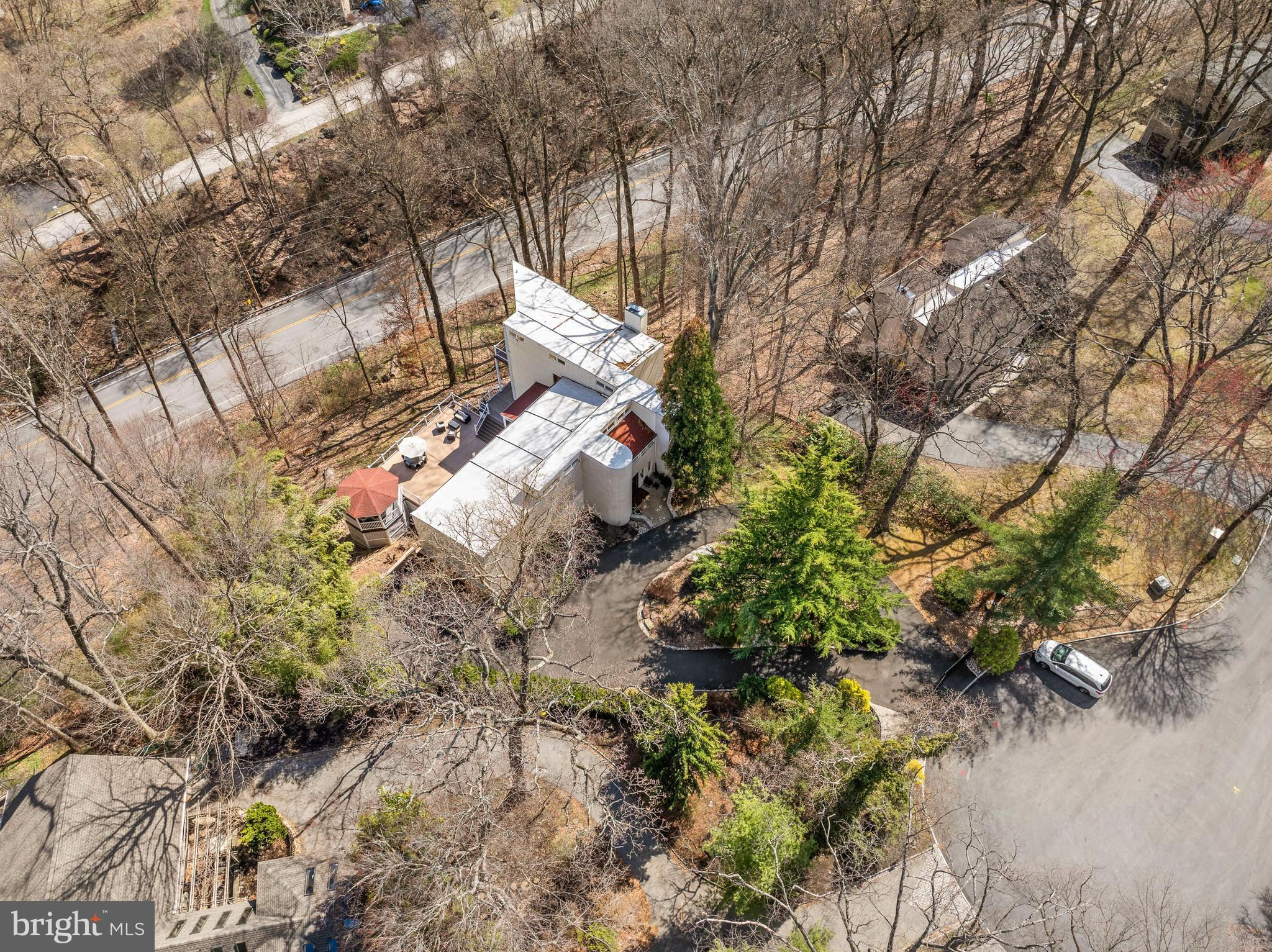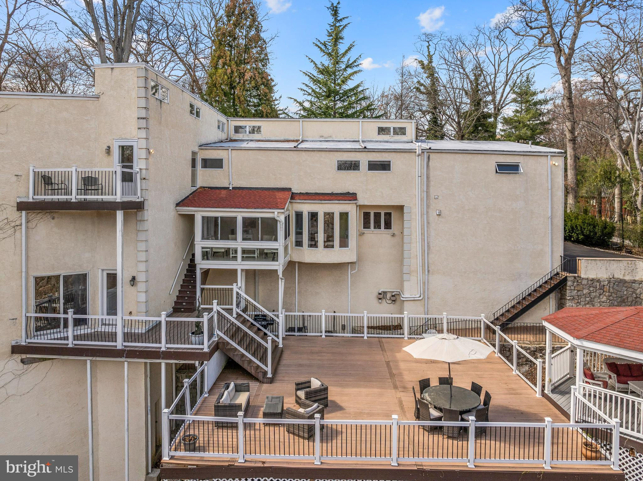 Tucked away on almost an acre at the end of a quiet cul-de-sac, this architecturally stunning custom contemporary home seamlessly blends views of nature on its interior, while the outdoor spaces create a retreat in the tree tops. Step through the double doors into a foyer adorned with imported marble tile, setting the stage for a home that exudes elegance and modern sophistication, with soaring ceilings and large windows. The recently updated gourmet kitchen features quartz countertops, a stylish backsplash, ceramic tile flooring, and high-end European Forte stainless steel appliances. The seated island accommodates four and is the perfect setting for cooking with family or entertaining. Adjacent to the kitchen, a bright and sunny breakfast area flows into a four-season room, offering a perfect space to enjoy natural light year-round. The adjacent family room creates great flow for everyday living and offers flexible living space. The heart of the home is the breathtaking two-story great room, where 30-foot ceilings and a wall of windows flood the space with natural light. A wood-burning fireplace with a floor-to-ceiling stone surround adds warmth and ambiance, making this an inviting area for relaxation and entertaining. Beyond is a living room with a bar area and access to the expansive deck. Step outside to the 1,800 sqft composite multi-level deck and pavilion, an incredible outdoor sanctuary perfect for entertaining or quiet enjoyment. A spiral staircase from the great room leads you to a versatile loft space, ideal for a private office or recreational area. On the second floor, the luxurious primary suite boasts a renovated marble-tiled bath, complete with soaking tub, frameless glass shower and double vanity, in addition to dual walk-in closets, and a private balcony. Four additional spacious bedrooms and a hall bathroom, an ensuite bedroom and bath, and a laundry room complete the upper level. The finished lower level offers even more flexible living space, including a second recreation area, a bedroom/office room , and a full bath. Located in the award-winning Lower Merion School District, this home provides easy access to major highways, 3.4 miles to Suburban square's top-tier dining and shopping, and 2.4 miles to Rolling Hill Park and recreational amenities. *Some of the photos have been virtually staged*