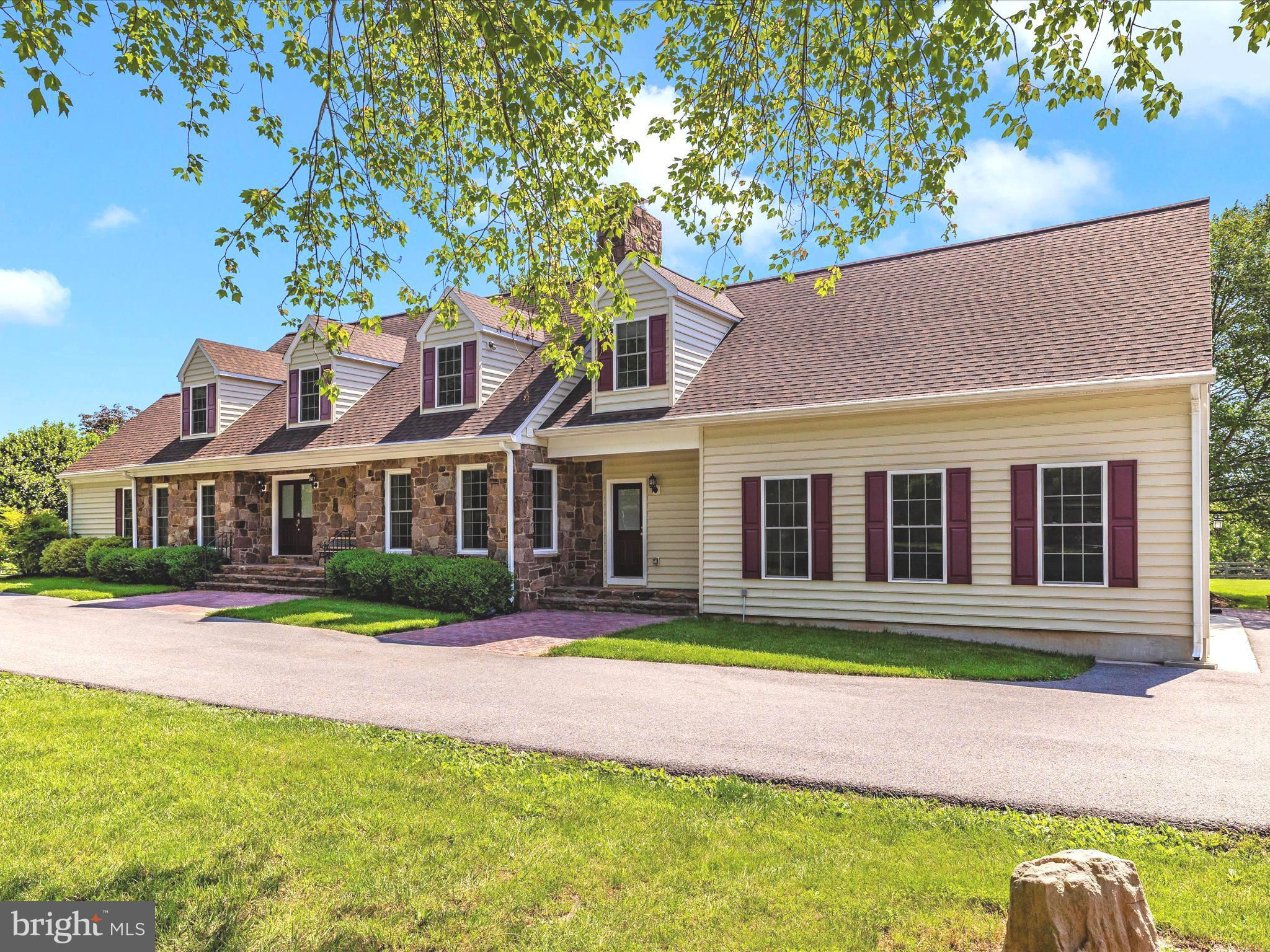 Beautiful 5200+ finished square foot cape cod style farmhouse that underwent an almost complete rebuild in 2019. So much of the home is almost new! As you enter the property on the tree lined driveway which is accented by coach lights you pass the large riding ring which is 2 rings in one! It is designed for a dressage ring and jumping course to be set up at the same time! The long ring is 230' and the short ring is 150' As you approach the home you can choose to park in the circular driveway in front of the home or in the side load extra-large 2 car garage. Enter the home through the custom solid wood and glass double doors into the large foyer with open staircase. Immediately to your left is the main level ensuite bedroom with sitting room. The current owner uses the sitting room as a wonderful office! In the past this bedroom with sitting area has been used as an in-law suite or would also make a private area for an au pair. Enjoy cooking meals in the bright gourmet kitchen while gazing out the bay window across the property. The kitchen has a bar height counter for casual dining, stainless steel appliances, granite counter tops, custom cabinets and an induction cooktop! For cozy gatherings there is a family room off the kitchen with a wood stove insert in a rustic stone wall. For larger gatherings the dining room boasts large windows with more amazing views and then company can adjourn to a large living room with a fireplace. The large deck which spans the length of the home boasts wonderful views of the farm and Dry Seneca Creek Parkland which adjoins the farm! the large deck and footprint of the main level is perfect for entertaining. On the second level of the home are 3 additional bedrooms plus a bonus room. The master bedroom has the character of a cape cod with window dormers and a large walk-in closet. There is plenty of room for the king size bed and a sitting area. Down the hall you come to the first large bedroom with plenty of closet space! Across the hall is a full bathroom. As you continue down the hall you come to the laundry room which is large enough to have it's own closet! Across from the laundry room there is bonus room which could be a nursery, office, homework room, workout room or whatever suits your needs! At the end of the hall is another large bedroom with it's own full bathroom and walk in closet. There also is a second staircase at the end of the hallway which leads directly to the mud room and a second exterior door. The lower level was just completed and boasts tile floors, recessed lights, a media area, large gathering space, a wet bar and a full bathroom! For the equine enthusiasts there is a 4 stall run-in style barn with a HUGE tack room. Three board fencing divides the property into 4 pastures. No need to trailer your horses to find trails, ride off your property for hours on the EPIC Trails! The barn and pastures are currently leased on a month-to-month basis. If the new owner wishes, the boarder is happy to stay and continue to maintain the equine aspects of the property. The solar panels generate most of the power needed for the entire farm! The roof and heat pump are only 4 years old! Oil heat furnace is one year old!!!!