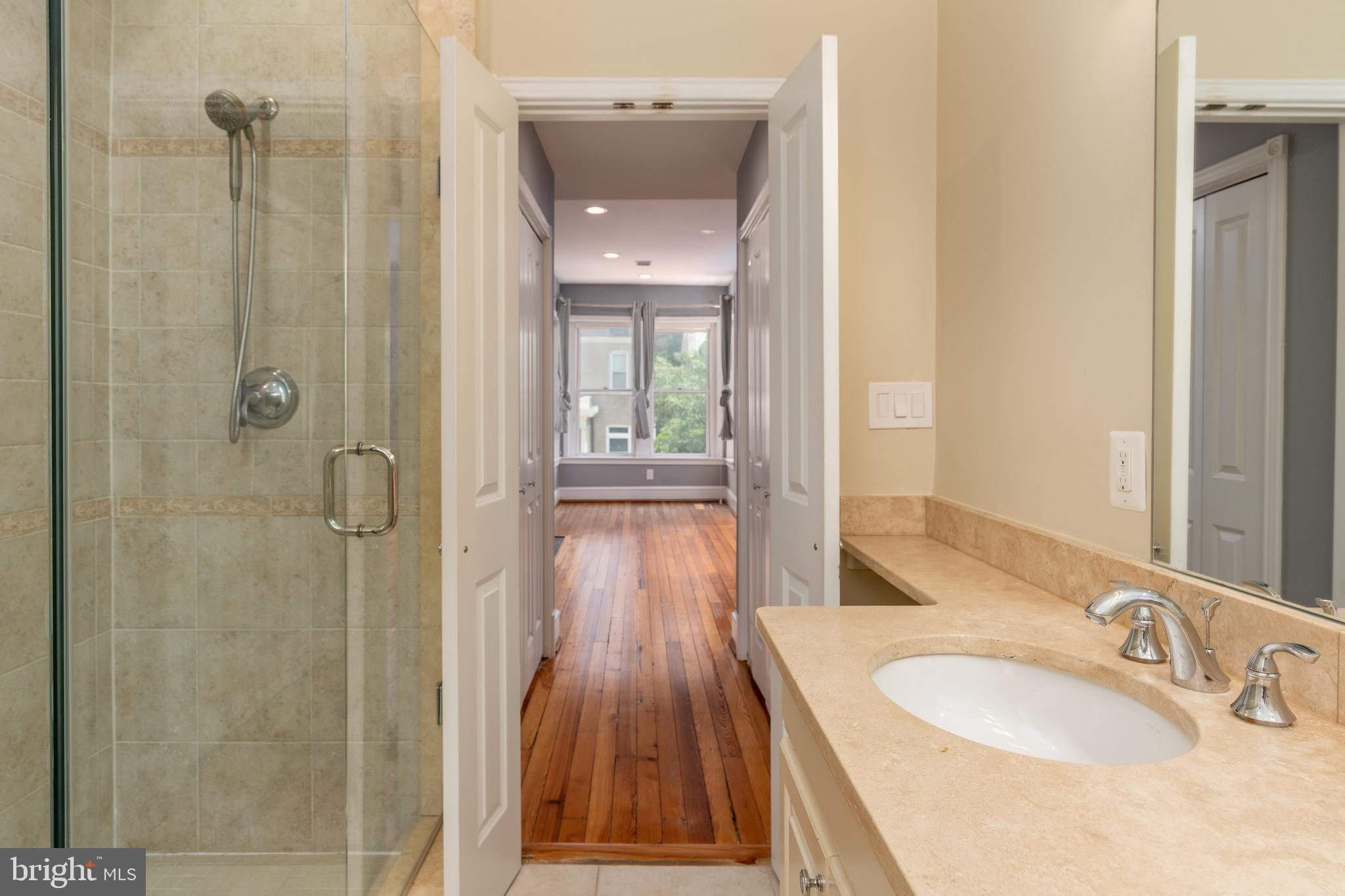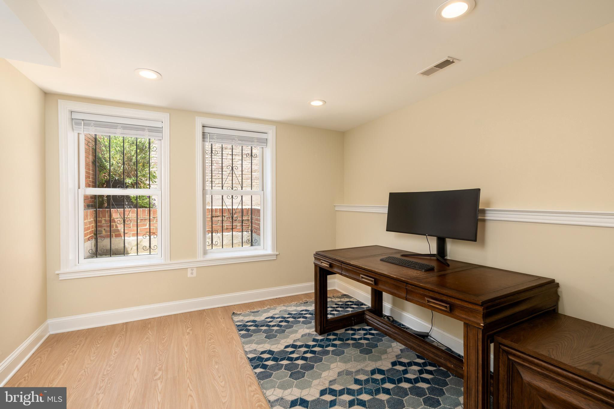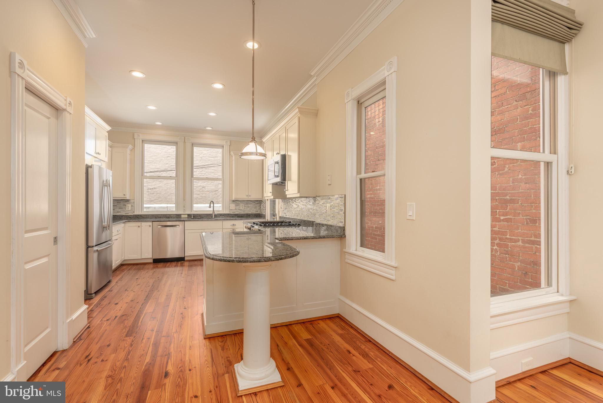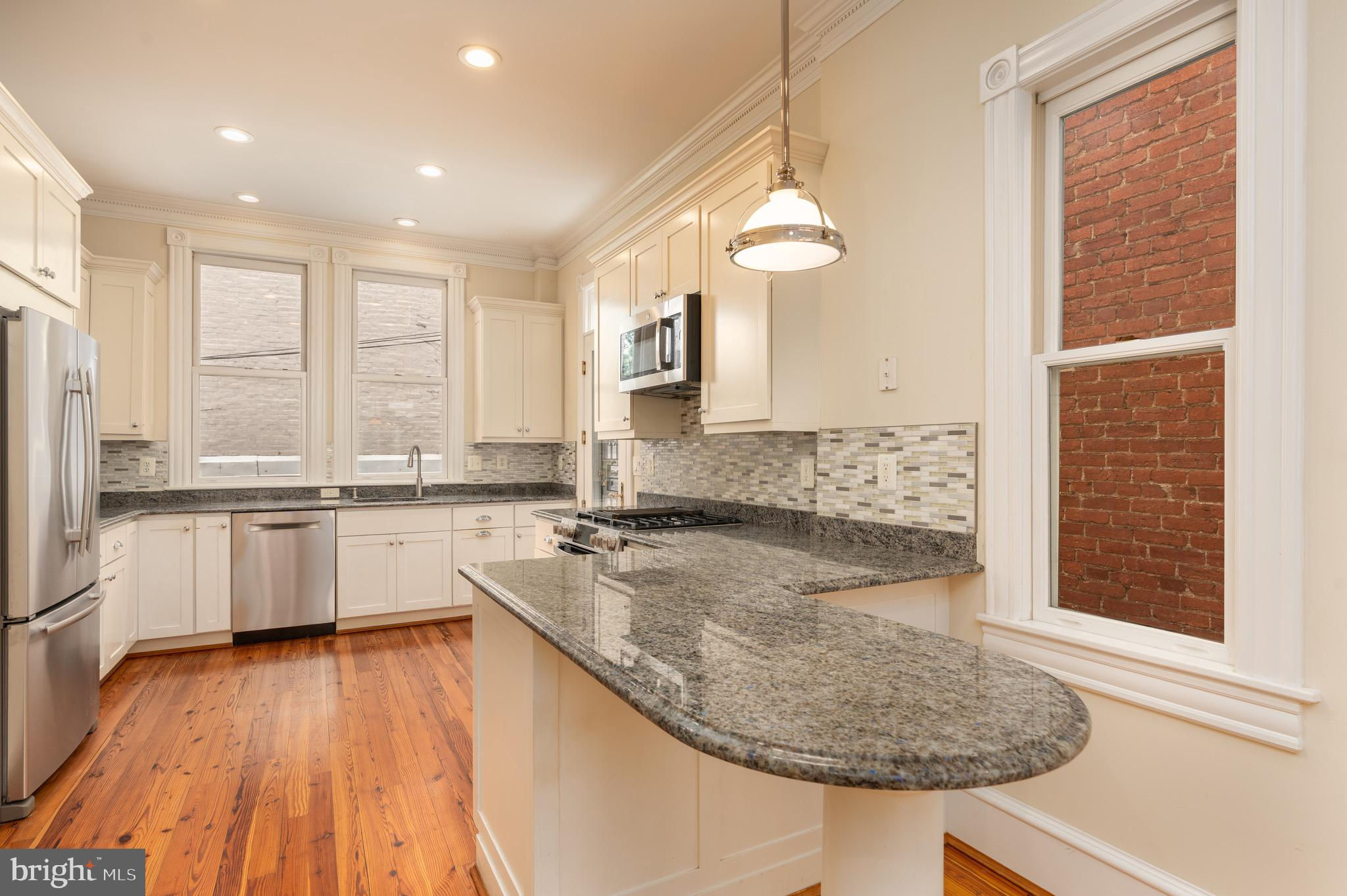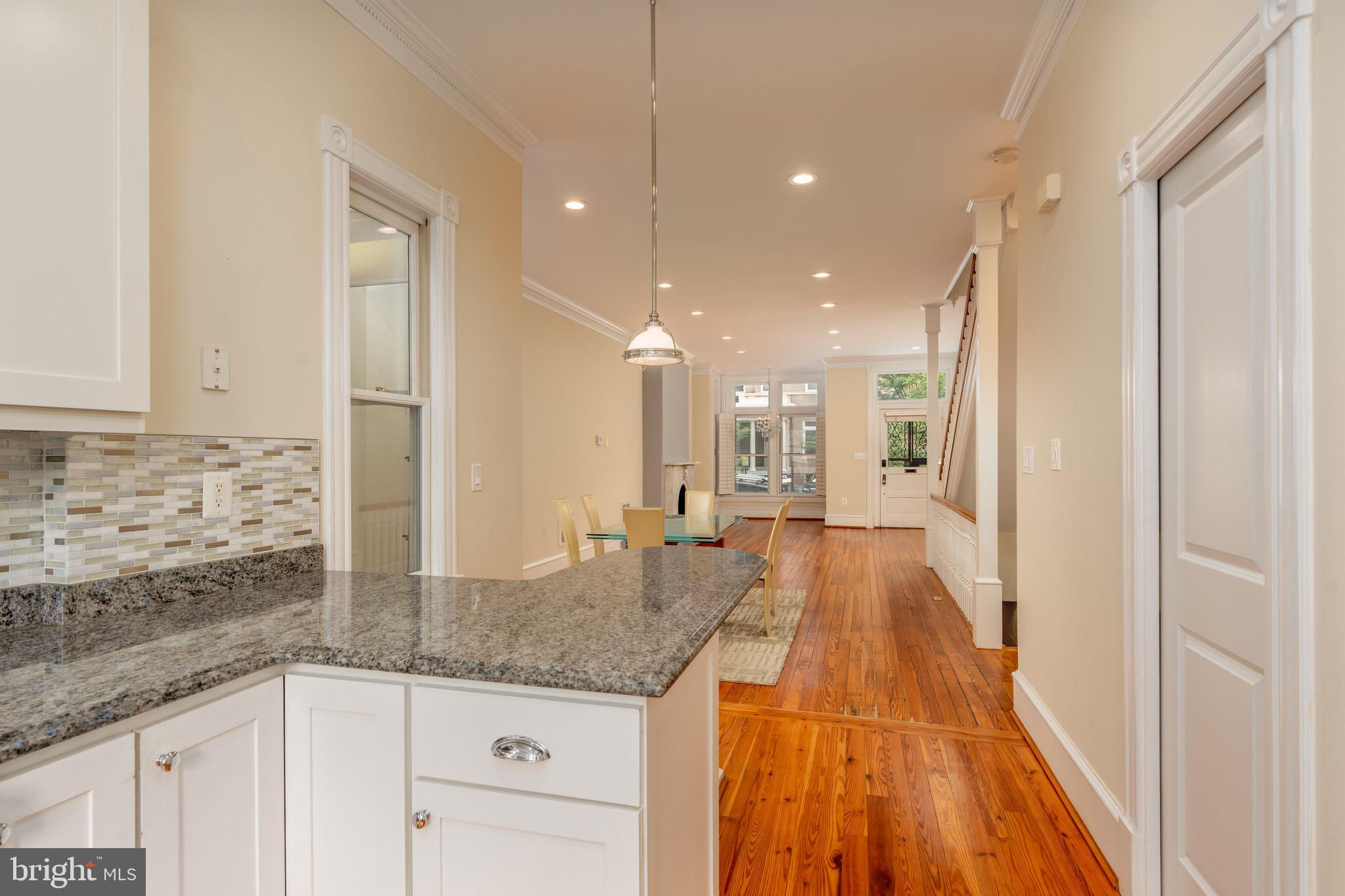Set on a quiet, tree-lined block in Kalorama, this elegant 5-bedroom, 4.5-bath bayfront townhouse sits among embassies and grand historic residences. Spanning 3,000+ square feet across four impeccably finished levels, it pairs timeless architecture with modern polish. Originally built in the early 1900s and comprehensively reimagined in 2006 by noted builder Ethan Landis, the home showcases soaring ceilings, oversized windows, rich millwork, and refined moldings. Updated systems integrate seamlessly with its historic character for effortless everyday living. The gracious main level unfolds with a sun-filled living room, dining area, and an eat-in chef’s kitchen with custom cabinetry and premium appliances, opening directly to a private rear patio—perfect for morning coffee or evening entertaining. A convenient powder room serves this floor. The second level hosts a tranquil primary suite with generous closet space and a marble bath featuring dual vanities and a glass-enclosed walk-in shower. A second bedroom and hall bath complete the level. The top floor offers two additional bedrooms, a shared bath, and access to both a front-facing balcony and an expansive private rooftop terrace. The fully finished lower level includes a self-contained one-bedroom suite with full kitchen, bath, and separate entrance—ideal for guests, staff, or extended stays. Rich in architectural detail yet thoroughly updated for contemporary living, 1716 22d Street NW delivers refined, turn-key comfort just moments from Dupont Circle, the Spanish Steps, Embassy Row, and Rock Creek Park. A home without compromise.