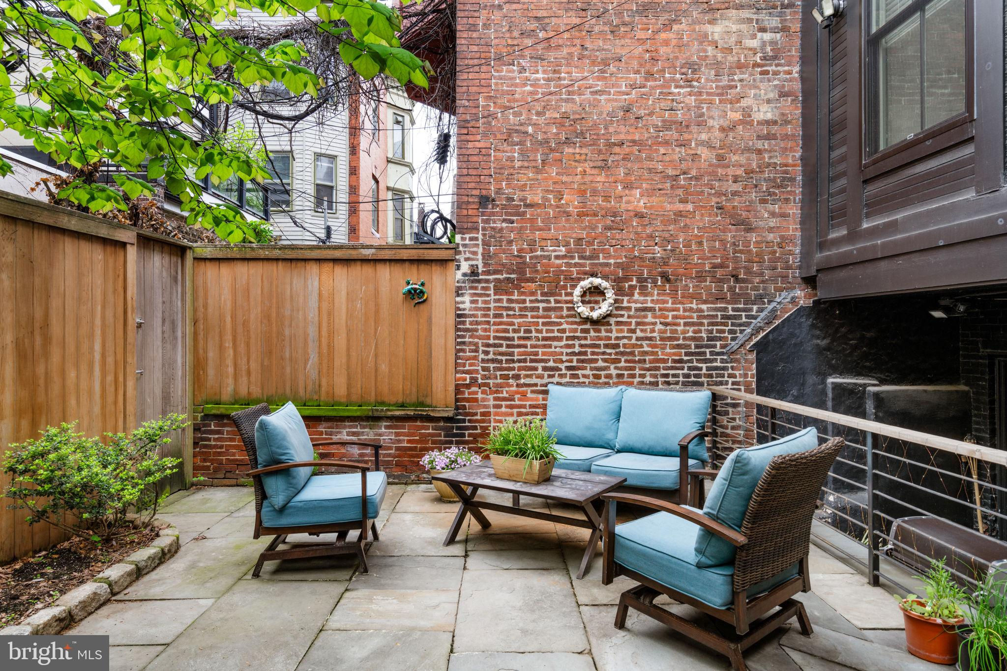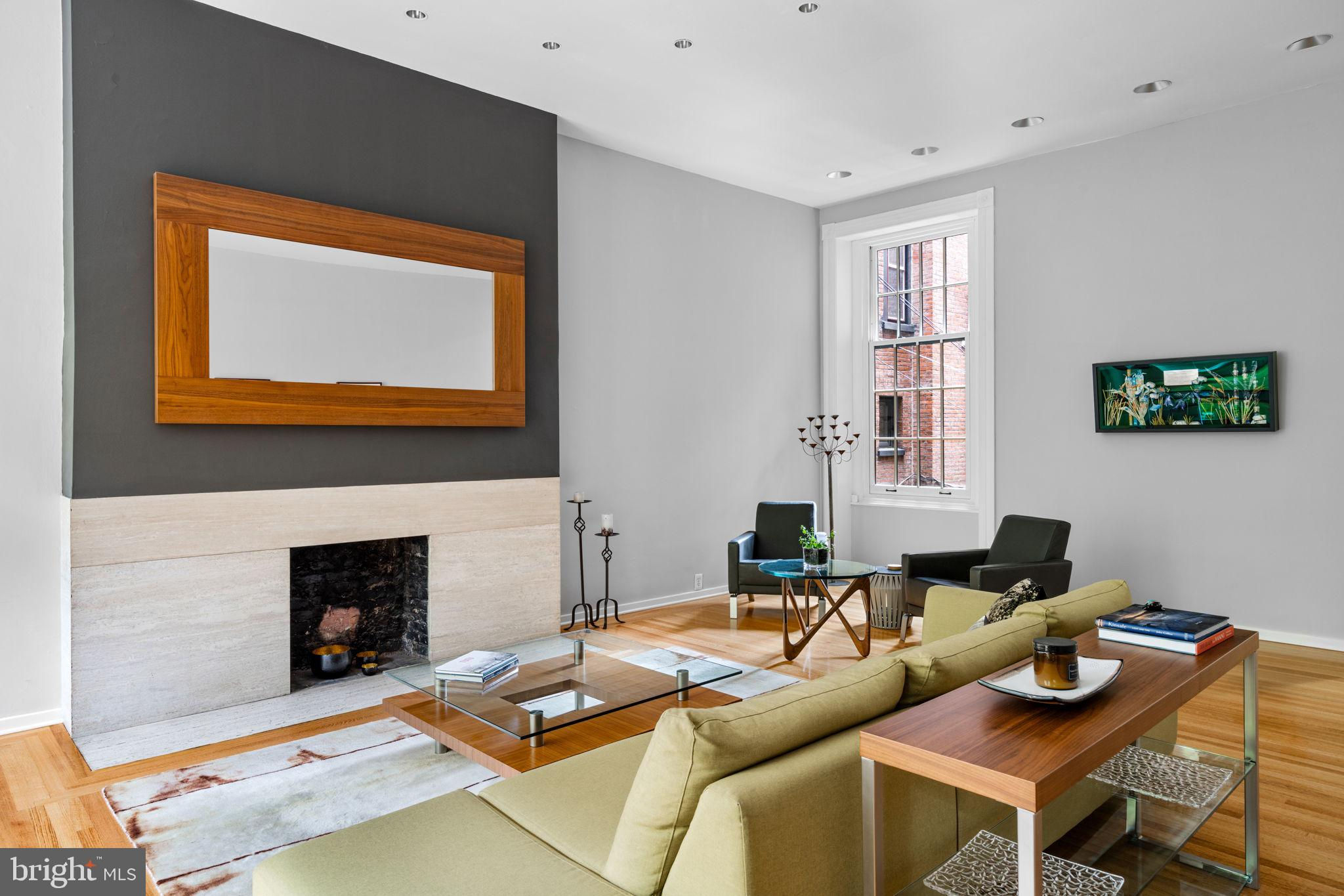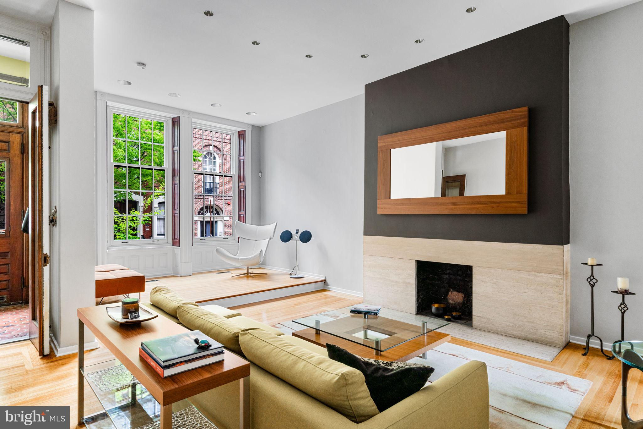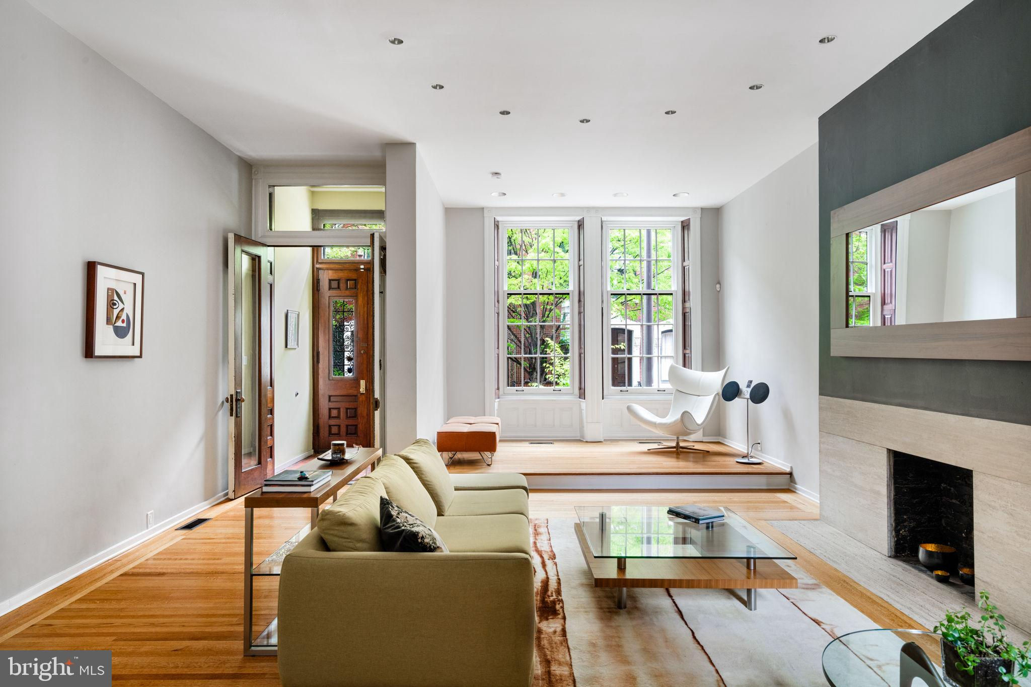 Seller is including one year of prepaid parking with an acceptable offer. Welcome to 2128 Spruce Street in Fitler Square! This stately 5-bedroom townhouse sits 20 ft wide on a 105 ft lot with high ceilings, hardwood flooring, and original details throughout. Enter through the vestibule into a spacious and light-filled living room with 12 ft ceilings and a sleek contemporary fireplace. Just off of the living area is a tucked-away powder room & 2 large coat closets. The eat-in kitchen is also on the main level and features a large chef's island with butcher block countertops, maple cabinets with stainless steel counters, and stainless appliances. The dining area is open to the kitchen with a wood-burning stove and overlooks the spacious back terrace with a south-facing garden. A charming center staircase takes you up to the next level of this home which is equally as grand with a handsome library in the rear that features a fireplace and beautiful built-in bookshelves, a full modern bathroom with a shower and pedestal sink that has access from the hall as well as the library. The front of the 2nd level is the primary suite with an elegant bedroom with 3 large windows overlooking Spruce Street, a fireplace, built-ins and features an en-suite dressing room with a walk-in closet, and contemporary bathroom with a seamless glass shower, soaking tub, mosaic tile flooring and an oversized single vanity sink. Two additional guest rooms with a hall bathroom plus a home office and a large laundry room are all on the 3rd level with an additional 2 bedrooms and a hall-accessed vintage bathroom on the 4th level. The lower level of this home is on the garden level with a full studio that has direct access to the back terrace. This space is perfect for a home gym, guest suite, artist studio, rec room, or play space. The other part of the lower level is ample storage and mechanicals. Located in the Greenfield School catchment, this property is situated between Fitler Square Park and Rittenhouse Square with easy access to the Schuylkill River park and trails, 30th Street Station, Penn, CHOP, and Drexel, and nearby neighborhood favorite restaurants and retail.
