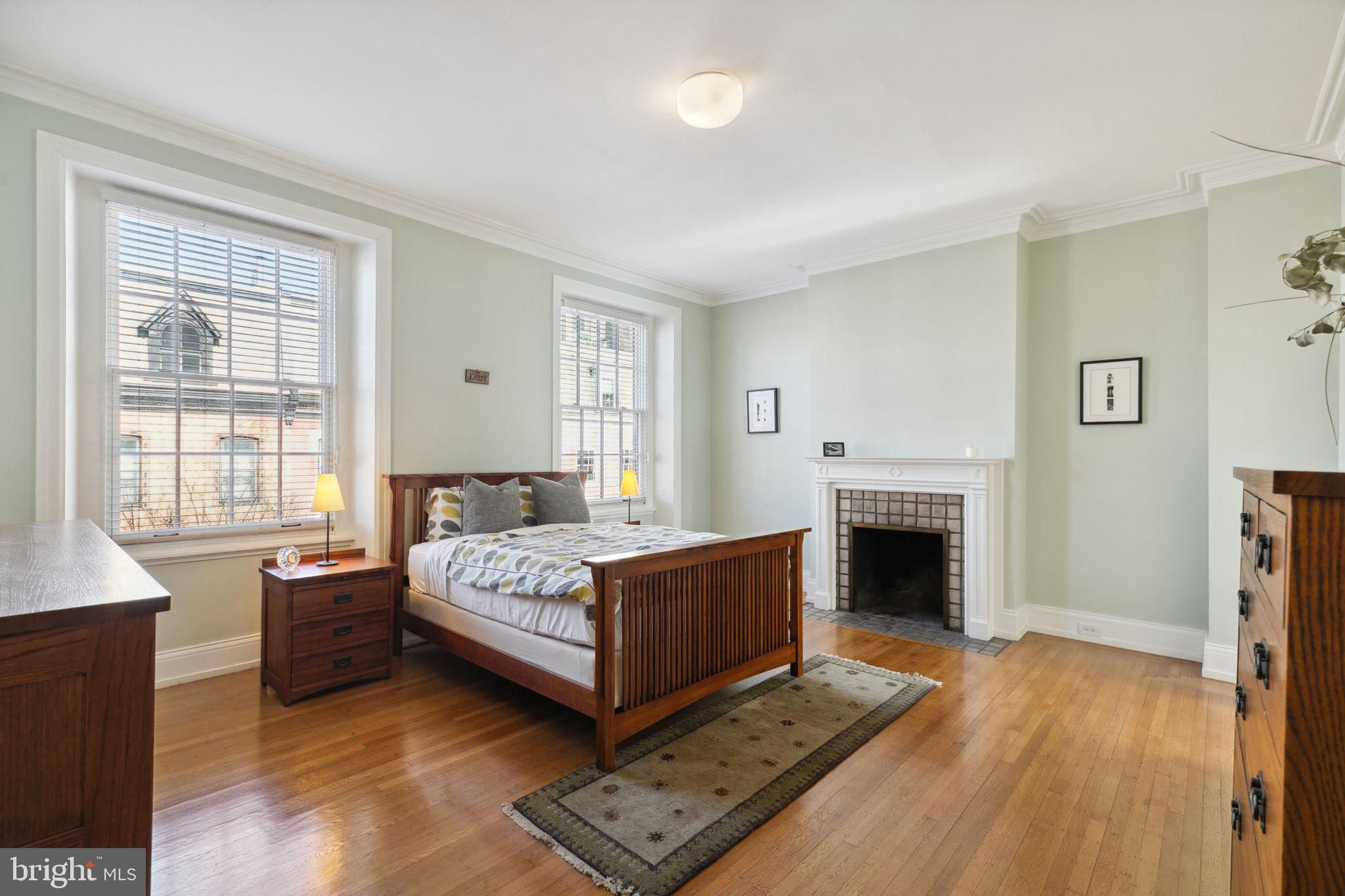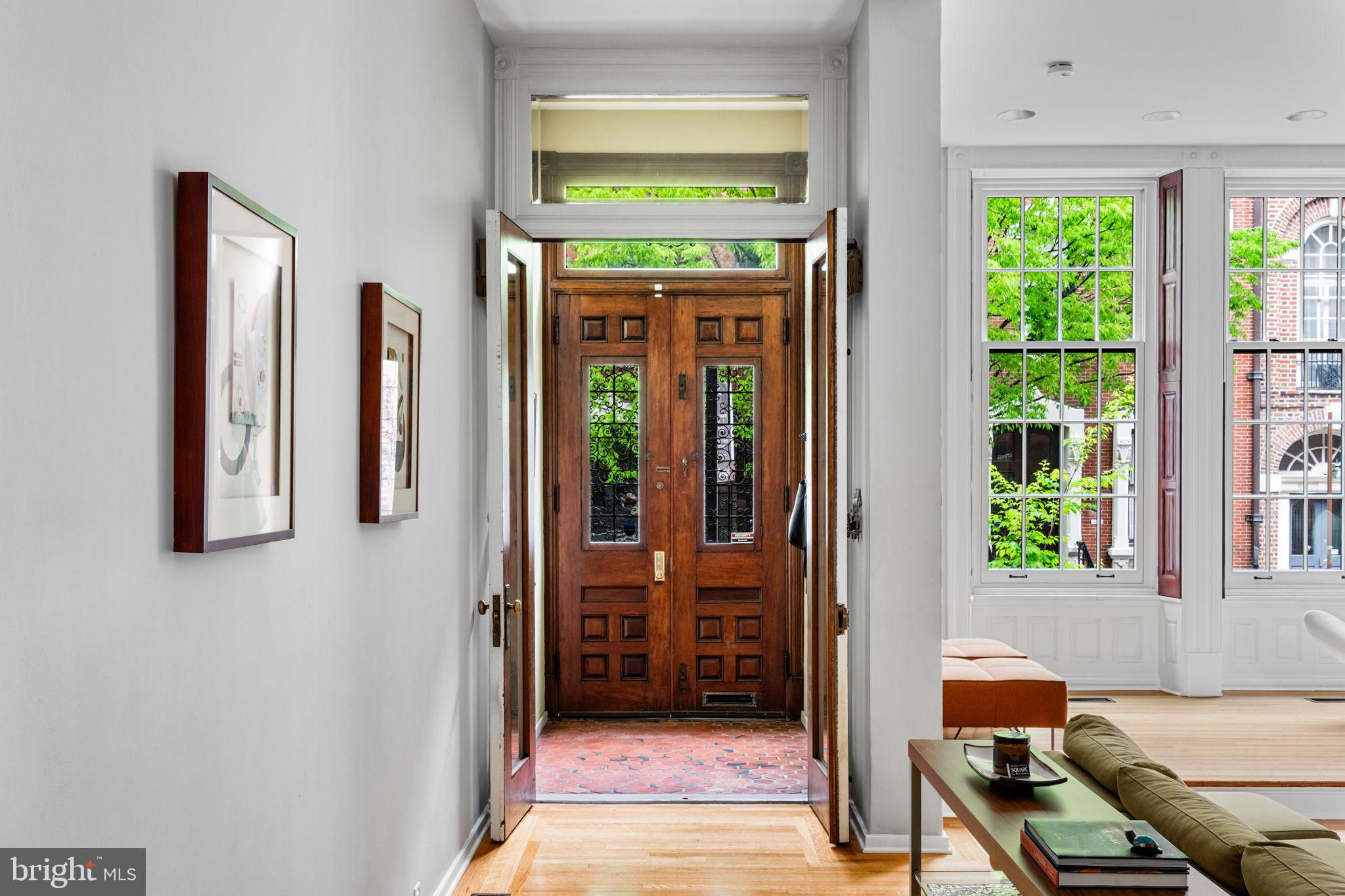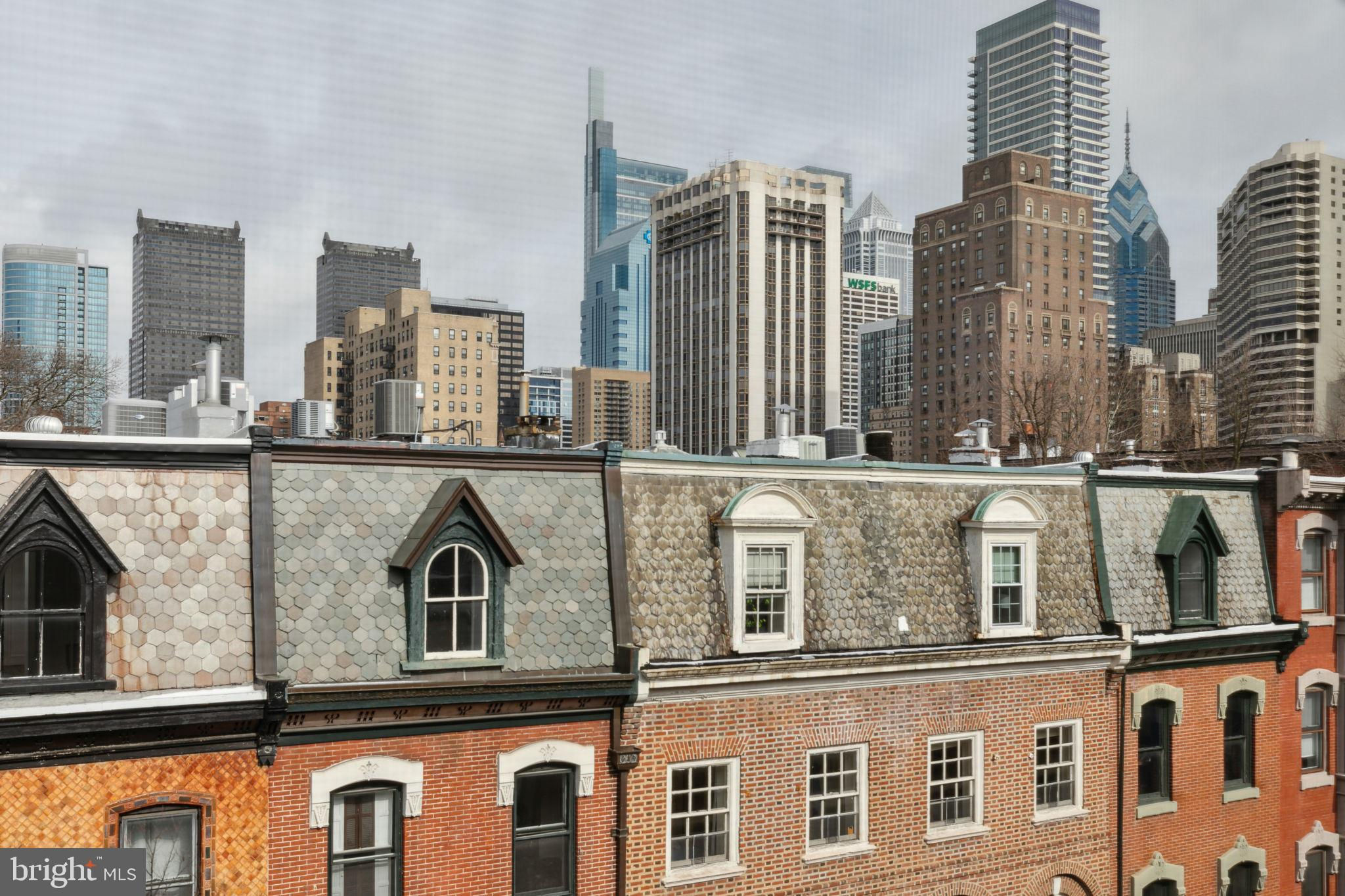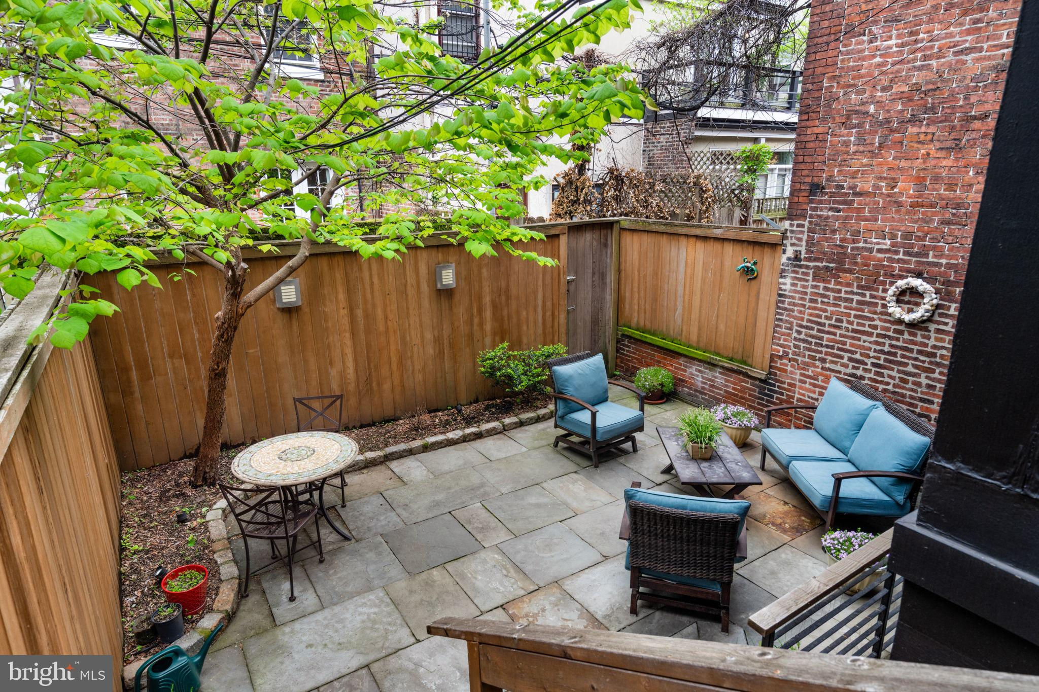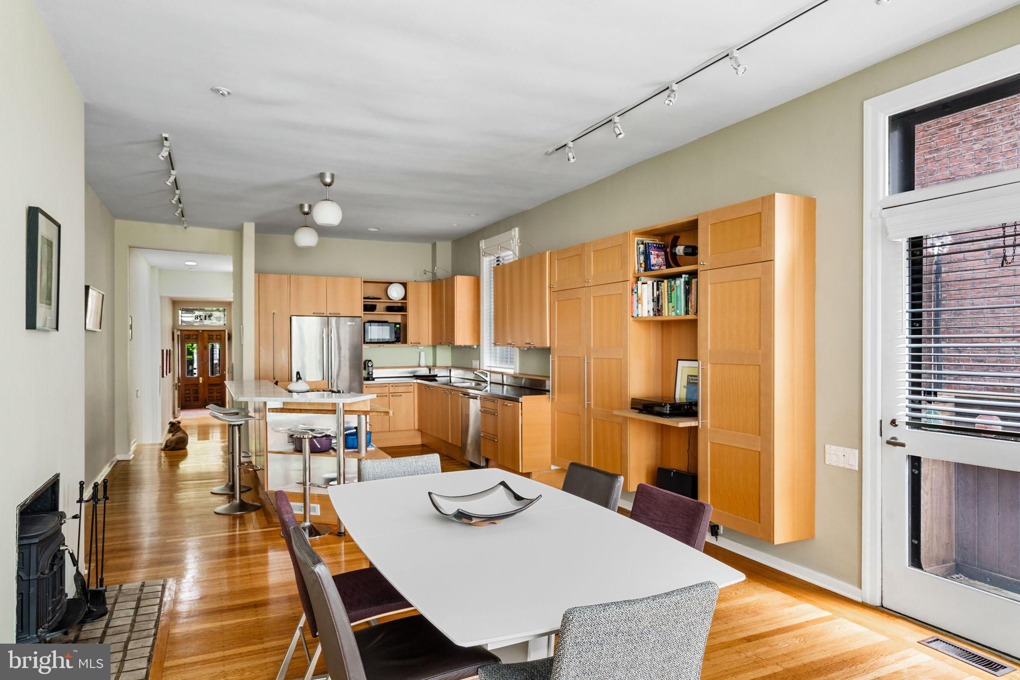 Seller is including one year of prepaid parking with an acceptable offer. Welcome to 2128 Spruce Street in Fitler Square! This stately 5-bedroom townhouse sits 20 ft wide on a 105 ft lot with high ceilings, hardwood flooring, and original details throughout. Enter through the vestibule into a spacious and light-filled living room with 12 ft ceilings and a sleek contemporary fireplace. Just off of the living area is a tucked-away powder room & 2 large coat closets. The eat-in kitchen is also on the main level and features a large chef's island with butcher block countertops, maple cabinets with stainless steel counters, and stainless appliances. The dining area is open to the kitchen with a wood-burning stove and overlooks the spacious back terrace with a south-facing garden. A charming center staircase takes you up to the next level of this home which is equally as grand with a handsome library in the rear that features a fireplace and beautiful built-in bookshelves, a full modern bathroom with a shower and pedestal sink that has access from the hall as well as the library. The front of the 2nd level is the primary suite with an elegant bedroom with 3 large windows overlooking Spruce Street, a fireplace, built-ins and features an en-suite dressing room with a walk-in closet, and contemporary bathroom with a seamless glass shower, soaking tub, mosaic tile flooring and an oversized single vanity sink. Two additional guest rooms with a hall bathroom plus a home office and a large laundry room are all on the 3rd level with an additional 2 bedrooms and a hall-accessed vintage bathroom on the 4th level. The lower level of this home is on the garden level with a full studio that has direct access to the back terrace. This space is perfect for a home gym, guest suite, artist studio, rec room, or play space. The other part of the lower level is ample storage and mechanicals. Located in the Greenfield School catchment, this property is situated between Fitler Square Park and Rittenhouse Square with easy access to the Schuylkill River park and trails, 30th Street Station, Penn, CHOP, and Drexel, and nearby neighborhood favorite restaurants and retail.