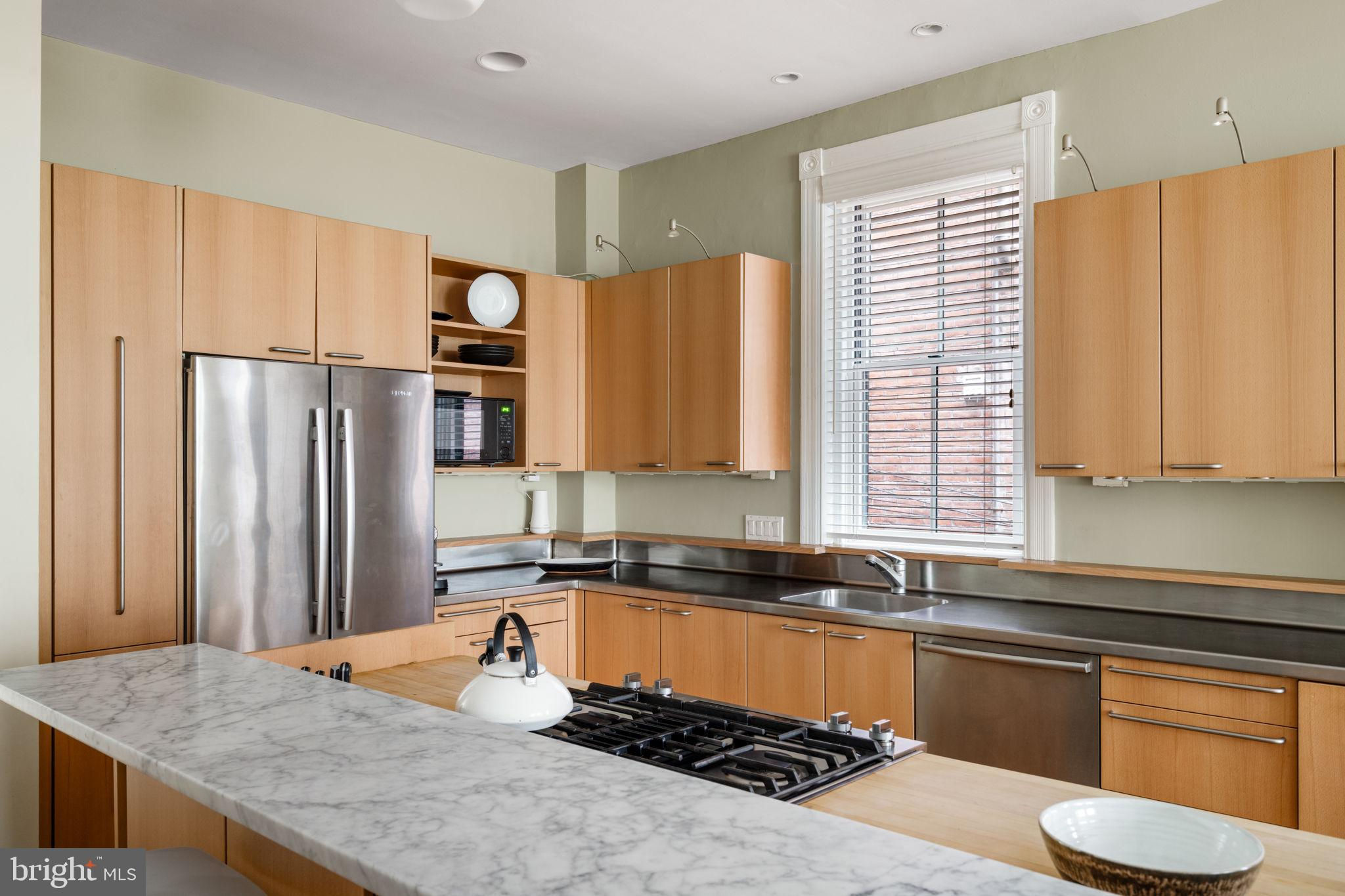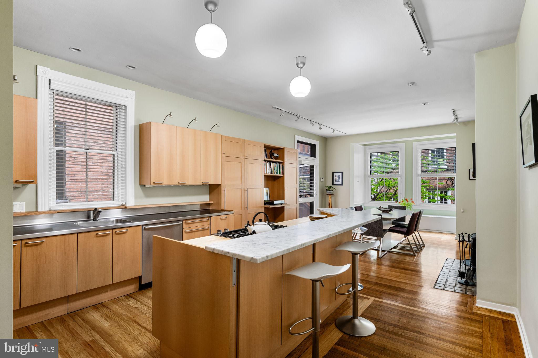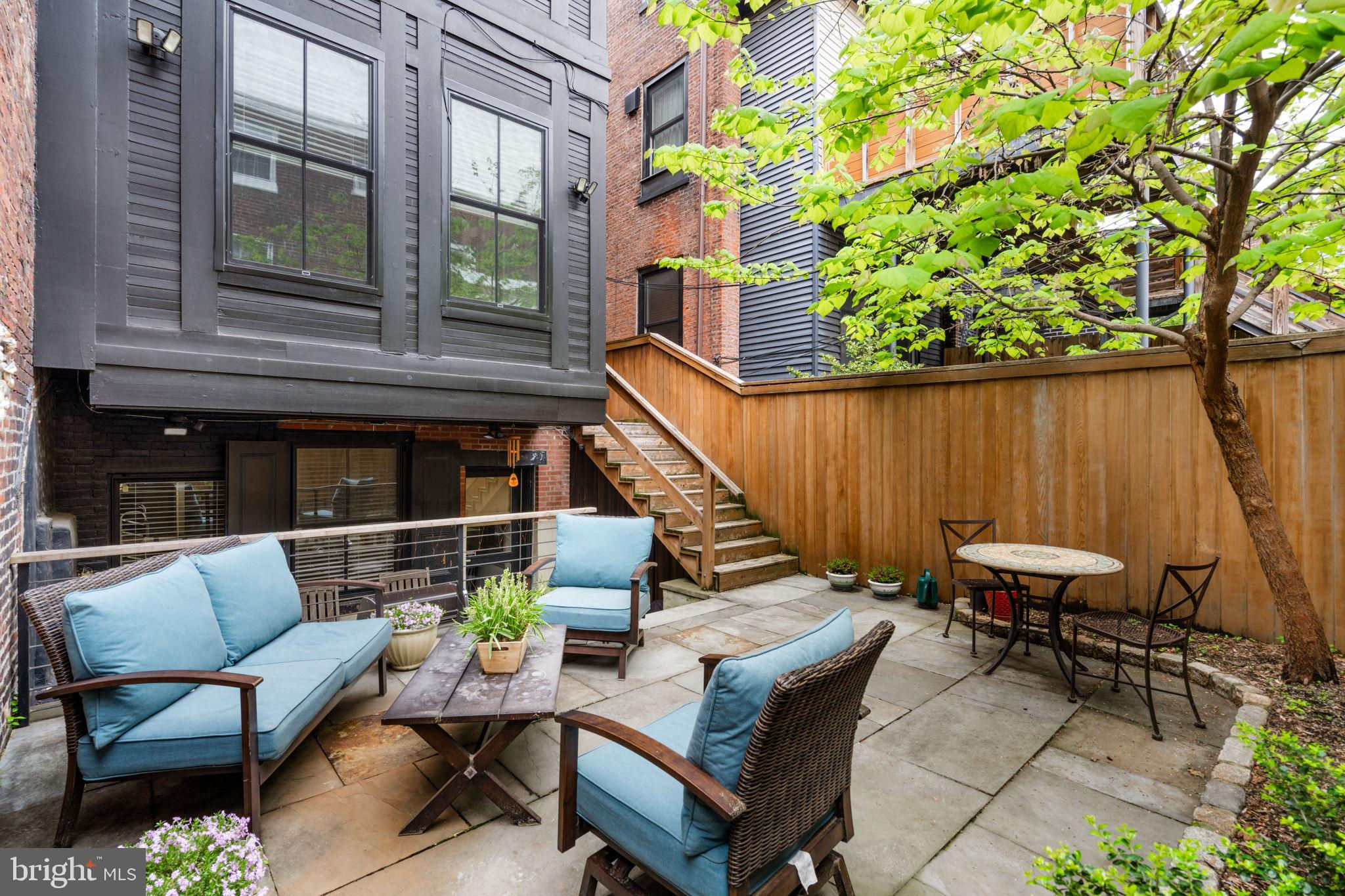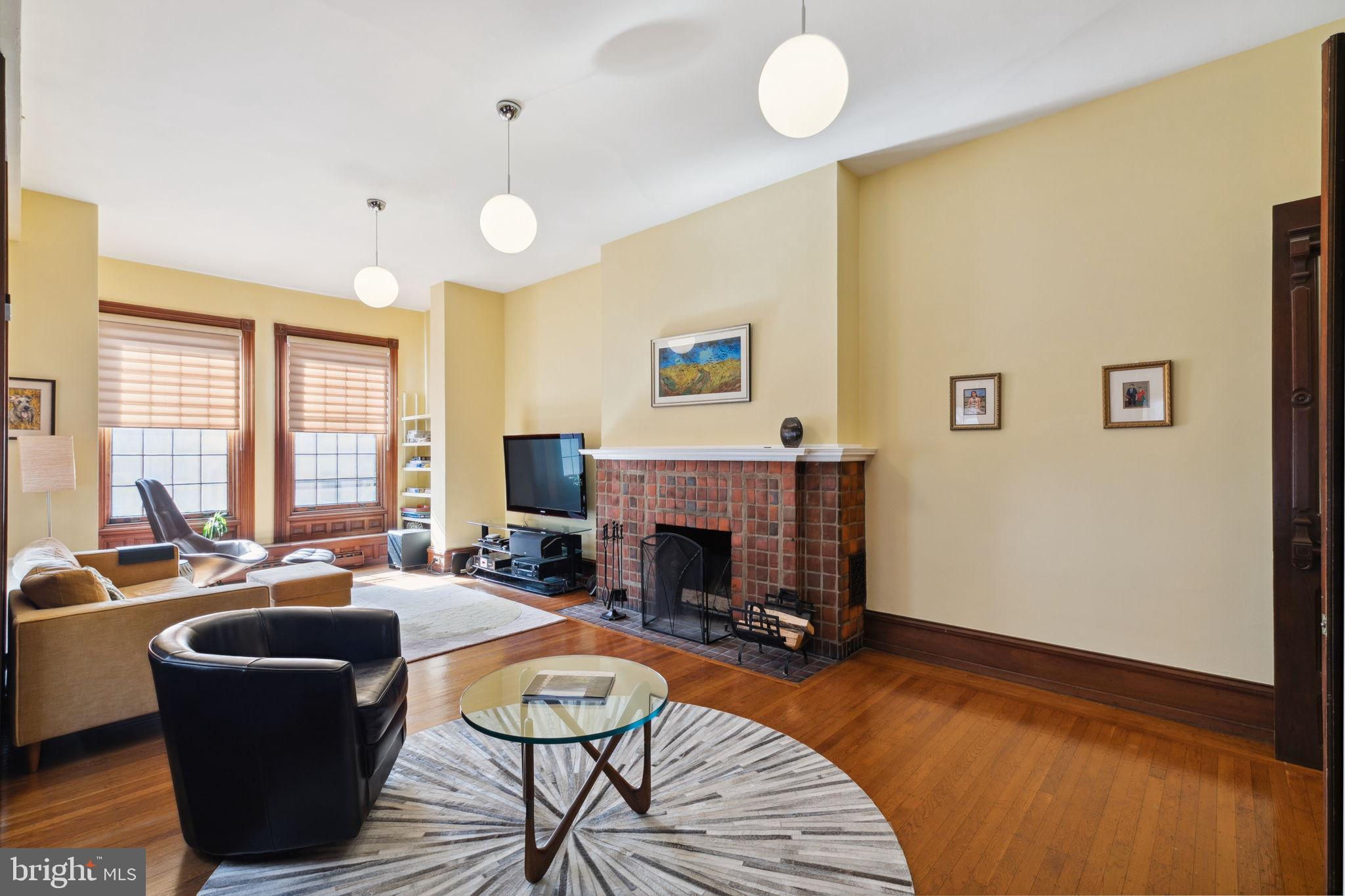 Seller is including one year of prepaid parking with an acceptable offer. Welcome to 2128 Spruce Street in Fitler Square! This stately 5-bedroom townhouse sits 20 ft wide on a 105 ft lot with high ceilings, hardwood flooring, and original details throughout. Enter through the vestibule into a spacious and light-filled living room with 12 ft ceilings and a sleek contemporary fireplace. Just off of the living area is a tucked-away powder room & 2 large coat closets. The eat-in kitchen is also on the main level and features a large chef's island with butcher block countertops, maple cabinets with stainless steel counters, and stainless appliances. The dining area is open to the kitchen with a wood-burning stove and overlooks the spacious back terrace with a south-facing garden. A charming center staircase takes you up to the next level of this home which is equally as grand with a handsome library in the rear that features a fireplace and beautiful built-in bookshelves, a full modern bathroom with a shower and pedestal sink that has access from the hall as well as the library. The front of the 2nd level is the primary suite with an elegant bedroom with 3 large windows overlooking Spruce Street, a fireplace, built-ins and features an en-suite dressing room with a walk-in closet, and contemporary bathroom with a seamless glass shower, soaking tub, mosaic tile flooring and an oversized single vanity sink. Two additional guest rooms with a hall bathroom plus a home office and a large laundry room are all on the 3rd level with an additional 2 bedrooms and a hall-accessed vintage bathroom on the 4th level. The lower level of this home is on the garden level with a full studio that has direct access to the back terrace. This space is perfect for a home gym, guest suite, artist studio, rec room, or play space. The other part of the lower level is ample storage and mechanicals. Located in the Greenfield School catchment, this property is situated between Fitler Square Park and Rittenhouse Square with easy access to the Schuylkill River park and trails, 30th Street Station, Penn, CHOP, and Drexel, and nearby neighborhood favorite restaurants and retail.