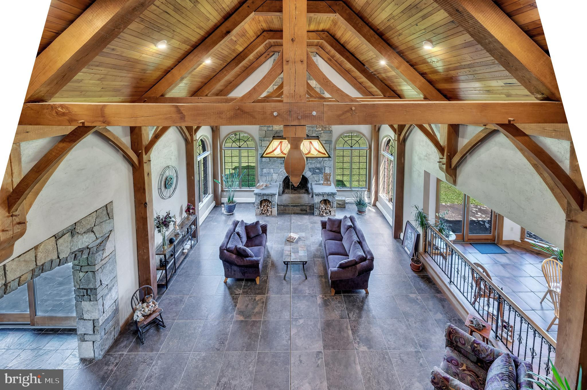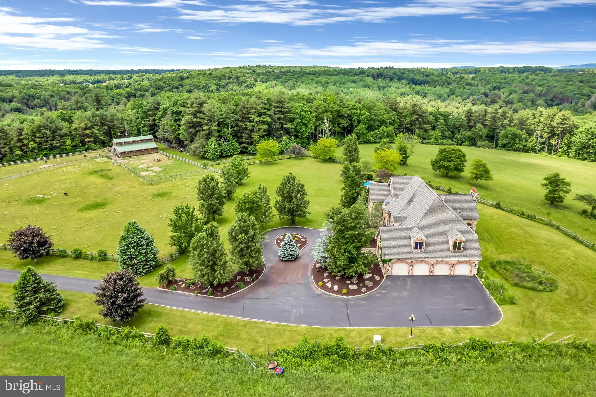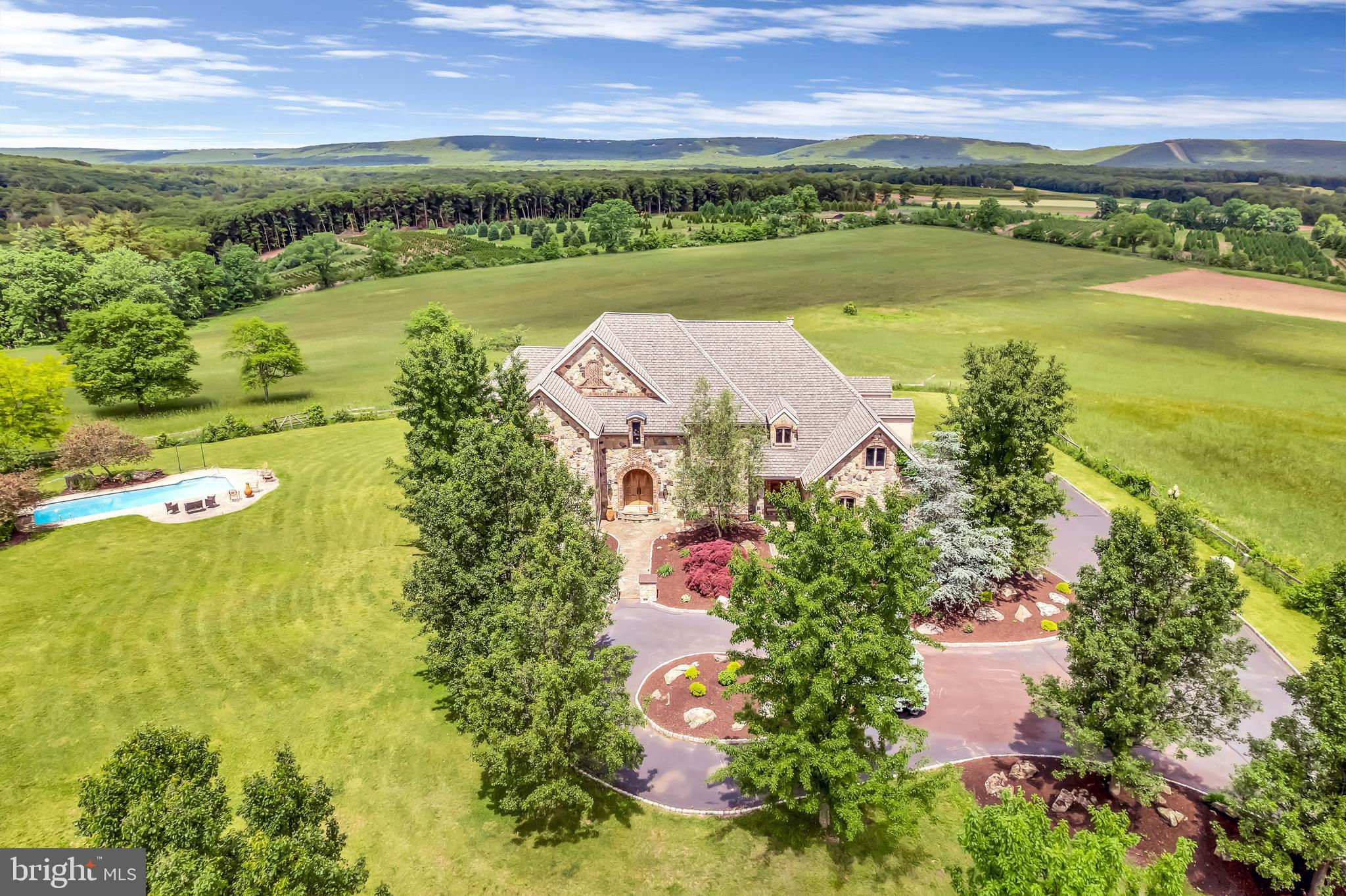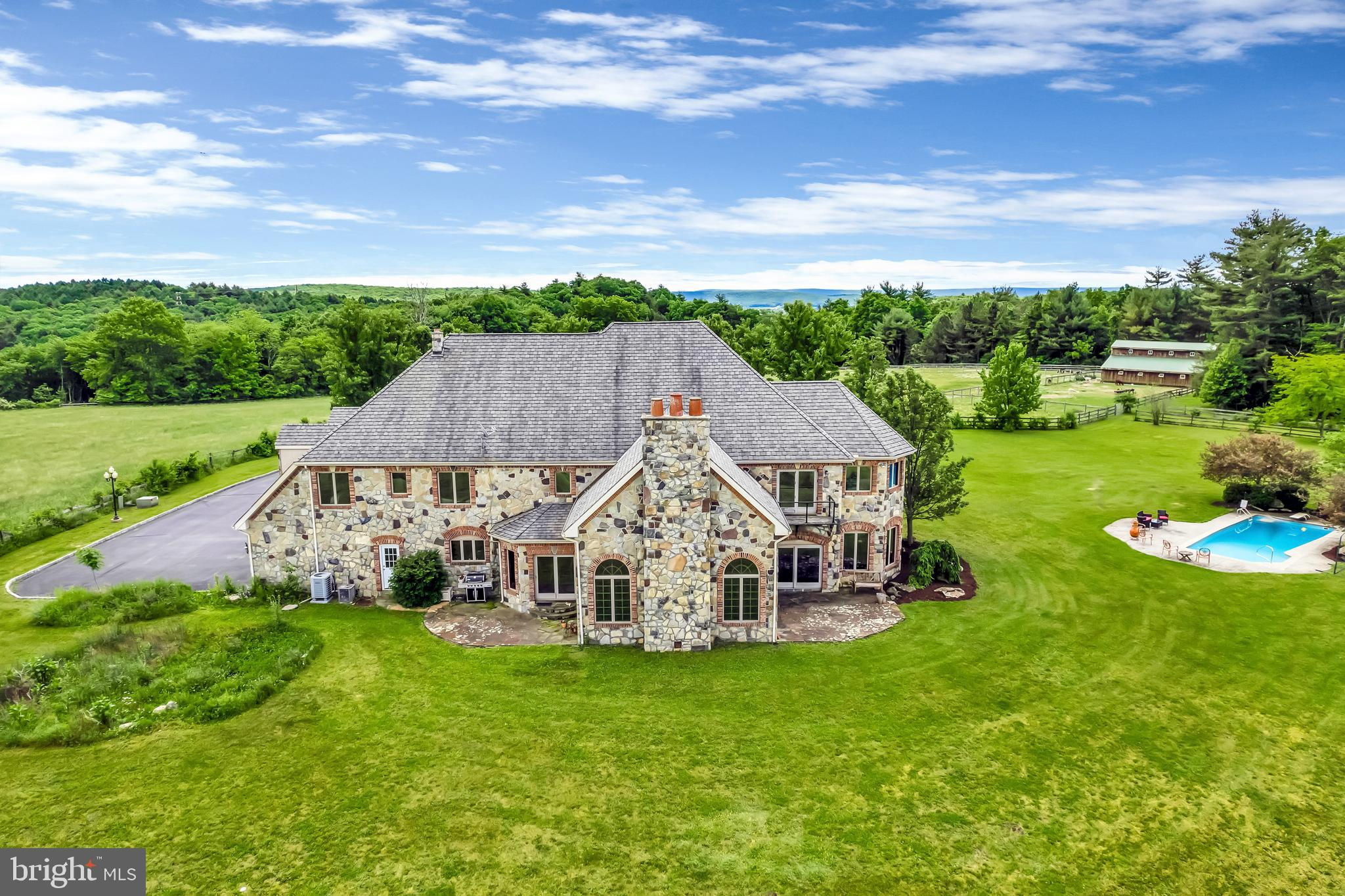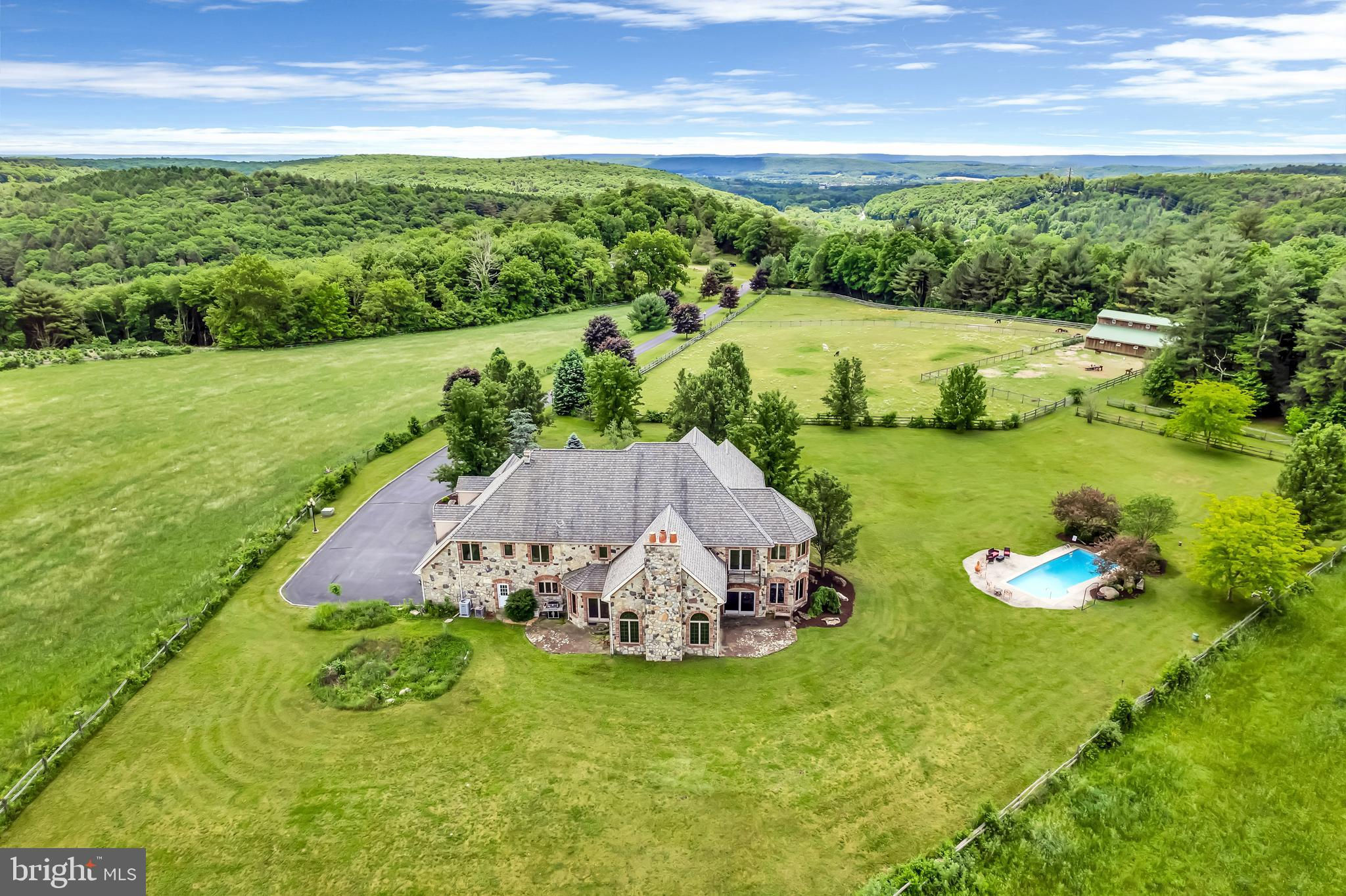 A legendary estate where paradise is found in the Poconos version of Big Sky country. An opportunity to establish a family legacy property on this uncommonly large piece of awe-inspiring land (72+ acres) with unrivaled views & a masterfully crafted home. Welcome to the recently created B&B, Chestnuthill Countryside Manor, also home to Pohopoco Creek Alpacas. Tranquility abounds in the very secluded yet convenient setting with grocery shopping under 4 miles away, 45 mins to Lehigh Valley airport, 11 miles to St Lukes hospital, under 2 hrs to NYC & Philly. A 2400’ paved driveway leads to a 6400’ French-inspired stone estate with 5 bedrooms, 3 ½ bathrooms, 4 car garage, in-ground pool & 6 stall barn. A private setting with stunning views seen from just about every window. An impressive entry with massive double French doors sets the stage for the magnificence of this home. The foyer is spacious and has a spiral wooden staircase with wrought iron banisters. It opens to a dramatic great-room with timber rafters complementing a soaring tongue & groove ceiling. A 2-story stone fireplace flanked by built-in stone log huts, porcelain tiled floors & arched windows complete this large room. Adjacent is a unique polygon room with a rustic log & plaster wet-bar cleverly incorporated into this perfect entertainment space. A near-by half bath is decorated with a beautiful painted mural & nice fixtures. Radiant heat Terracotta tile floors, granite counter tops, tile backsplashes & a walk-in pantry are some of the features of the gourmet custom kitchen. It’s equipped with a Viking stove, double ovens & a Subzero refrigerator. The formal dining room has a kitchen & foyer entry. French doors open from the foyer into a spacious sunken office w/ handsome custom wood paneling & a decorative mosaic design in the middle of the tiled floor. Craftsmanship & character continue to the upper level with an elongated loft enhanced by wood & wrought-iron banisters. Another vantage point of the great-room & raftered ceiling had to be the goal of this design. The master bedroom suite enjoys privacy being at one end of the corridor. It has an abundance of windows, a balcony, 2 large walk-in closets & luxurious bathroom with a radiant heat floor . Located at the other end are 4 spacious bedrooms which are serving as guestrooms for the B&B. 2 Jack & Jill bathrooms create a semi-private bathroom for guests. The laundry room is conveniently located on this floor. A 2nd staircase leads back down to a hall with a separate entrance. The barn has 6 box stalls with upper bars as dividers so horses can socialize & a sizable loft for hay storage. Aisleway & wash/grooming area. Attached is a dry-lot that opens to larger pastures. A small building has been converted to a cute boutique that sells Alpaca fleece products. There is a run-in shed in a small paddock. A large pole building can be used for equipment storage, cars, supplies or tools. A creek runs through the lower portion of the property. An older barn used for storage is located near the road by the driveway entrance. One of the finest views & settings I’ve encountered in all my years of brokerage. Eagles can be seen flying to their nest in the woods. This is a very special property. Continue on with the B&B, expand to a vineyard, a horse breeding or training farm or simply enjoy as a second home oasis. Seller is an inactive real estate broker - license is in escrow.