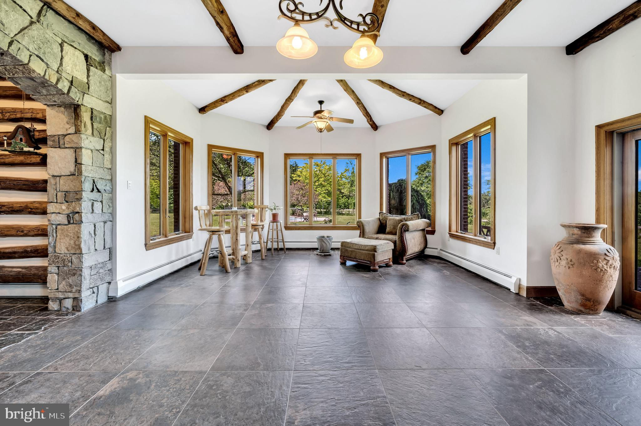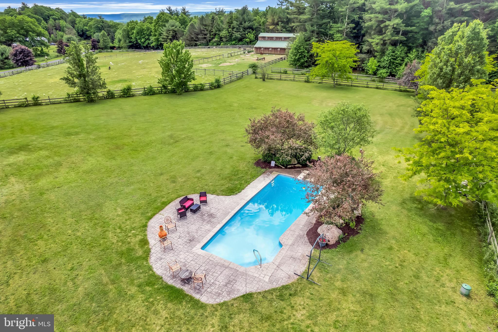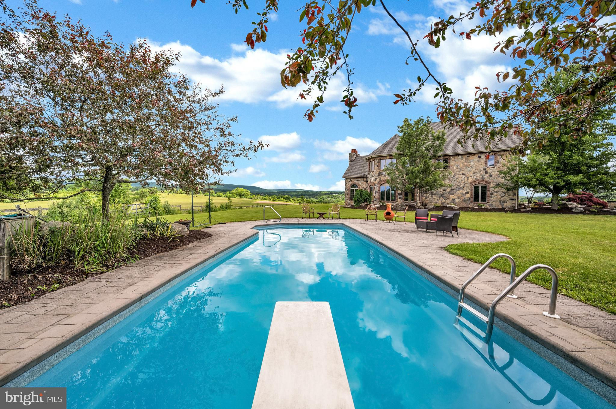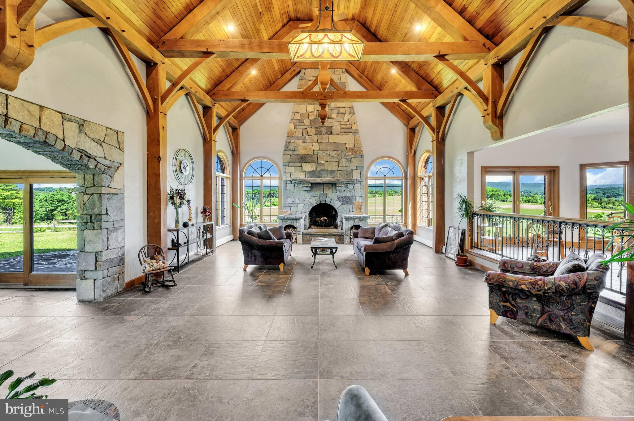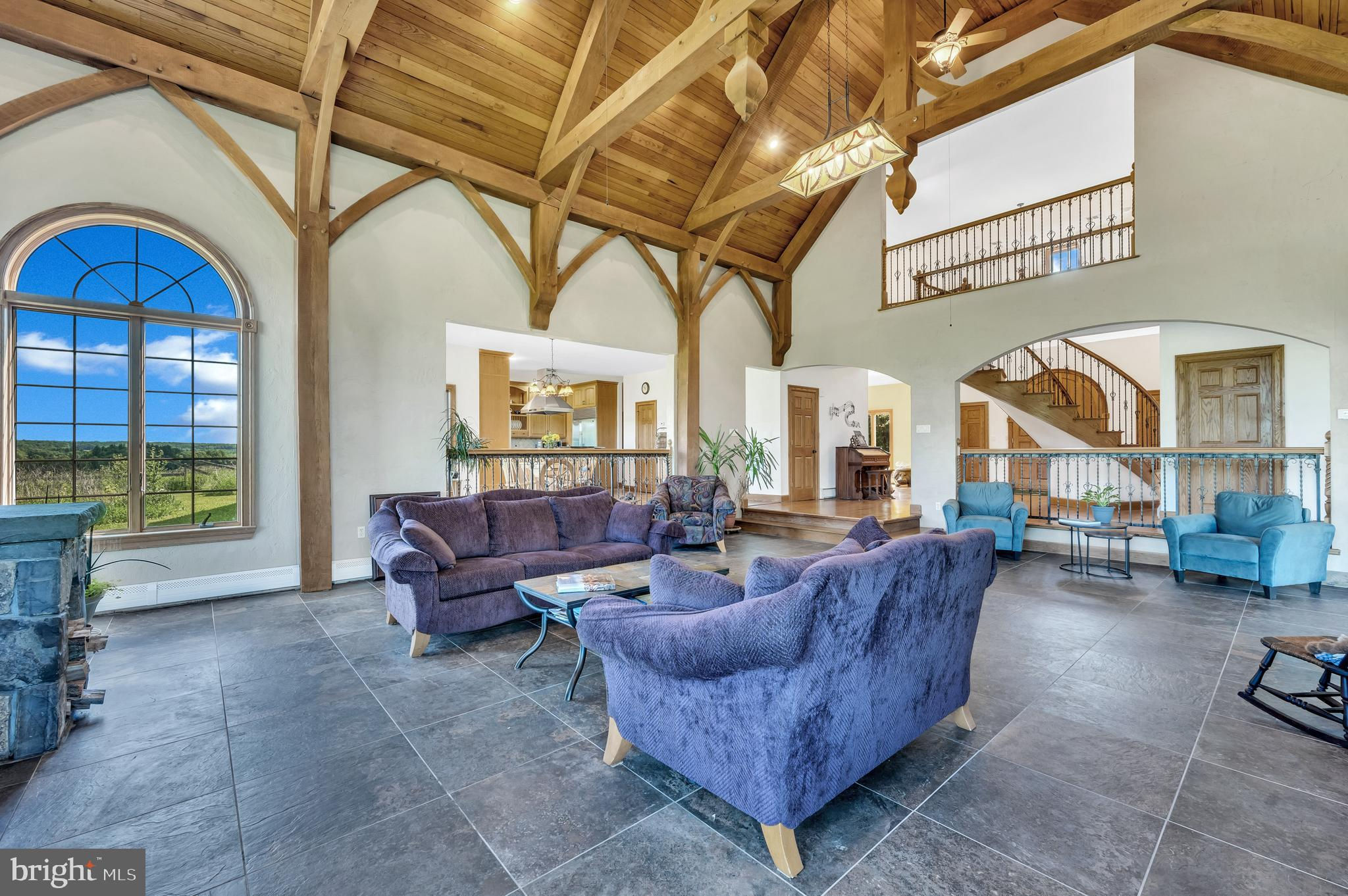 A legendary estate where paradise is found in the Poconos version of Big Sky country. An opportunity to establish a family legacy property on this uncommonly large piece of awe-inspiring land (72+ acres) with unrivaled views & a masterfully crafted home. Welcome to the recently created B&B, Chestnuthill Countryside Manor, also home to Pohopoco Creek Alpacas. Tranquility abounds in the very secluded yet convenient setting with grocery shopping under 4 miles away, 45 mins to Lehigh Valley airport, 11 miles to St Lukes hospital, under 2 hrs to NYC & Philly. A 2400’ paved driveway leads to a 6400’ French-inspired stone estate with 5 bedrooms, 3 ½ bathrooms, 4 car garage, in-ground pool & 6 stall barn. A private setting with stunning views seen from just about every window. An impressive entry with massive double French doors sets the stage for the magnificence of this home. The foyer is spacious and has a spiral wooden staircase with wrought iron banisters. It opens to a dramatic great-room with timber rafters complementing a soaring tongue & groove ceiling. A 2-story stone fireplace flanked by built-in stone log huts, porcelain tiled floors & arched windows complete this large room. Adjacent is a unique polygon room with a rustic log & plaster wet-bar cleverly incorporated into this perfect entertainment space. A near-by half bath is decorated with a beautiful painted mural & nice fixtures. Radiant heat Terracotta tile floors, granite counter tops, tile backsplashes & a walk-in pantry are some of the features of the gourmet custom kitchen. It’s equipped with a Viking stove, double ovens & a Subzero refrigerator. The formal dining room has a kitchen & foyer entry. French doors open from the foyer into a spacious sunken office w/ handsome custom wood paneling & a decorative mosaic design in the middle of the tiled floor. Craftsmanship & character continue to the upper level with an elongated loft enhanced by wood & wrought-iron banisters. Another vantage point of the great-room & raftered ceiling had to be the goal of this design. The master bedroom suite enjoys privacy being at one end of the corridor. It has an abundance of windows, a balcony, 2 large walk-in closets & luxurious bathroom with a radiant heat floor . Located at the other end are 4 spacious bedrooms which are serving as guestrooms for the B&B. 2 Jack & Jill bathrooms create a semi-private bathroom for guests. The laundry room is conveniently located on this floor. A 2nd staircase leads back down to a hall with a separate entrance. The barn has 6 box stalls with upper bars as dividers so horses can socialize & a sizable loft for hay storage. Aisleway & wash/grooming area. Attached is a dry-lot that opens to larger pastures. A small building has been converted to a cute boutique that sells Alpaca fleece products. There is a run-in shed in a small paddock. A large pole building can be used for equipment storage, cars, supplies or tools. A creek runs through the lower portion of the property. An older barn used for storage is located near the road by the driveway entrance. One of the finest views & settings I’ve encountered in all my years of brokerage. Eagles can be seen flying to their nest in the woods. This is a very special property. Continue on with the B&B, expand to a vineyard, a horse breeding or training farm or simply enjoy as a second home oasis. Seller is an inactive real estate broker - license is in escrow.