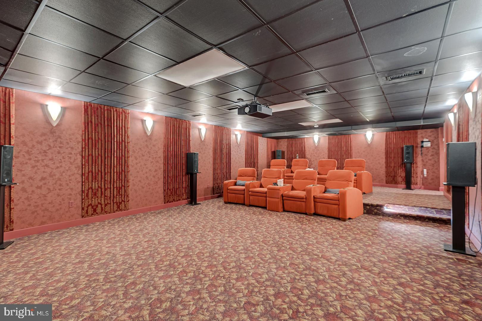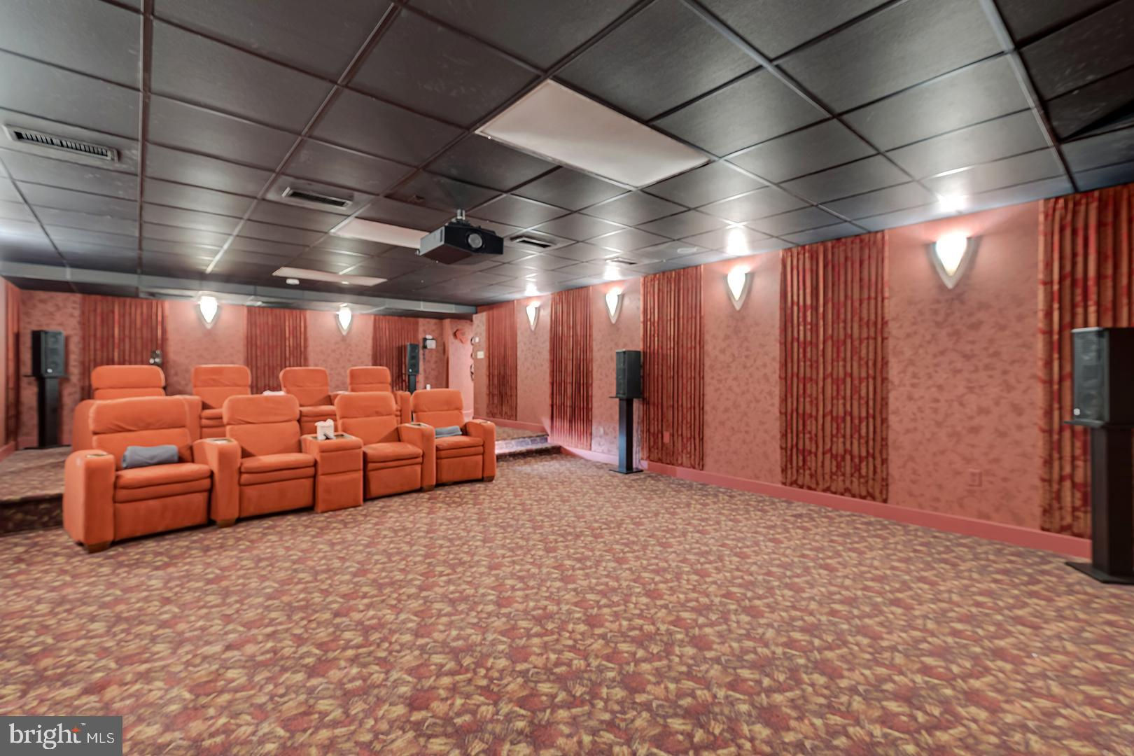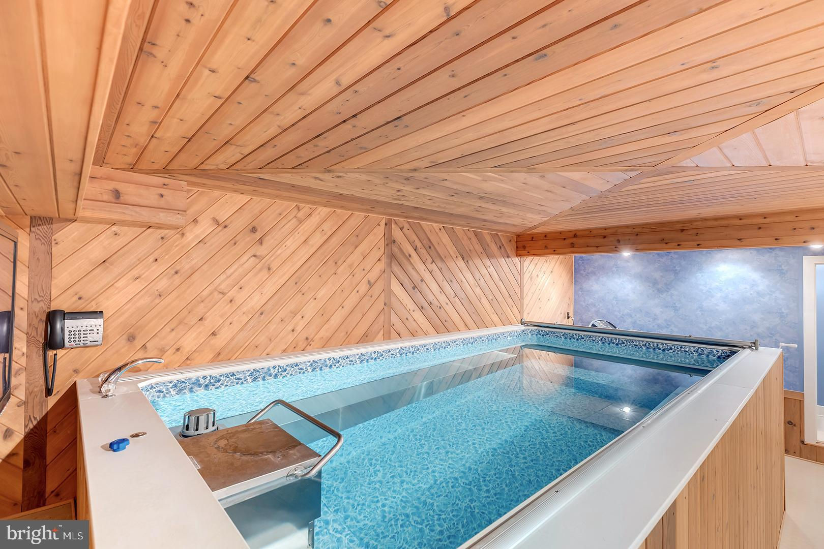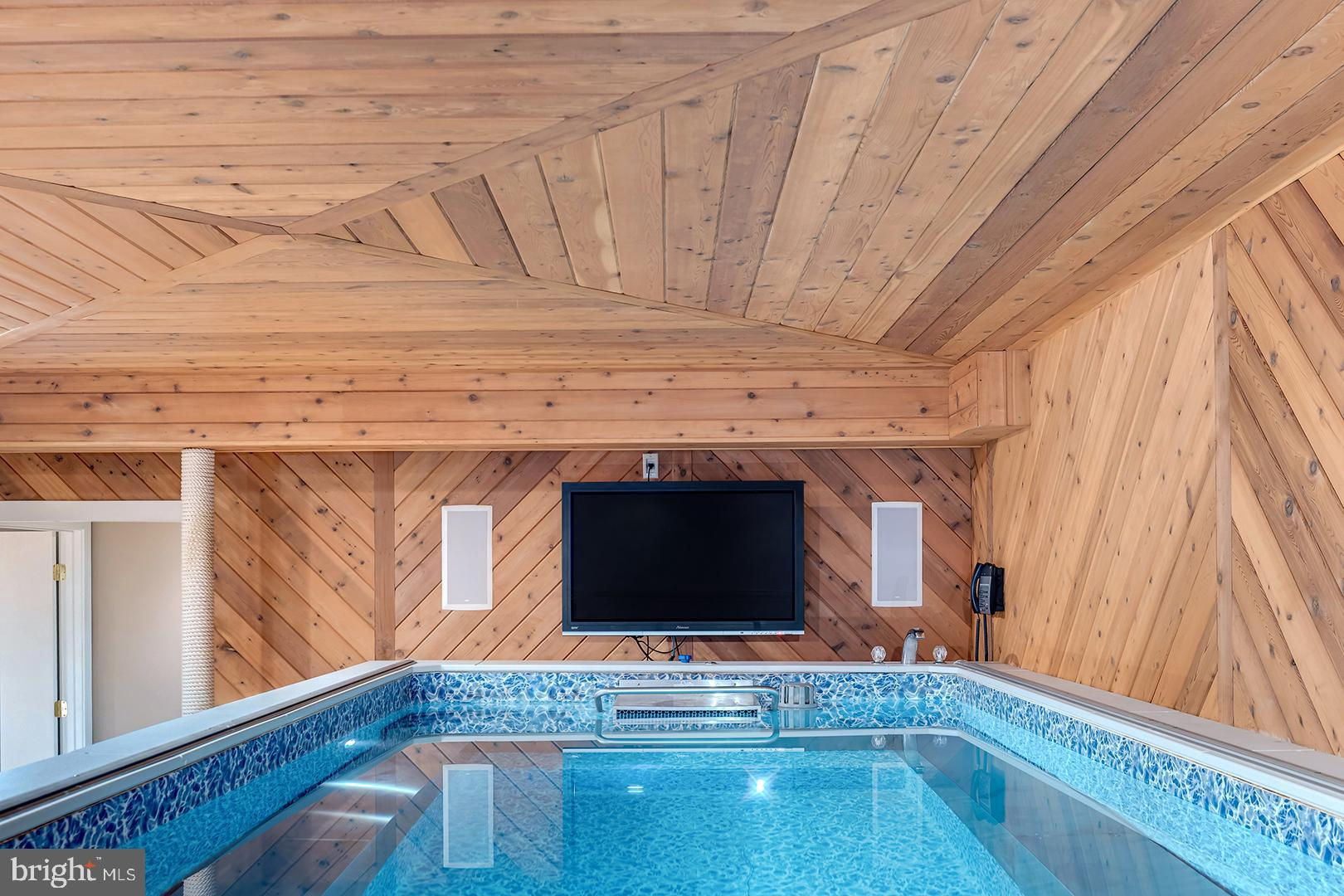 Nestled on more than 3 acres of lush, wooded land, this custom home offers an unparalleled sense of privacy and tranquility. A lighted fountain welcomes you at the center of the circular driveway, setting the tone for the sophisticated yet serene atmosphere of the property. Designed for both grand entertaining and intimate gatherings, the open-concept kitchen is a culinary haven designed by the producer of Emeril Lagasse's TV show and encompasses all of the same appliances as on the show. It flows seamlessly into the expansive great room, while a large deck with hot tub and sunlight weatherproof flat screen TV, and screened porch offer perfect spaces for relaxation or hosting guests in any season. There are 2 powder rooms: one at the foyer entry and one near the butler pantry next to the kitchen. The "Media & Wellness" level is a sanctuary in itself, featuring a state-of-the-art home theater, a resistance pool for fitness and relaxation, a massage room (which can also function as a fourth bedroom), a changing area, and a convenient 3/4 bathroom. Radiant heated floors run throughout the home, ensuring comfort no matter the season. The main level houses the primary bedroom suite, offering a peaceful retreat, while two additional bedrooms and a shared bathroom also reside on this level, making the home perfect for families or guests. The property is fully gated and fenced, with dense woods encircling the perimeter to enhance the seclusion and privacy of this exceptional estate. Set back from the road, the home exudes a serene atmosphere, providing an oasis of calm just moments away from everyday conveniences