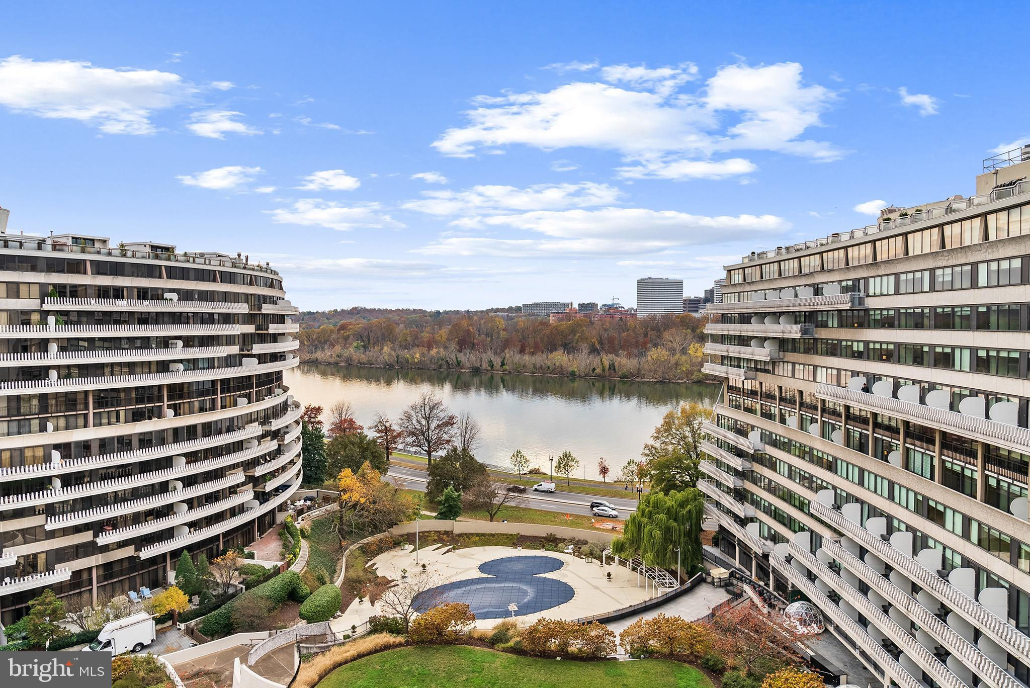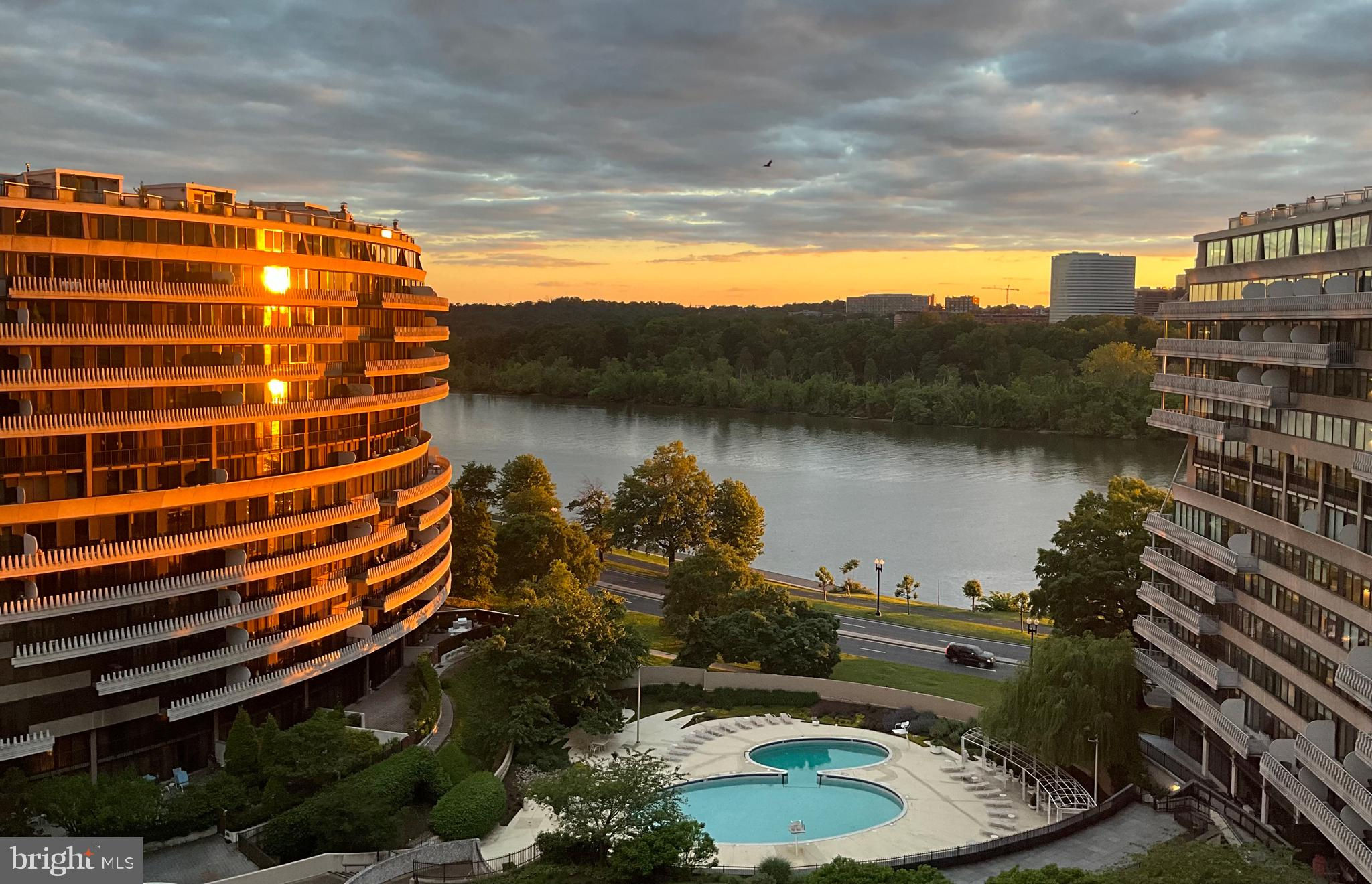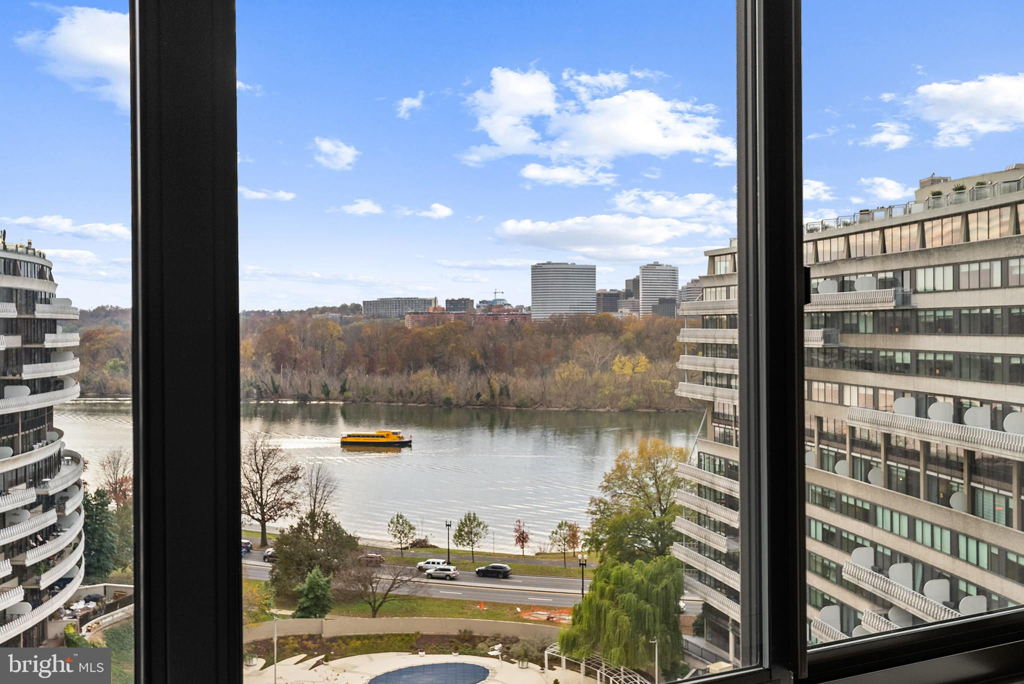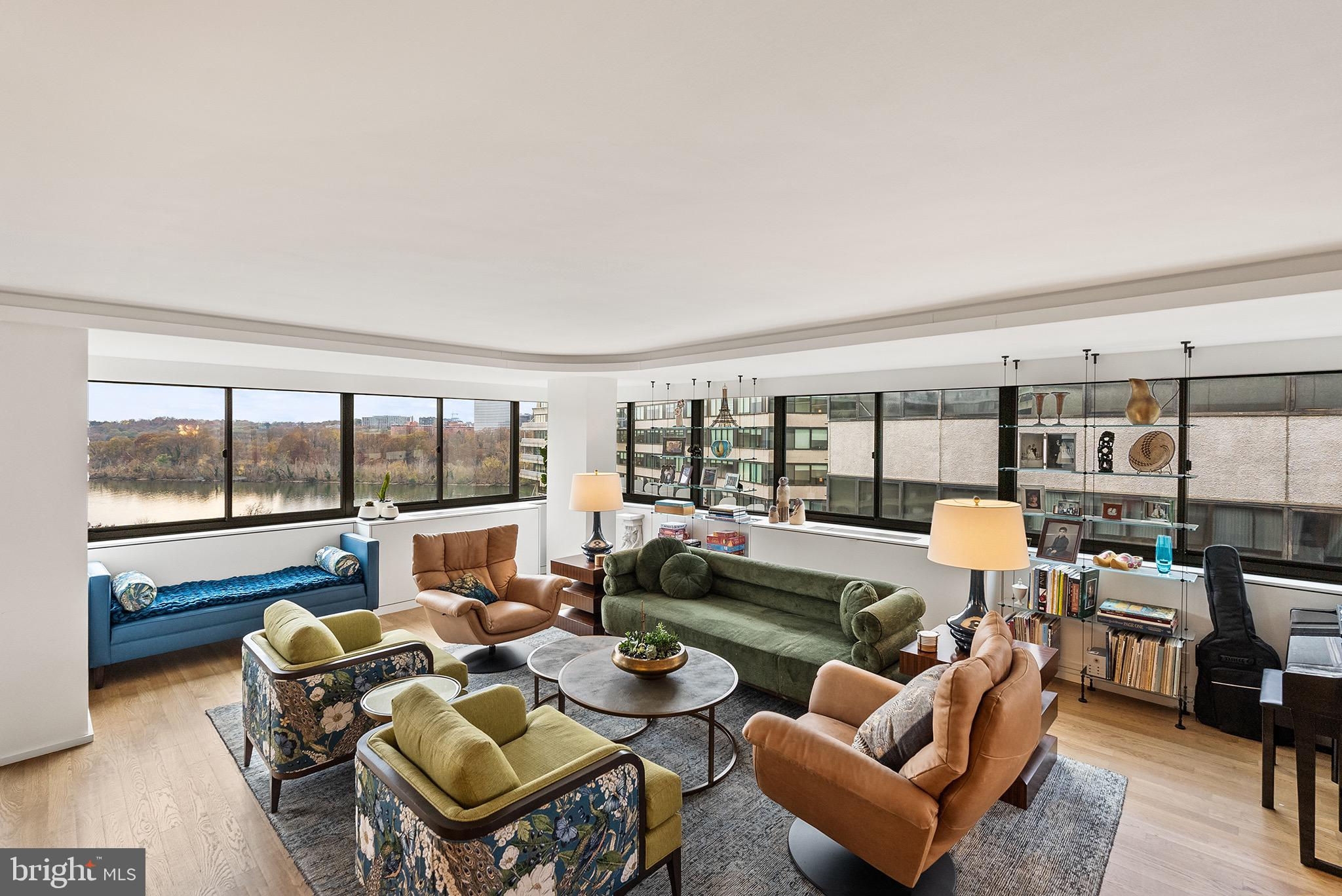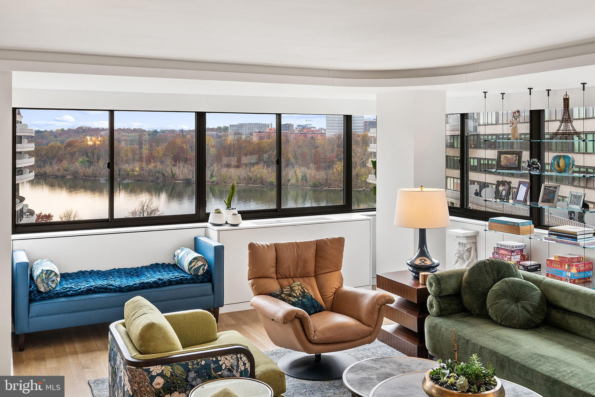 Fantastic renovation - 3 bedroom corner residence with great river and sunset views. 2265 sq ft. Curved architectural features and a superb renovation. Corner interior surrounded by windows and a direct river view. Double pane windows throughout. Gourmet kitchen with designer backsplash, quartz counters, bar seating area with built in microwave. Living room with custom hanging glass display shelves, custom walnut bookcase and built in cabinetry for closed storage and television display Large dining area with picture windows. Below counter icemaker and quartz counter. The flooring is engineered select white oak flooring throughout except bathrooms, with cork underlayment for sound dampening. Designer baths with pure white quartz counters, vanities and tilework. Spacious bedrooms including large primary bedrooms. Taj Mahal quartzite wall in primary bath. Miele washer and heat pump dryer. Programmable shades/ All-inclusive LOW monthly co-op fee includes property taxes, utilities, basic cable, internet, and maintenance of HVAC. Watergate East amenities include sparkling newly renovated lobby, 24/7 front desk & doorman service, outdoor heated pool, fitness center, roof terrace & garden, plus on-site shops and restaurants. Walking distance to the Kennedy Center, Georgetown Waterfront, bicycle paths, Foggy Bottom Metro, Watergate Hotel & Spa, GWU, restaurants, Trader joes, Whole Foods and more!