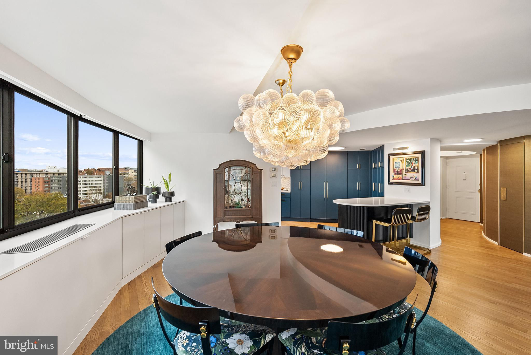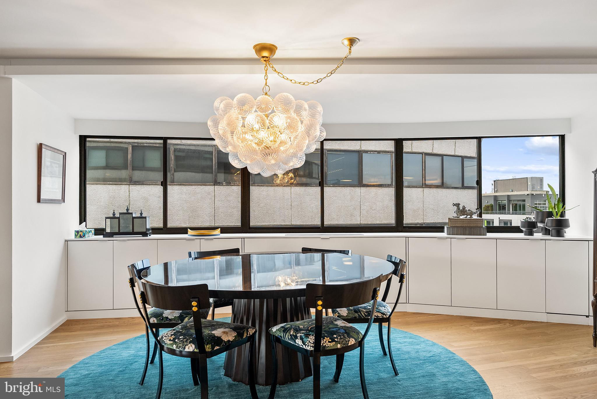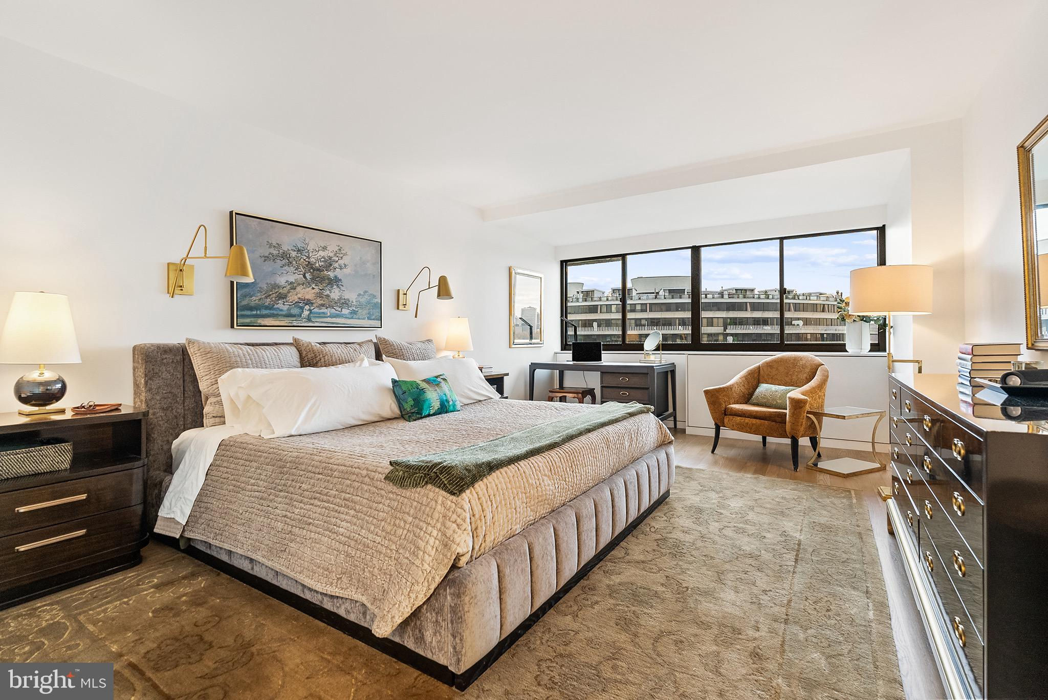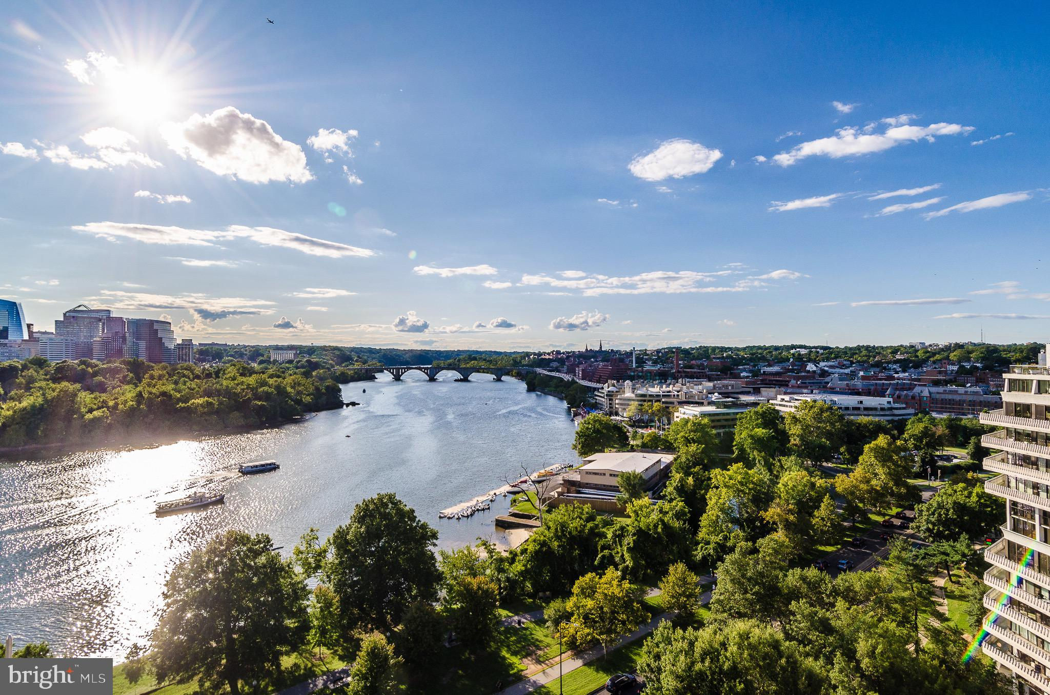 Fantastic renovation - 3 bedroom corner residence with great river and sunset views. 2265 sq ft. Curved architectural features and a superb renovation. Corner interior surrounded by windows and a direct river view. Double pane windows throughout. Gourmet kitchen with designer backsplash, quartz counters, bar seating area with built in microwave. Living room with custom hanging glass display shelves, custom walnut bookcase and built in cabinetry for closed storage and television display Large dining area with picture windows. Below counter icemaker and quartz counter. The flooring is engineered select white oak flooring throughout except bathrooms, with cork underlayment for sound dampening. Designer baths with pure white quartz counters, vanities and tilework. Spacious bedrooms including large primary bedrooms. Taj Mahal quartzite wall in primary bath. Miele washer and heat pump dryer. Programmable shades/ All-inclusive LOW monthly co-op fee includes property taxes, utilities, basic cable, internet, and maintenance of HVAC. Watergate East amenities include sparkling newly renovated lobby, 24/7 front desk & doorman service, outdoor heated pool, fitness center, roof terrace & garden, plus on-site shops and restaurants. Walking distance to the Kennedy Center, Georgetown Waterfront, bicycle paths, Foggy Bottom Metro, Watergate Hotel & Spa, GWU, restaurants, Trader joes, Whole Foods and more!