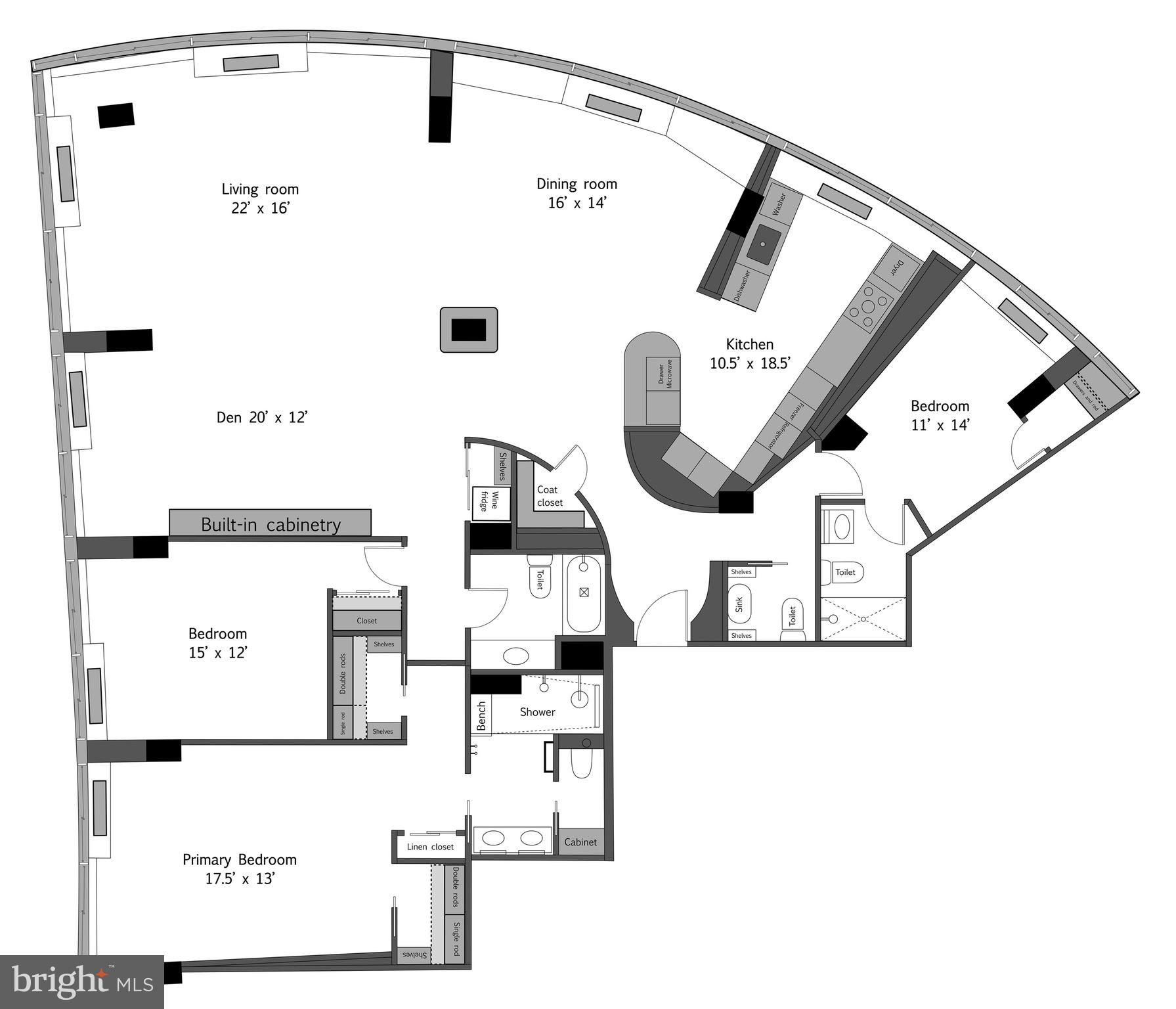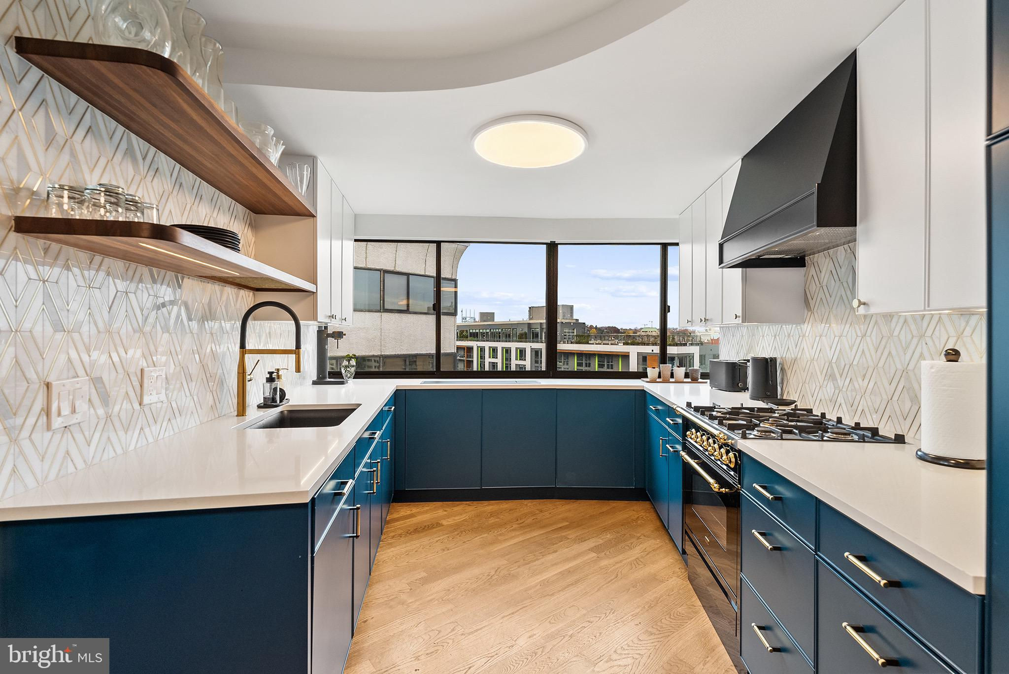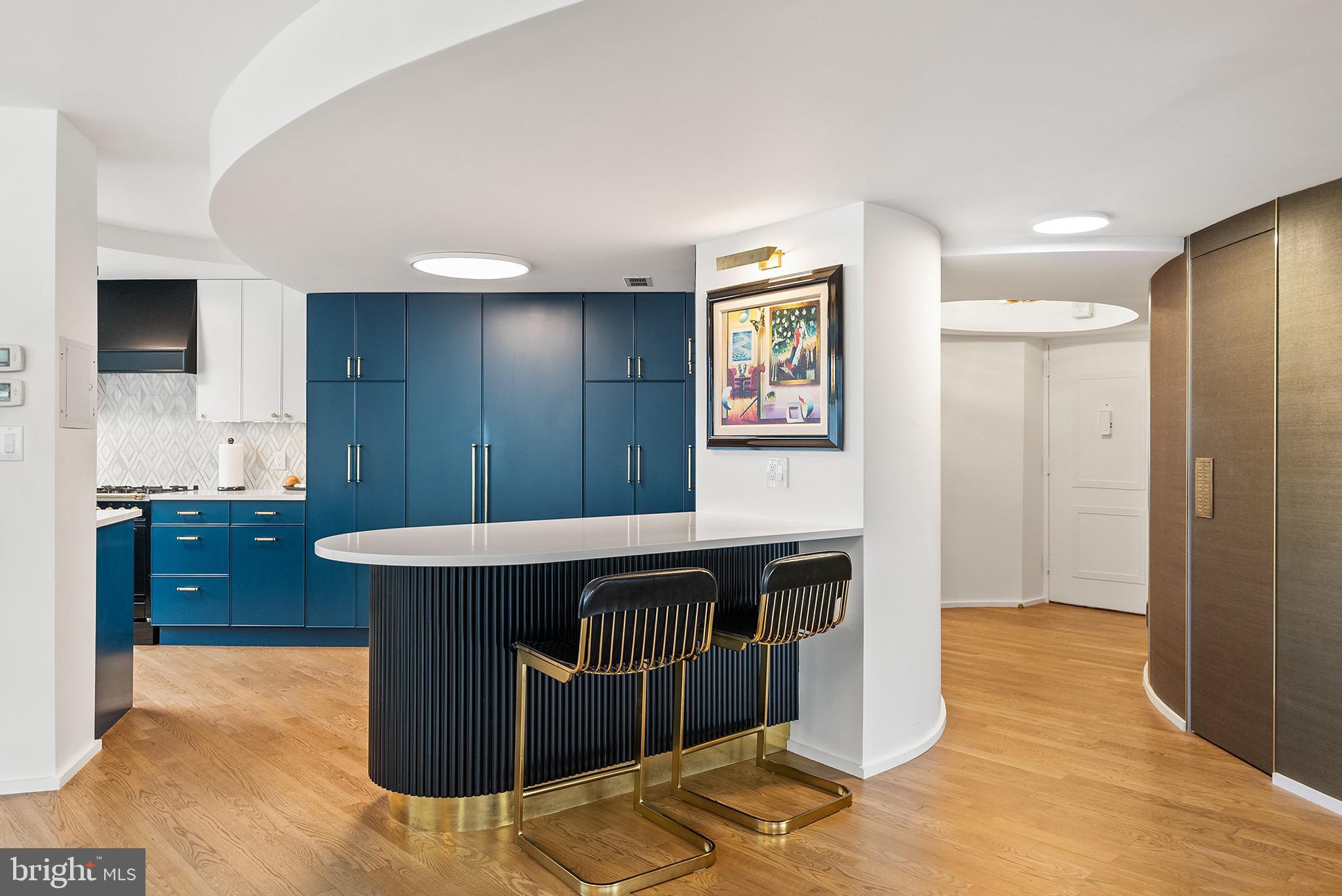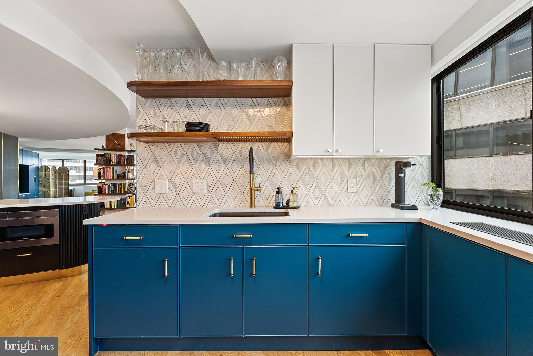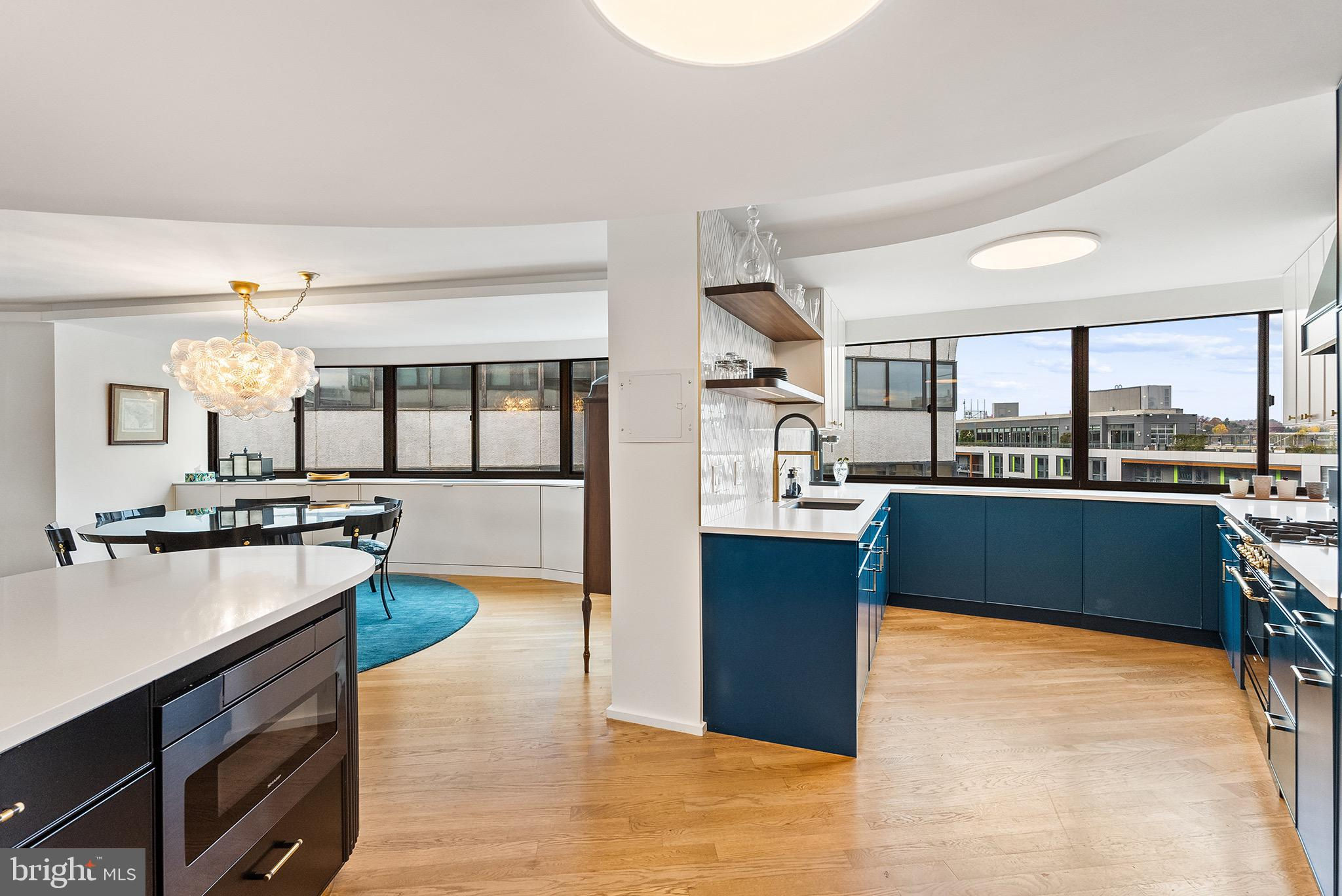 Fantastic renovation - 3 bedroom corner residence with great river and sunset views. 2265 sq ft. Curved architectural features and a superb renovation. Corner interior surrounded by windows and a direct river view. Double pane windows throughout. Gourmet kitchen with designer backsplash, quartz counters, bar seating area with built in microwave. Living room with custom hanging glass display shelves, custom walnut bookcase and built in cabinetry for closed storage and television display Large dining area with picture windows. Below counter icemaker and quartz counter. The flooring is engineered select white oak flooring throughout except bathrooms, with cork underlayment for sound dampening. Designer baths with pure white quartz counters, vanities and tilework. Spacious bedrooms including large primary bedrooms. Taj Mahal quartzite wall in primary bath. Miele washer and heat pump dryer. Programmable shades/ All-inclusive LOW monthly co-op fee includes property taxes, utilities, basic cable, internet, and maintenance of HVAC. Watergate East amenities include sparkling newly renovated lobby, 24/7 front desk & doorman service, outdoor heated pool, fitness center, roof terrace & garden, plus on-site shops and restaurants. Walking distance to the Kennedy Center, Georgetown Waterfront, bicycle paths, Foggy Bottom Metro, Watergate Hotel & Spa, GWU, restaurants, Trader joes, Whole Foods and more!