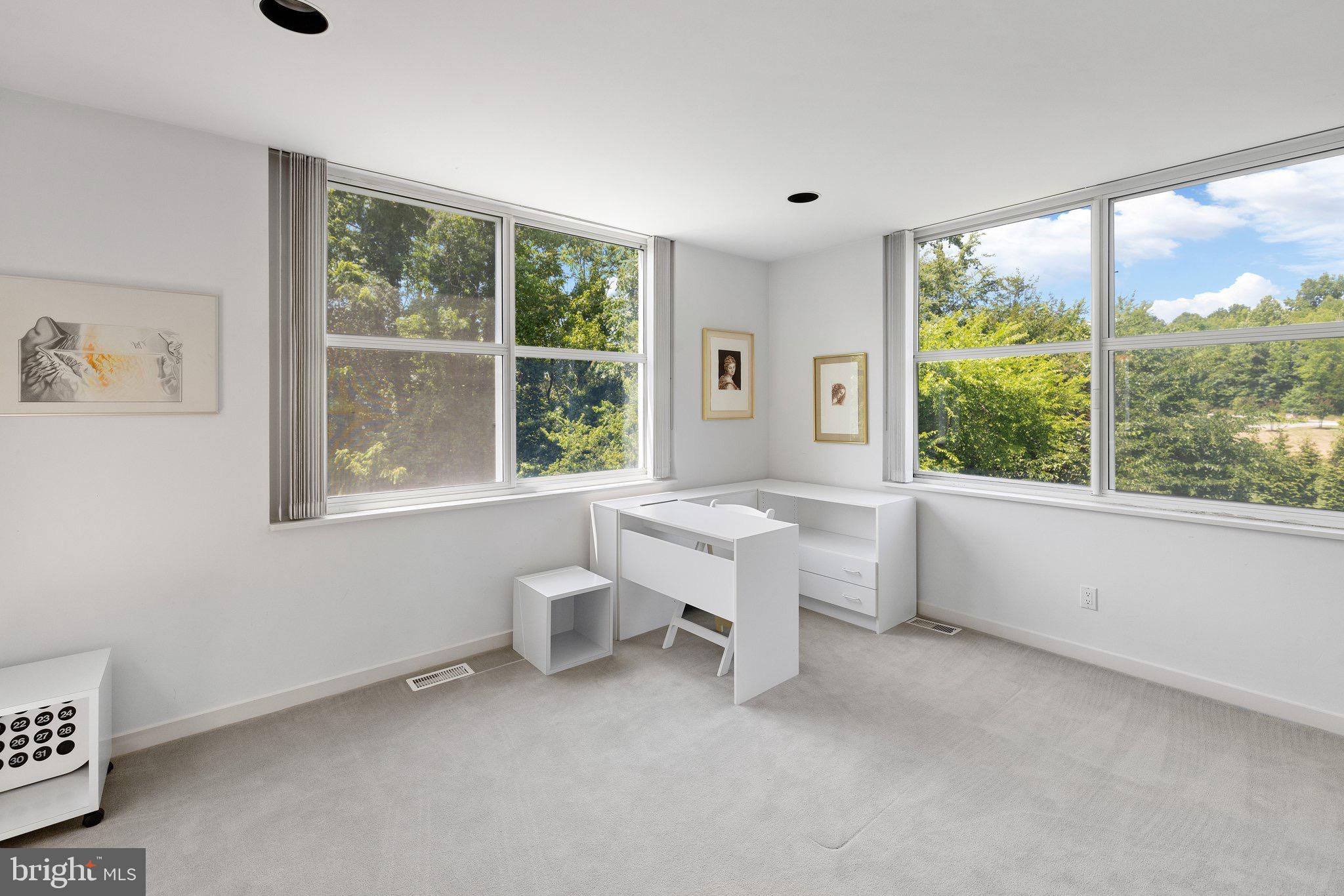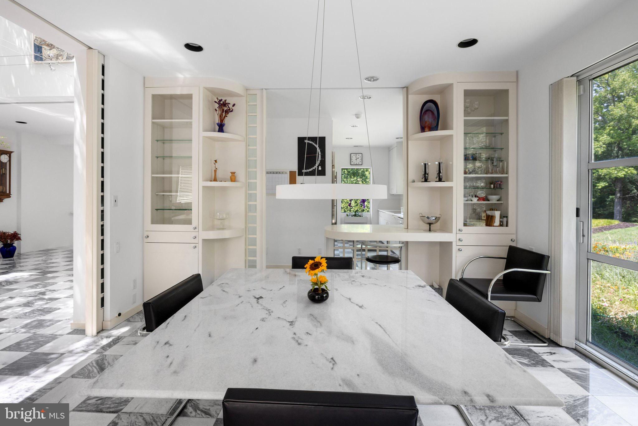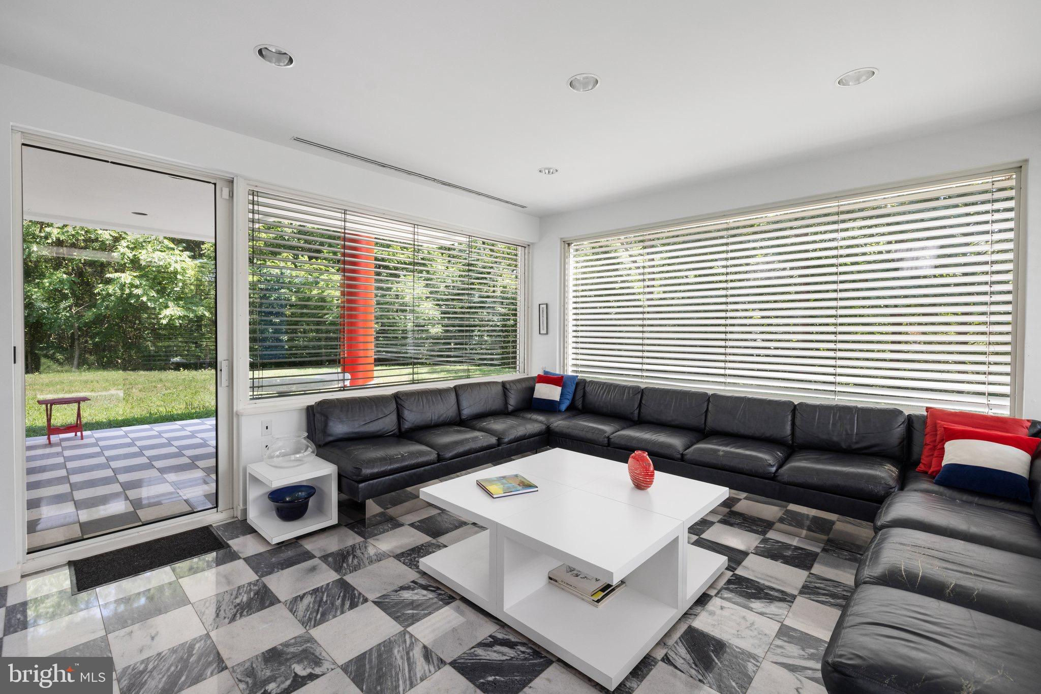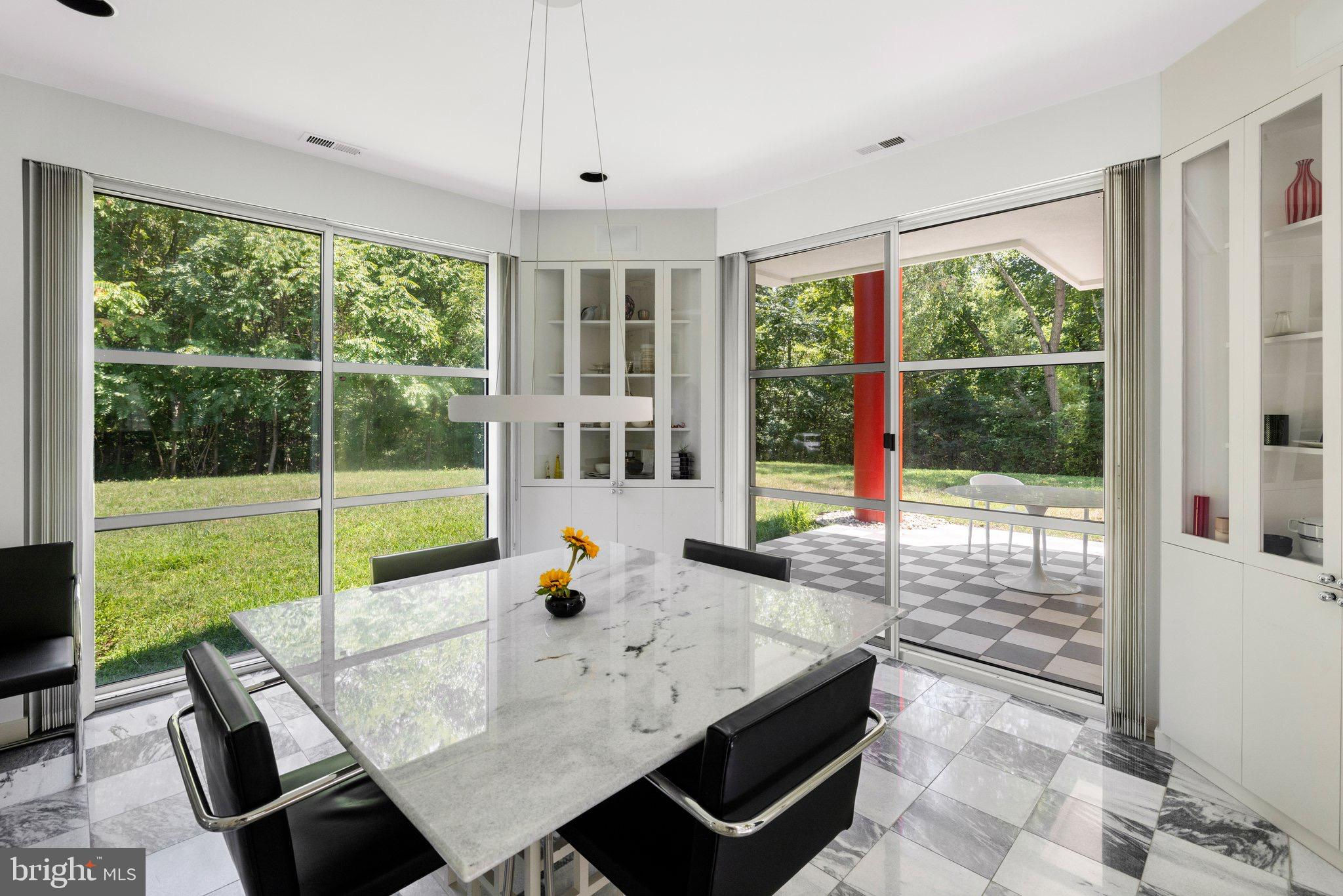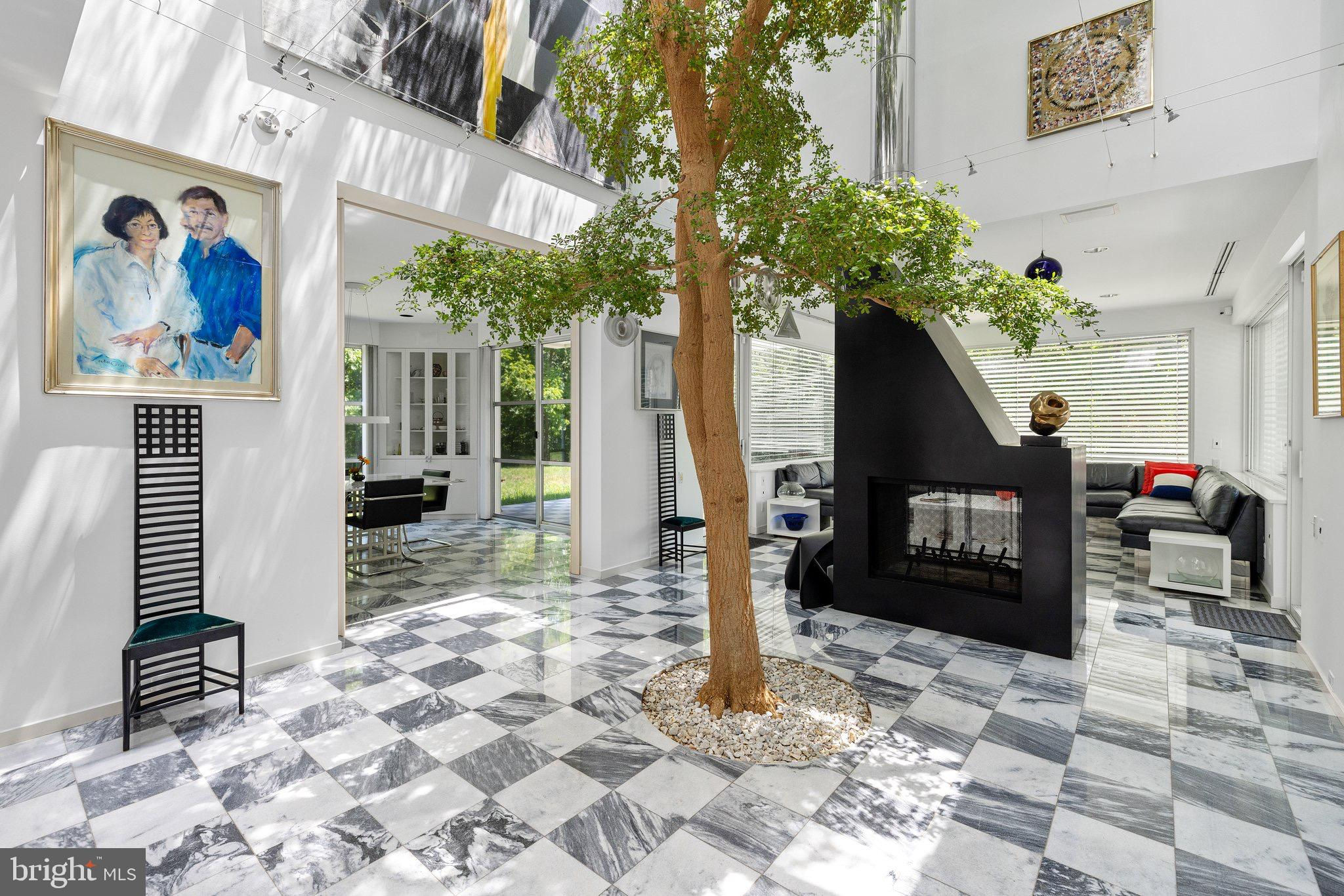 Price Reduced--A rare opportunity to own a custom, contemporary-international style home in the coveted Pembroke neighborhood along the River Road corridor awaits. This home features large picture windows in all but two spaces in the home, bathing the interiors in light throughout the day and the night. Built w/ cutting-edge sustainable techniques at the time, the home remains energy-efficient and features a rooftop greenspace above the garage. Upon entering the marbled foyer, discover the first of 5 BRs, complete w/ an ensuite bath, built-in Murphy bed, and sliding glass doors that open to the outdoors, offering flexible use. To the left, the striking spiral staircase, crafted as a single piece of steel and poured concrete, is bathed in natural light from above. On the main level, marbled flooring in a gray & white checkerboard gives a formal finish to the open space. A 2-story sky-lit atrium anchors the 4 living spaces that flow freely into one another. Just beyond the double-sided fireplace, the LR is tucked in a square bay flanked by large windows. The kitchen and DR are stunningly simple and efficiently designed to serve their purposes. A home office w/ custom cabinetry connects seamlessly to a sitting room, also outfitted w/ custom built-in shelving. Glass and wood grid-patterned pocket doors can be utilized to separate the spaces. Following the natural light, the terrace off the dining area faces east, while the terrace off the LR faces west and is perfect for sunset entertaining. Follow the spiral staircase up to find 4 BRs, each w/ an ensuite bath. The primary suite features a wall of mirrored closet doors to reflect the westward facing view. A guest room features a built-in Murphy bed for flexibility to be used as an upstairs den if desired. Set on nearly 4 acres, this property offers unparalleled privacy, while still being part of a vibrant community with views and access to the James River. Don't miss this opportunity to own a truly unique and enduring property that brings intention and functionality together.