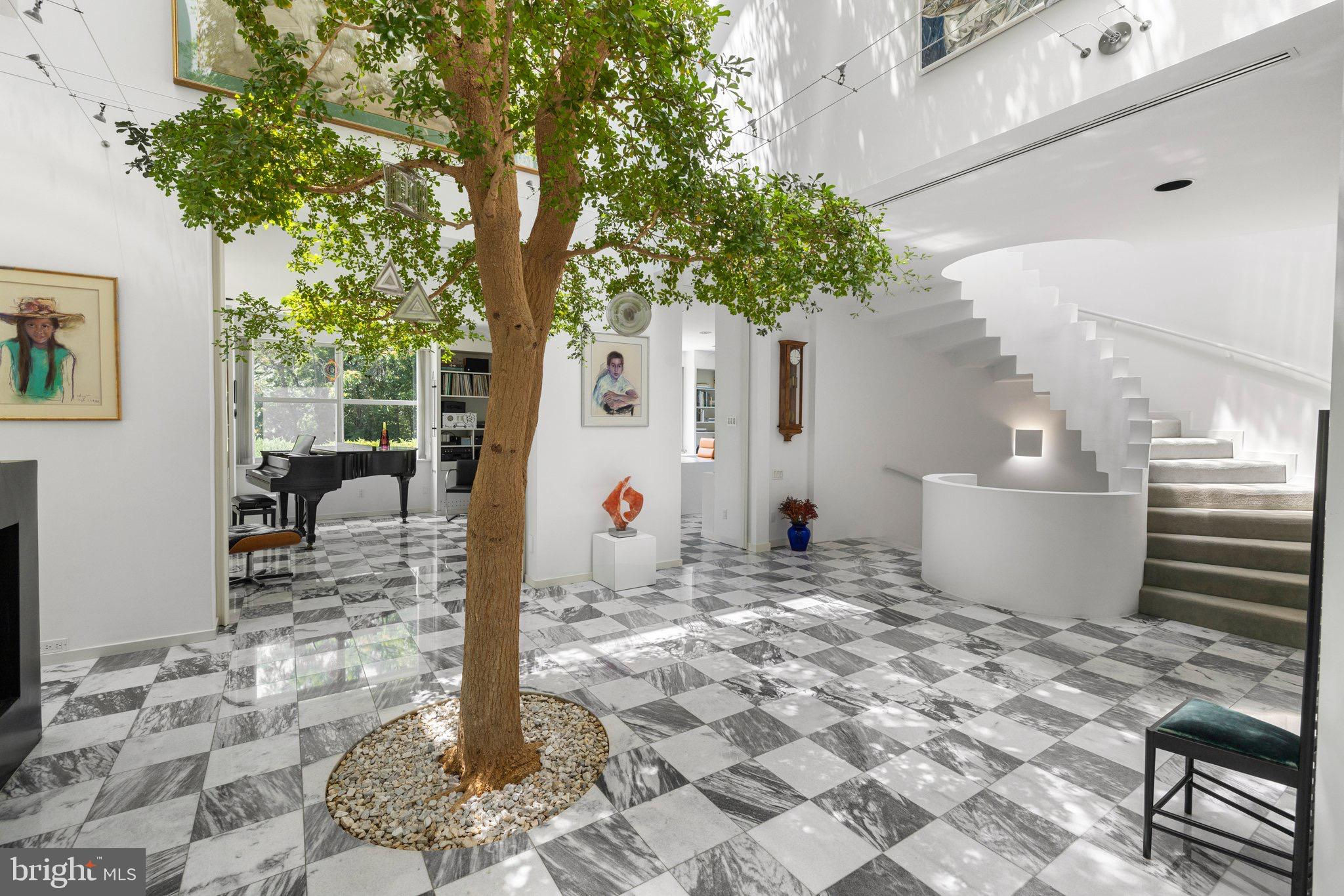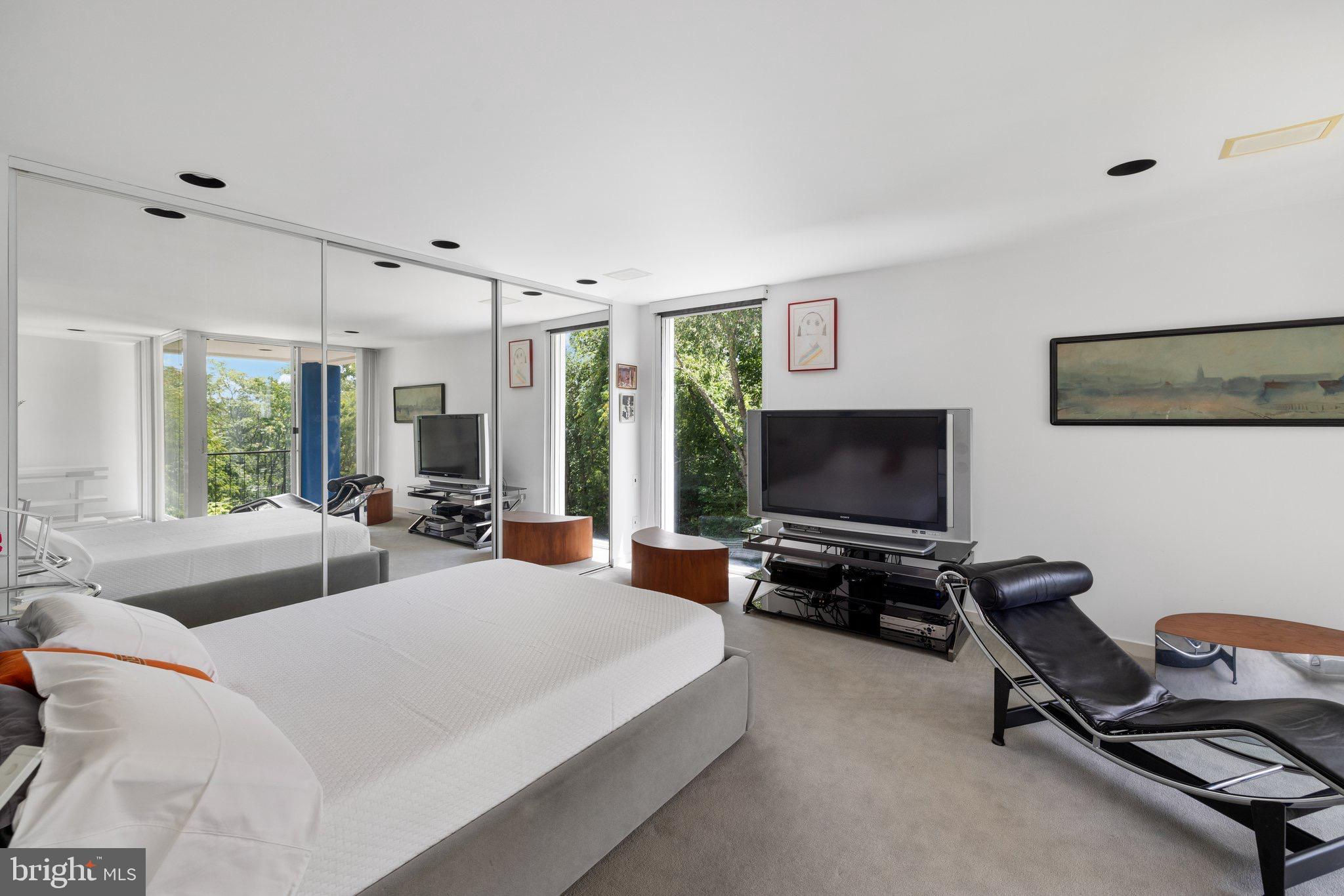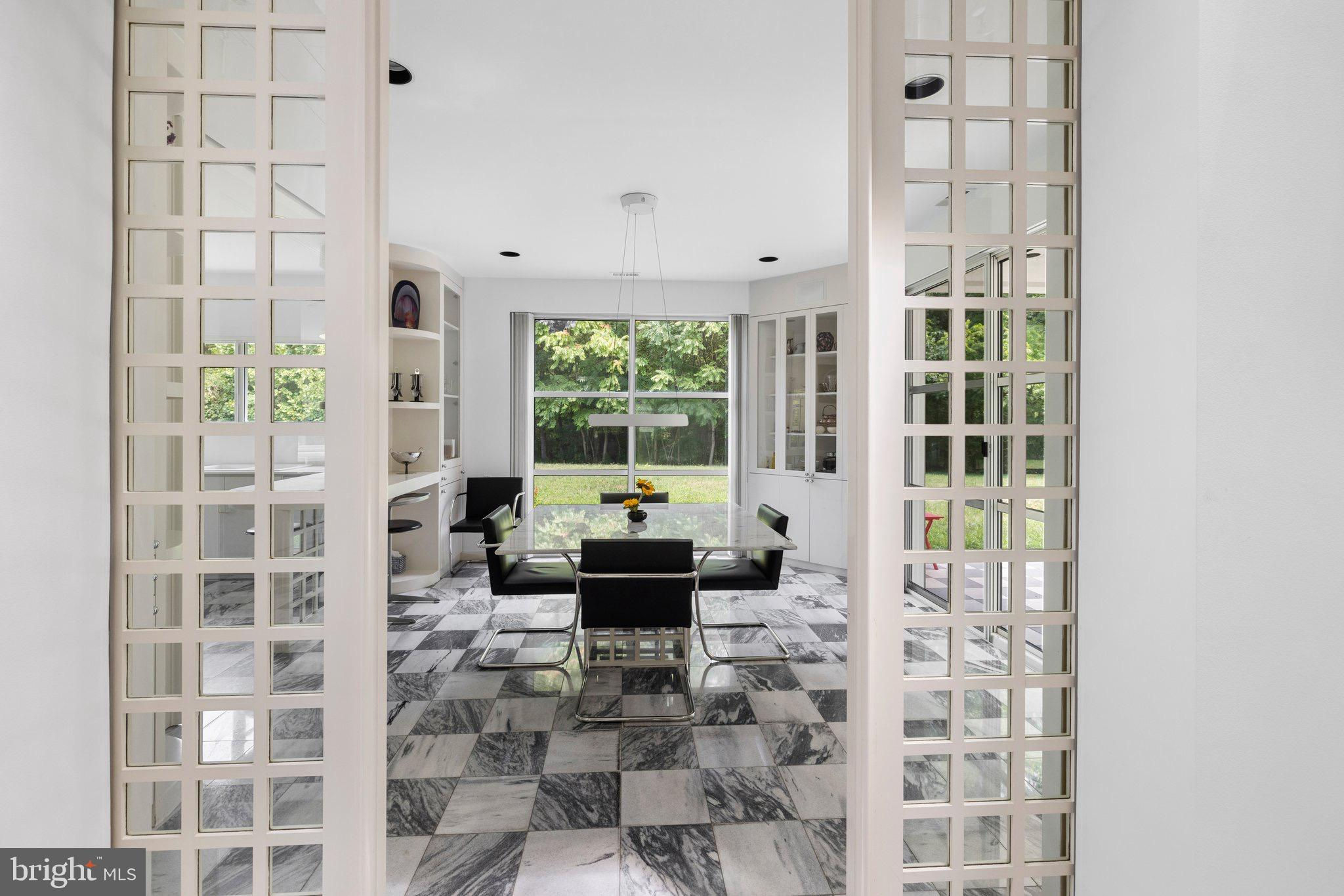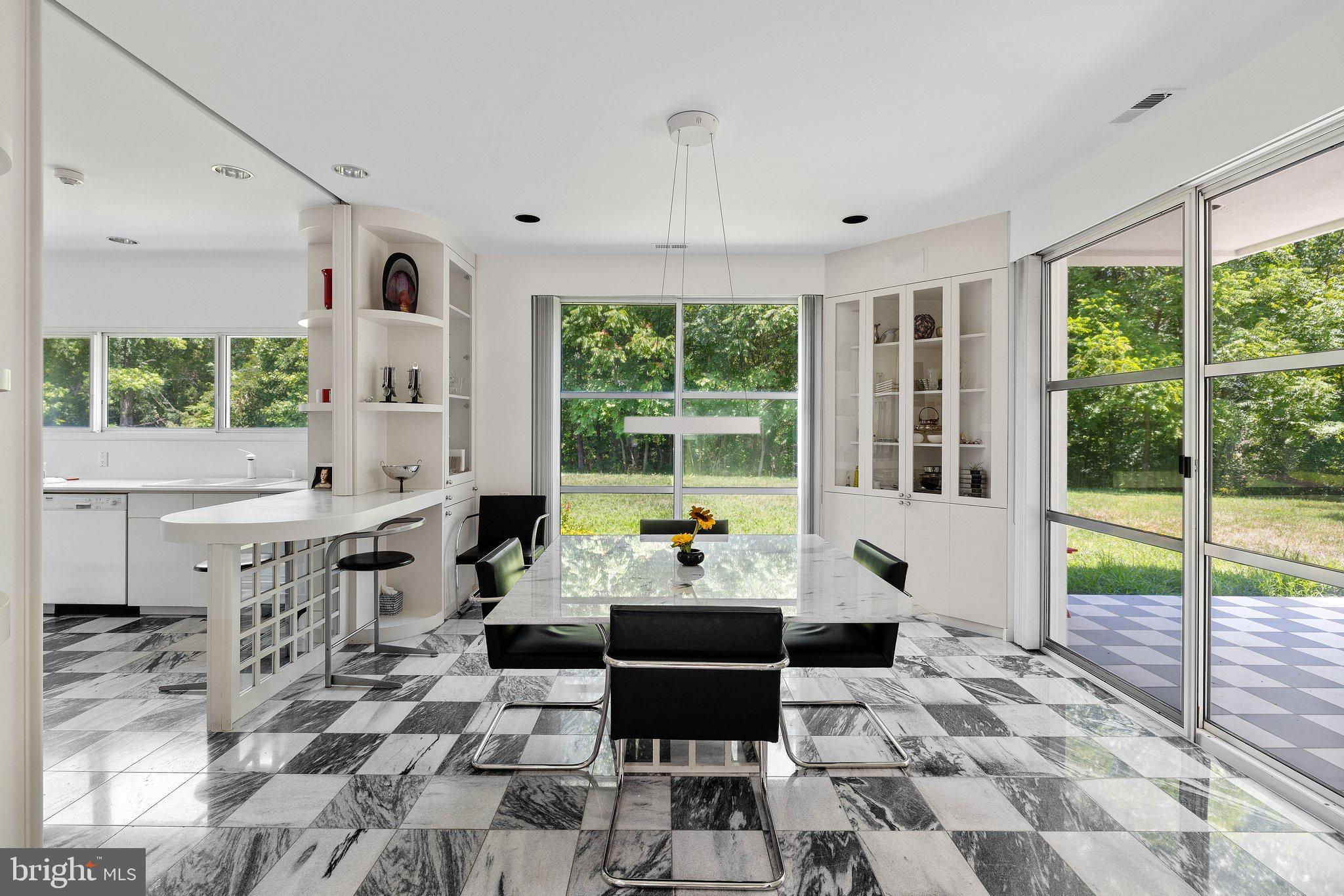 Price Reduced--A rare opportunity to own a custom, contemporary-international style home in the coveted Pembroke neighborhood along the River Road corridor awaits. This home features large picture windows in all but two spaces in the home, bathing the interiors in light throughout the day and the night. Built w/ cutting-edge sustainable techniques at the time, the home remains energy-efficient and features a rooftop greenspace above the garage. Upon entering the marbled foyer, discover the first of 5 BRs, complete w/ an ensuite bath, built-in Murphy bed, and sliding glass doors that open to the outdoors, offering flexible use. To the left, the striking spiral staircase, crafted as a single piece of steel and poured concrete, is bathed in natural light from above. On the main level, marbled flooring in a gray & white checkerboard gives a formal finish to the open space. A 2-story sky-lit atrium anchors the 4 living spaces that flow freely into one another. Just beyond the double-sided fireplace, the LR is tucked in a square bay flanked by large windows. The kitchen and DR are stunningly simple and efficiently designed to serve their purposes. A home office w/ custom cabinetry connects seamlessly to a sitting room, also outfitted w/ custom built-in shelving. Glass and wood grid-patterned pocket doors can be utilized to separate the spaces. Following the natural light, the terrace off the dining area faces east, while the terrace off the LR faces west and is perfect for sunset entertaining. Follow the spiral staircase up to find 4 BRs, each w/ an ensuite bath. The primary suite features a wall of mirrored closet doors to reflect the westward facing view. A guest room features a built-in Murphy bed for flexibility to be used as an upstairs den if desired. Set on nearly 4 acres, this property offers unparalleled privacy, while still being part of a vibrant community with views and access to the James River. Don't miss this opportunity to own a truly unique and enduring property that brings intention and functionality together.