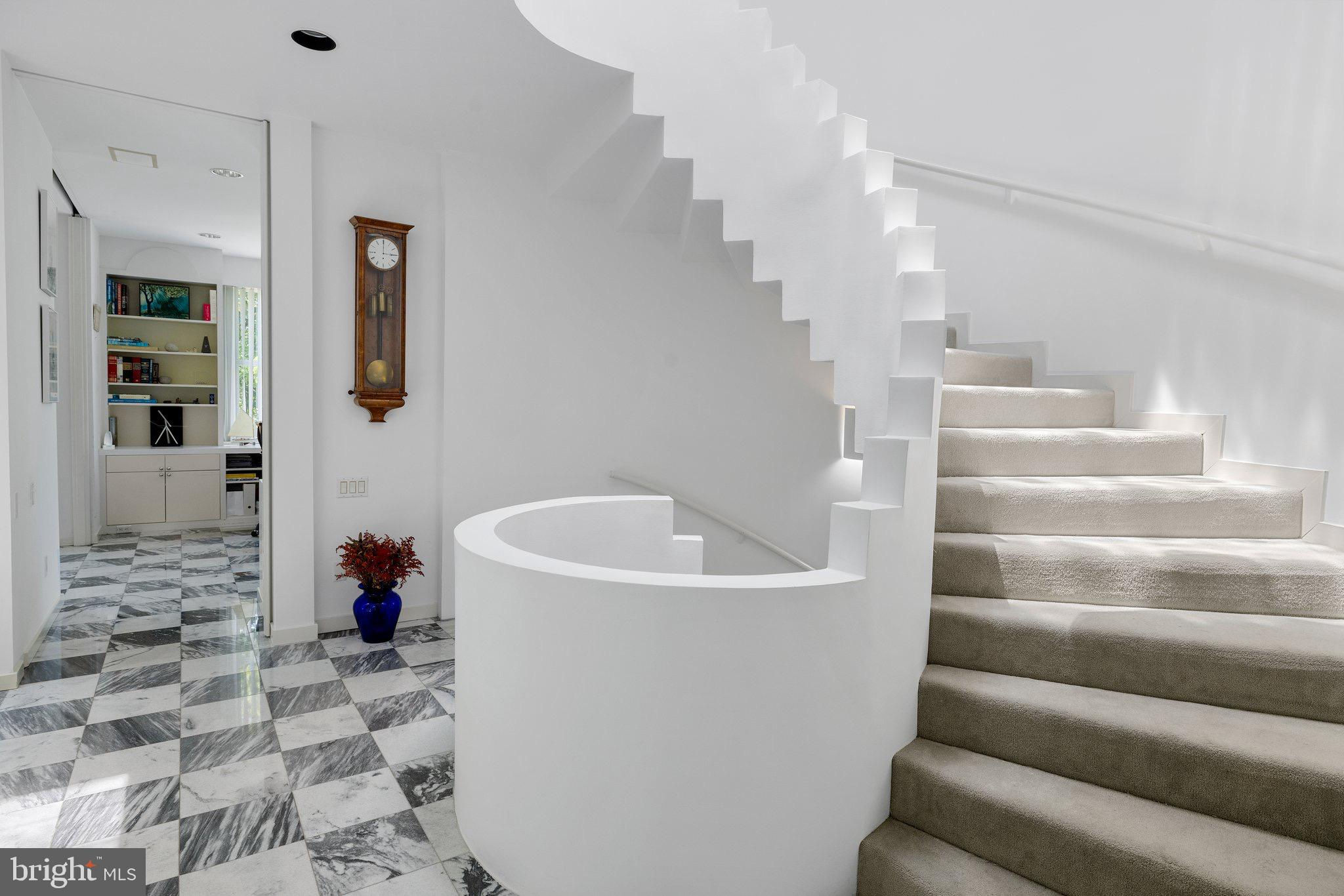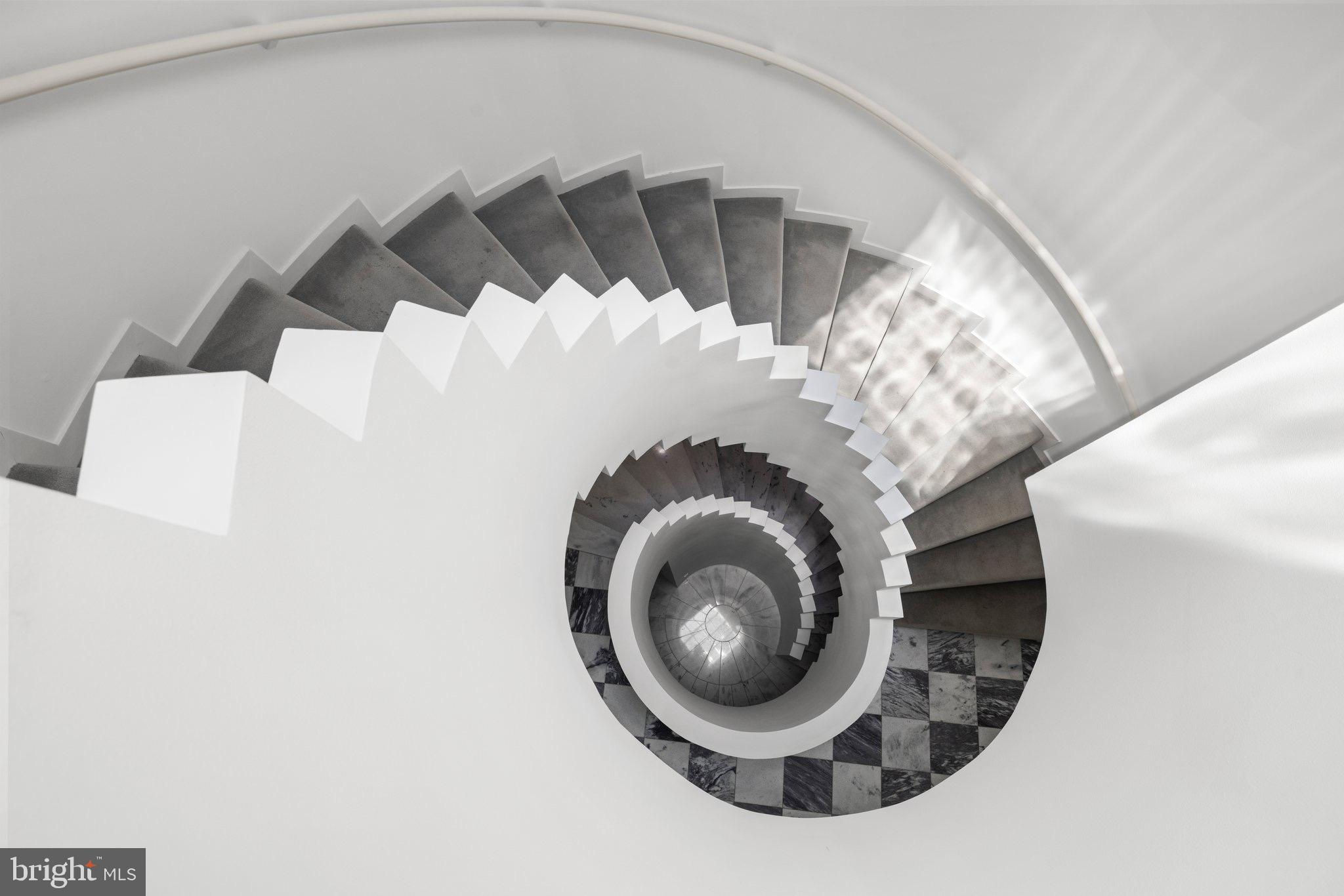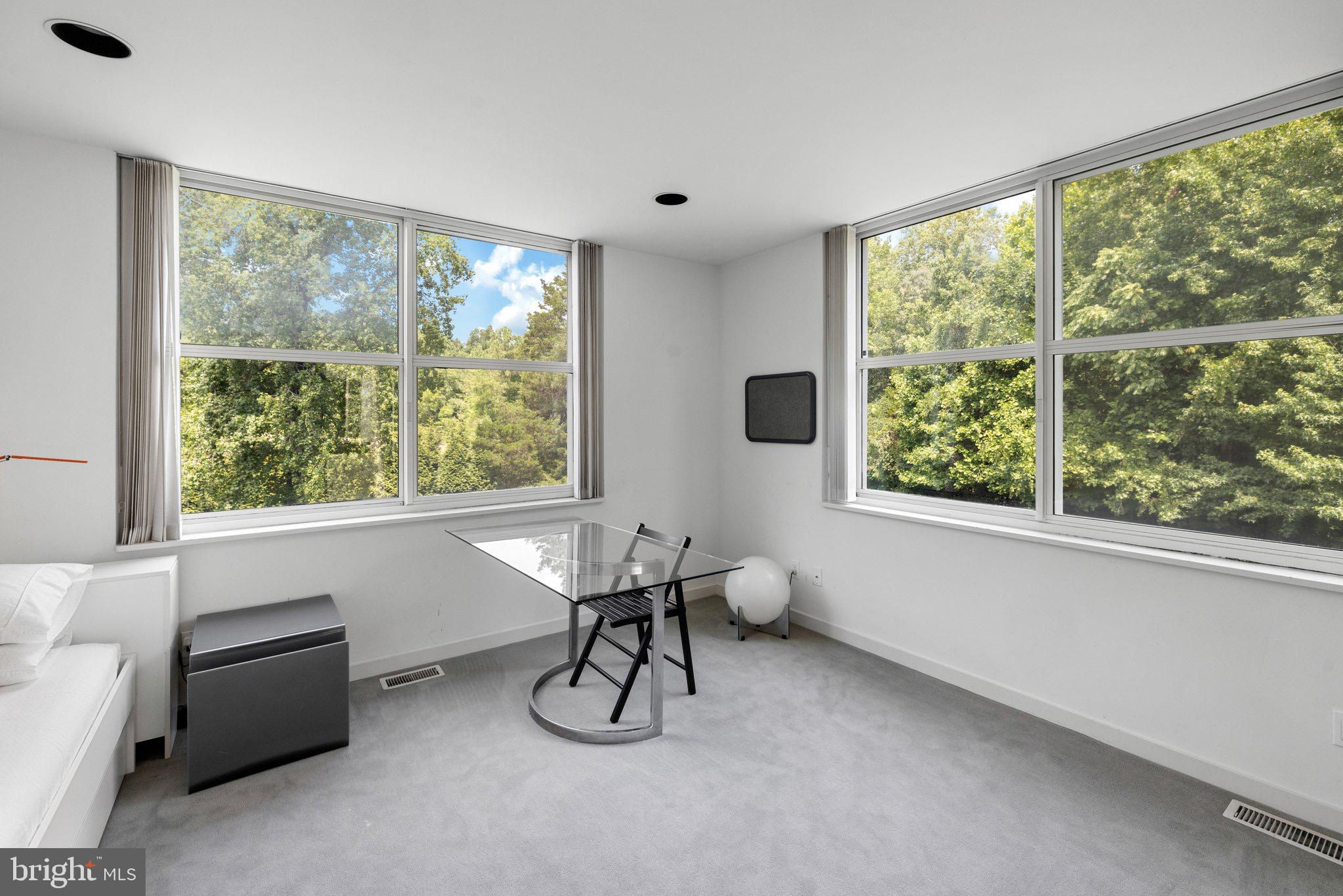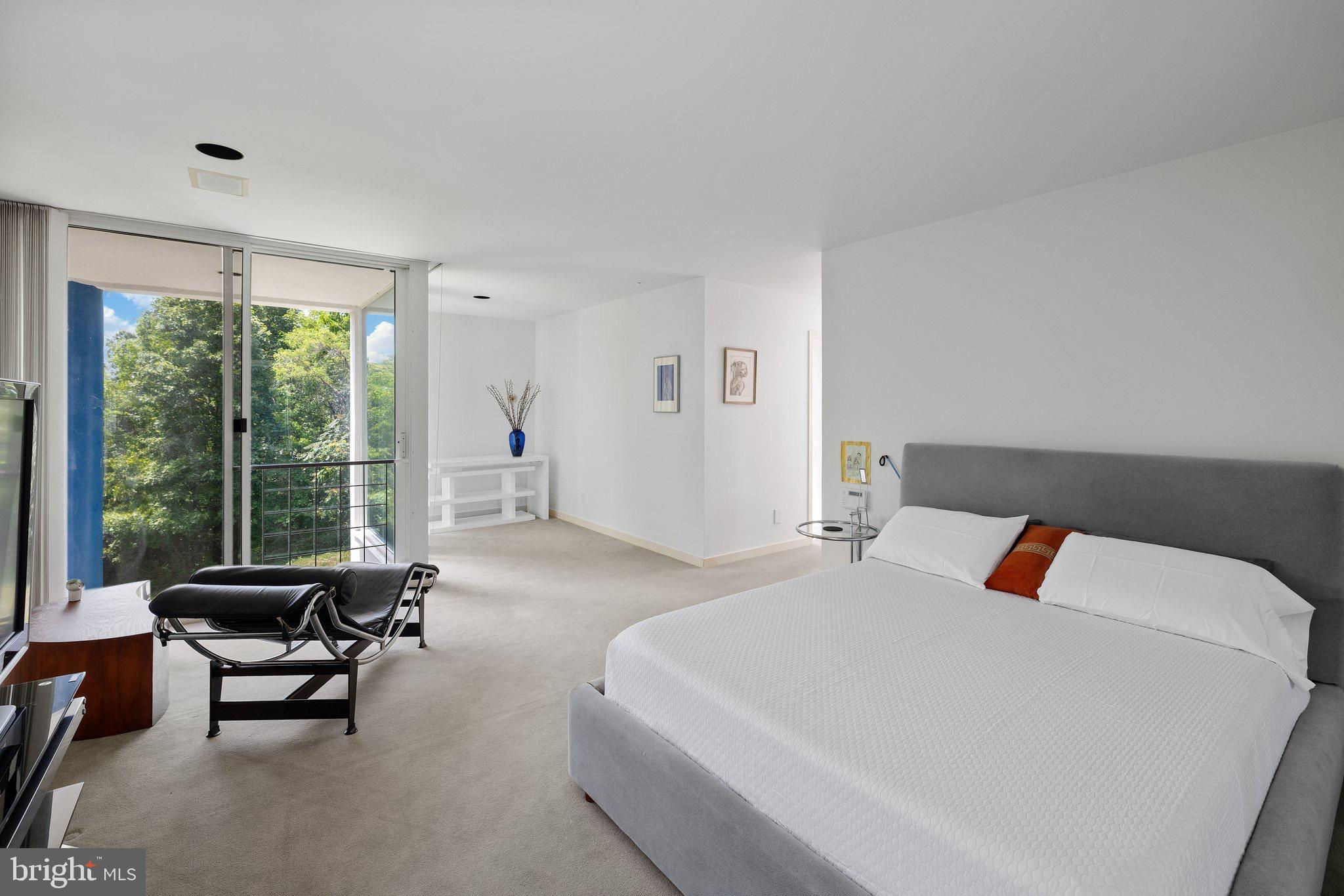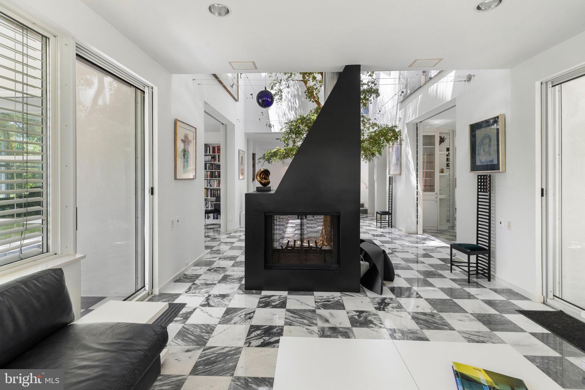 Price Reduced--A rare opportunity to own a custom, contemporary-international style home in the coveted Pembroke neighborhood along the River Road corridor awaits. This home features large picture windows in all but two spaces in the home, bathing the interiors in light throughout the day and the night. Built w/ cutting-edge sustainable techniques at the time, the home remains energy-efficient and features a rooftop greenspace above the garage. Upon entering the marbled foyer, discover the first of 5 BRs, complete w/ an ensuite bath, built-in Murphy bed, and sliding glass doors that open to the outdoors, offering flexible use. To the left, the striking spiral staircase, crafted as a single piece of steel and poured concrete, is bathed in natural light from above. On the main level, marbled flooring in a gray & white checkerboard gives a formal finish to the open space. A 2-story sky-lit atrium anchors the 4 living spaces that flow freely into one another. Just beyond the double-sided fireplace, the LR is tucked in a square bay flanked by large windows. The kitchen and DR are stunningly simple and efficiently designed to serve their purposes. A home office w/ custom cabinetry connects seamlessly to a sitting room, also outfitted w/ custom built-in shelving. Glass and wood grid-patterned pocket doors can be utilized to separate the spaces. Following the natural light, the terrace off the dining area faces east, while the terrace off the LR faces west and is perfect for sunset entertaining. Follow the spiral staircase up to find 4 BRs, each w/ an ensuite bath. The primary suite features a wall of mirrored closet doors to reflect the westward facing view. A guest room features a built-in Murphy bed for flexibility to be used as an upstairs den if desired. Set on nearly 4 acres, this property offers unparalleled privacy, while still being part of a vibrant community with views and access to the James River. Don't miss this opportunity to own a truly unique and enduring property that brings intention and functionality together.