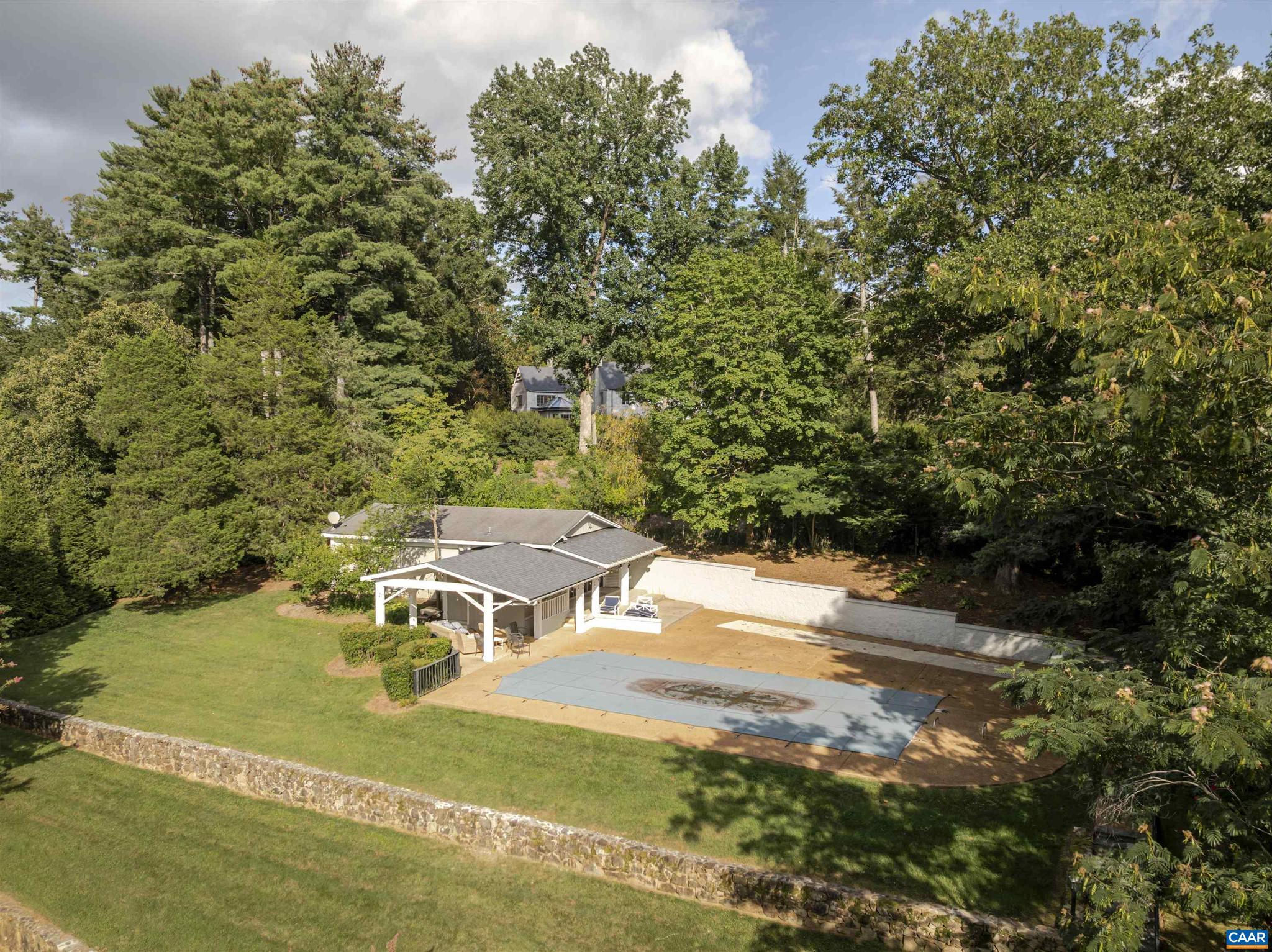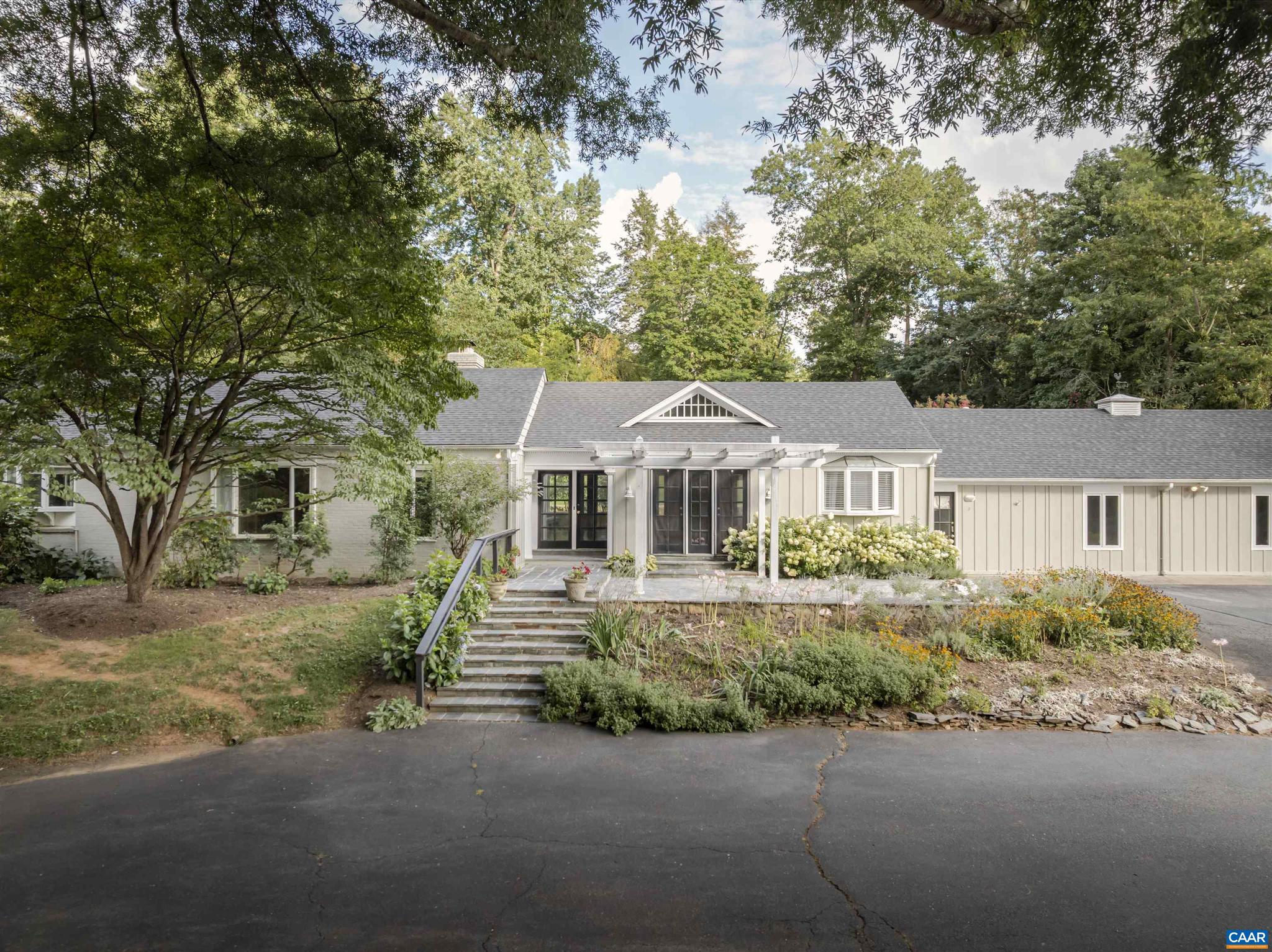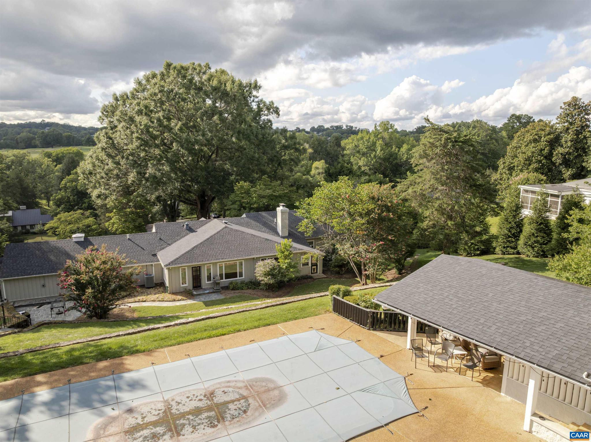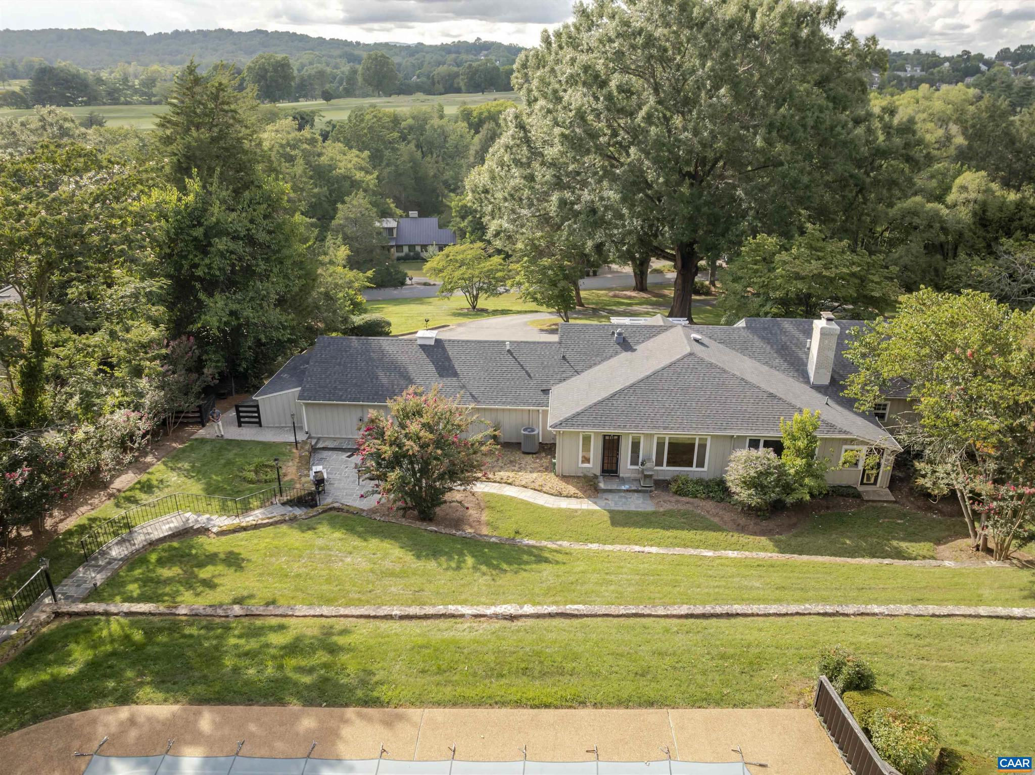 Located in HIGHLY SOUGHT-AFTER BELLAIR NEIGHBORHOOD is this fashionable and completely remodeled 4 bedroom one-level home with many modern features and details including open floor plan, eat-in gourmet kitchen with spacious breakfast and dining areas, large family room and even larger recreation room, tasteful living room with fireplace, plus a huge master bedroom suite with completely modernized bath and dressing room. This home is on an elevated 1.4 acres with panoramic views towards the Birdwood Golf Course. The home also features a lovely and private entertaining area with pool, large concrete terrace and generous pool house with a great room, full kitchen, one bedroom full bath and a large covered exterior porch.,Granite Counter,Painted Cabinets,White Cabinets,Wood Cabinets,Fireplace in Living Room