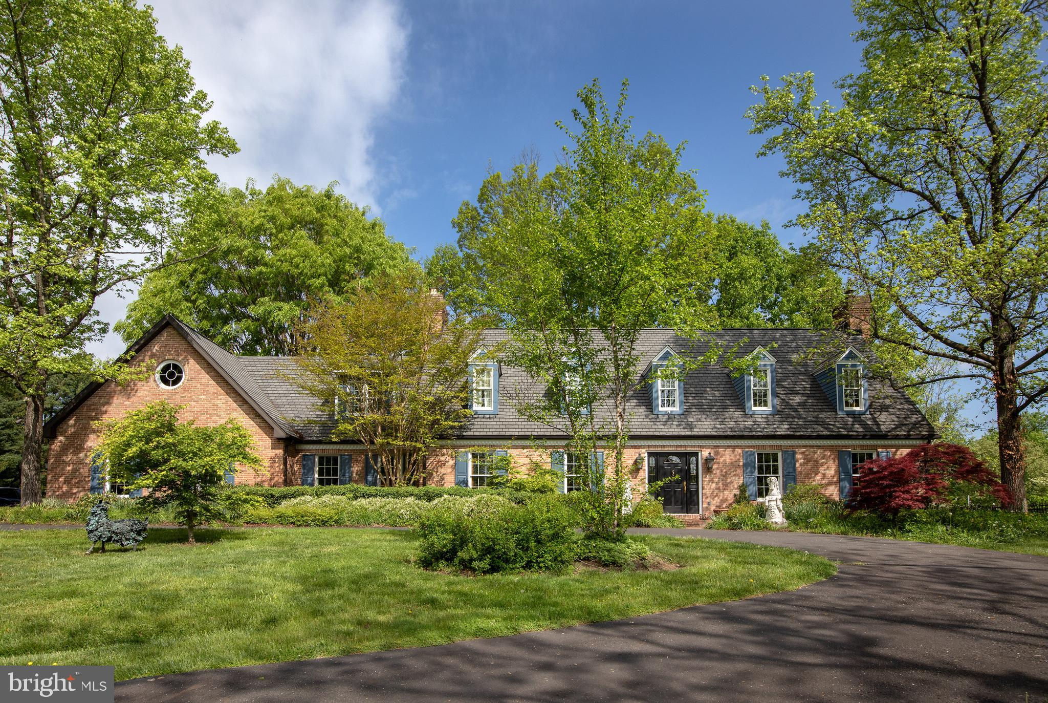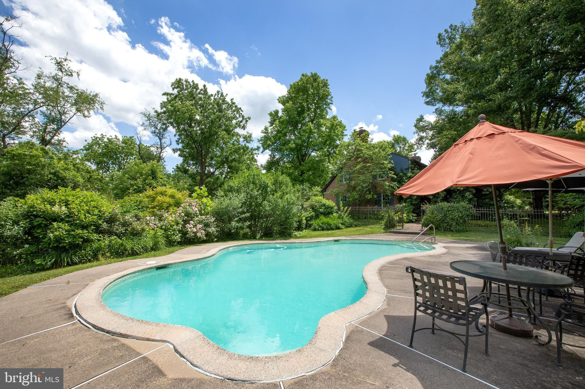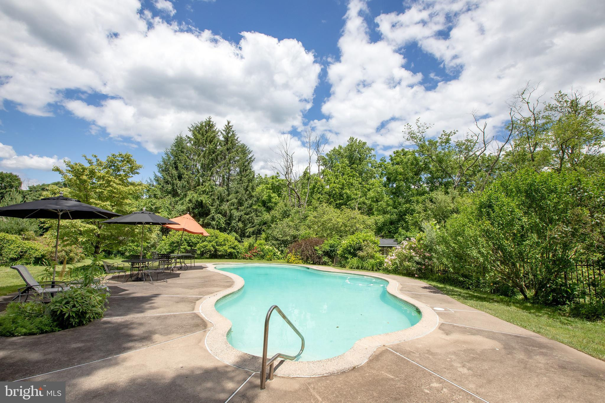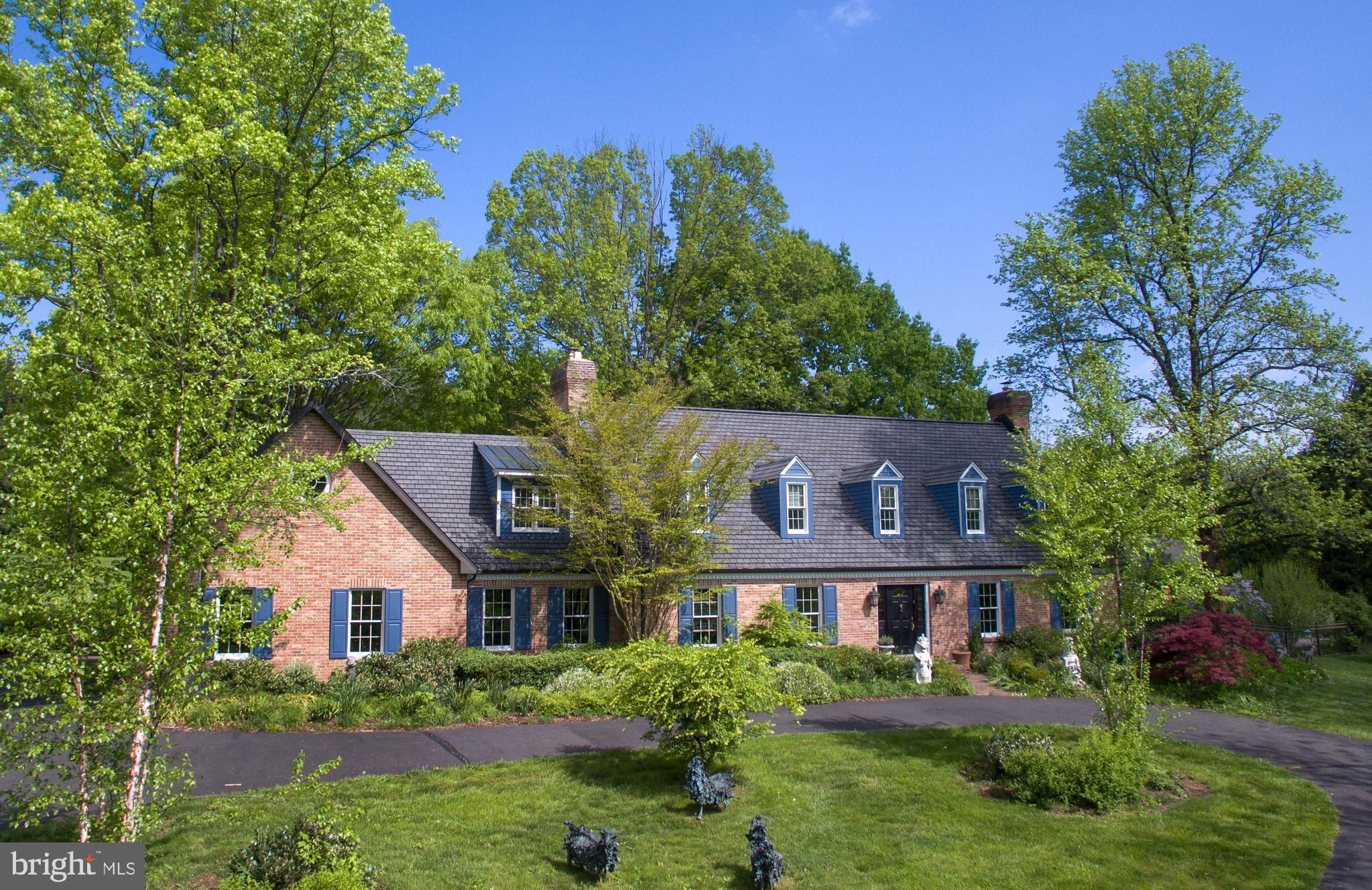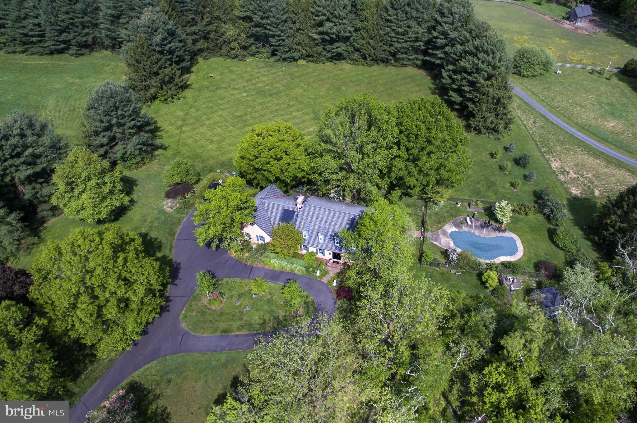 Fronting historic Cuttalossa Rd and creek, this charming Solebury Township cape cod home features a private setting down a winding, tree-lined drive and neatly perched on the top of a hill. Just minutes from downtown New Hope, Doylestown, and primary roads to the greater Delaware Valley area, this flexible floor plan includes a main level full bathroom and the opportunity for a main level master/in-law suite/fifth bedroom or second home office, with quality materials and finishes throughout, and a large flat backyard and swimming pool. Classic Bucks County is celebrated with the over-sized dining room's custom mural painting by local artist Carol Nagel, reflecting the bucolic views out of nearly every window in the home. Show off your cooking skills in the custom kitchen with two wall ovens and Dacor stove top with vent, Sub Zero refrigerator with cabinet-matching front, wine refrigerator, and more all accented by beautiful granite countertops. Two wood-burning fireplaces (one in the office, one in the living room) enhance both work and play areas, and a "four seasons" sun room with high ceilings and skylights offer the perfect entertaining transition area between inside and out: flowing into the rear patio and pergola-covered Trex porch and swimming pool areas. Upstairs are four nicely sized bedrooms, updated bathrooms, and a sprawling master suite with dual private bathrooms, two walk in closets, and private WC's off the shared glass door walk-in shower. Green geothermal HVAC, in the highly desirable NHS school district, and walking distance to the popular local orchard business, enjoy the many historic villages of Solebury just a stone's throw away such as Lumberville on the river and Carversville just minutes away.