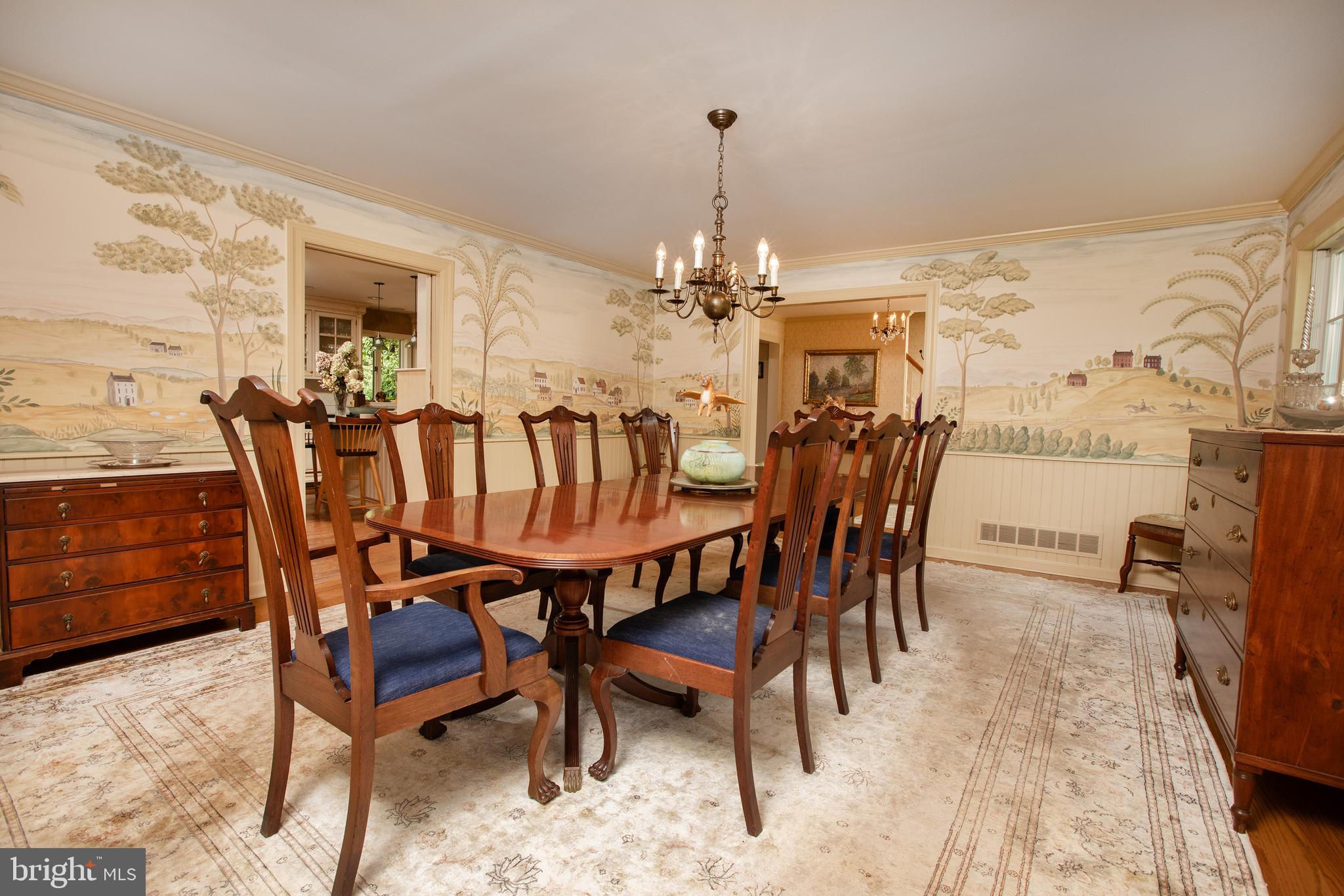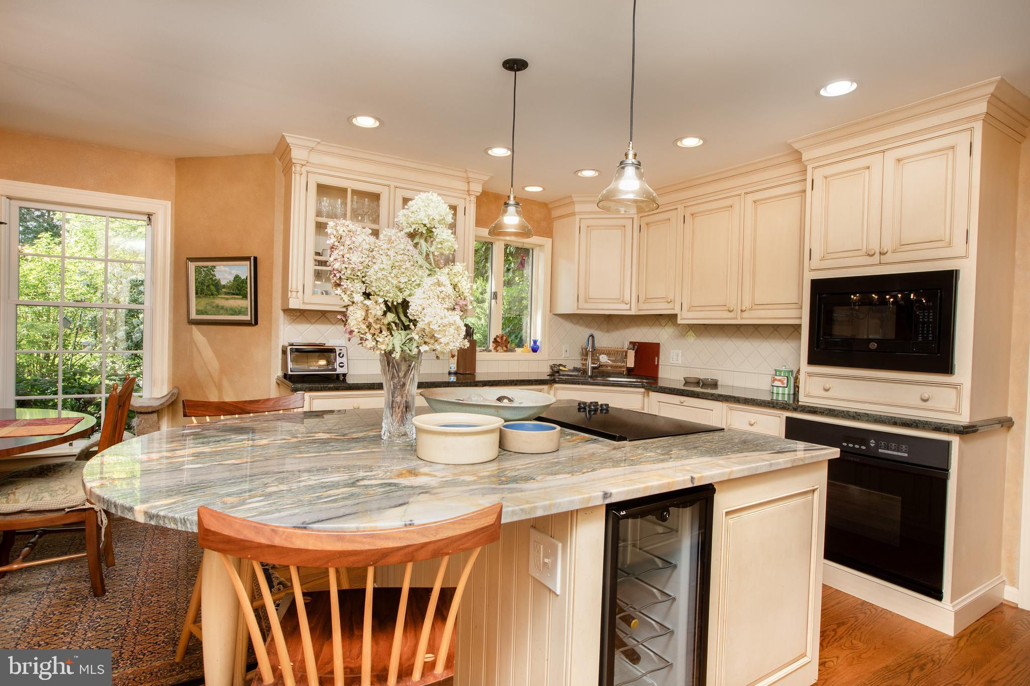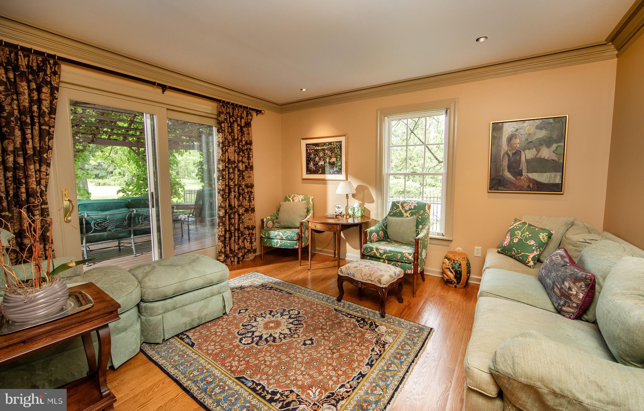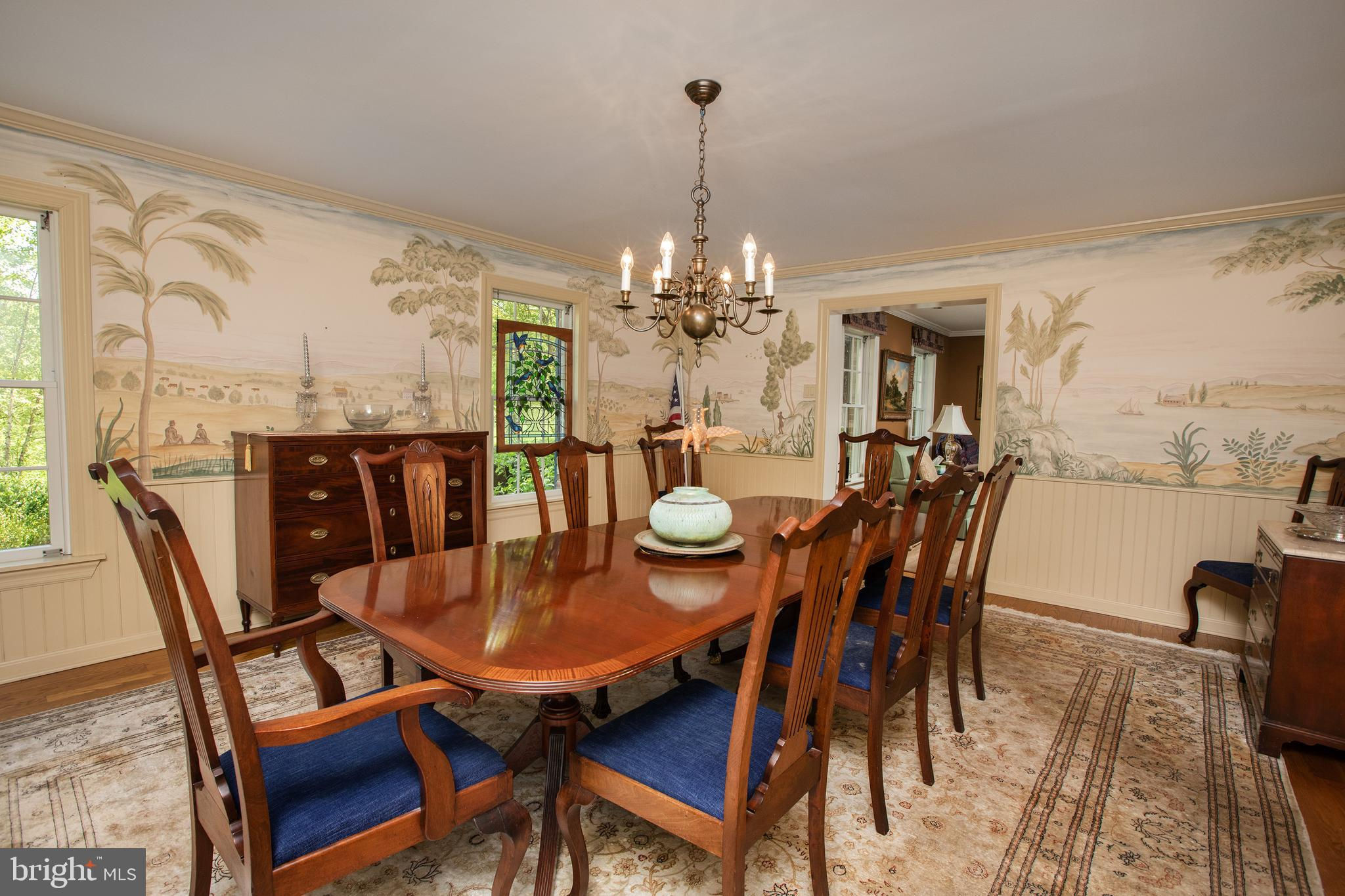 Fronting historic Cuttalossa Rd and creek, this charming Solebury Township cape cod home features a private setting down a winding, tree-lined drive and neatly perched on the top of a hill. Just minutes from downtown New Hope, Doylestown, and primary roads to the greater Delaware Valley area, this flexible floor plan includes a main level full bathroom and the opportunity for a main level master/in-law suite/fifth bedroom or second home office, with quality materials and finishes throughout, and a large flat backyard and swimming pool. Classic Bucks County is celebrated with the over-sized dining room's custom mural painting by local artist Carol Nagel, reflecting the bucolic views out of nearly every window in the home. Show off your cooking skills in the custom kitchen with two wall ovens and Dacor stove top with vent, Sub Zero refrigerator with cabinet-matching front, wine refrigerator, and more all accented by beautiful granite countertops. Two wood-burning fireplaces (one in the office, one in the living room) enhance both work and play areas, and a "four seasons" sun room with high ceilings and skylights offer the perfect entertaining transition area between inside and out: flowing into the rear patio and pergola-covered Trex porch and swimming pool areas. Upstairs are four nicely sized bedrooms, updated bathrooms, and a sprawling master suite with dual private bathrooms, two walk in closets, and private WC's off the shared glass door walk-in shower. Green geothermal HVAC, in the highly desirable NHS school district, and walking distance to the popular local orchard business, enjoy the many historic villages of Solebury just a stone's throw away such as Lumberville on the river and Carversville just minutes away.