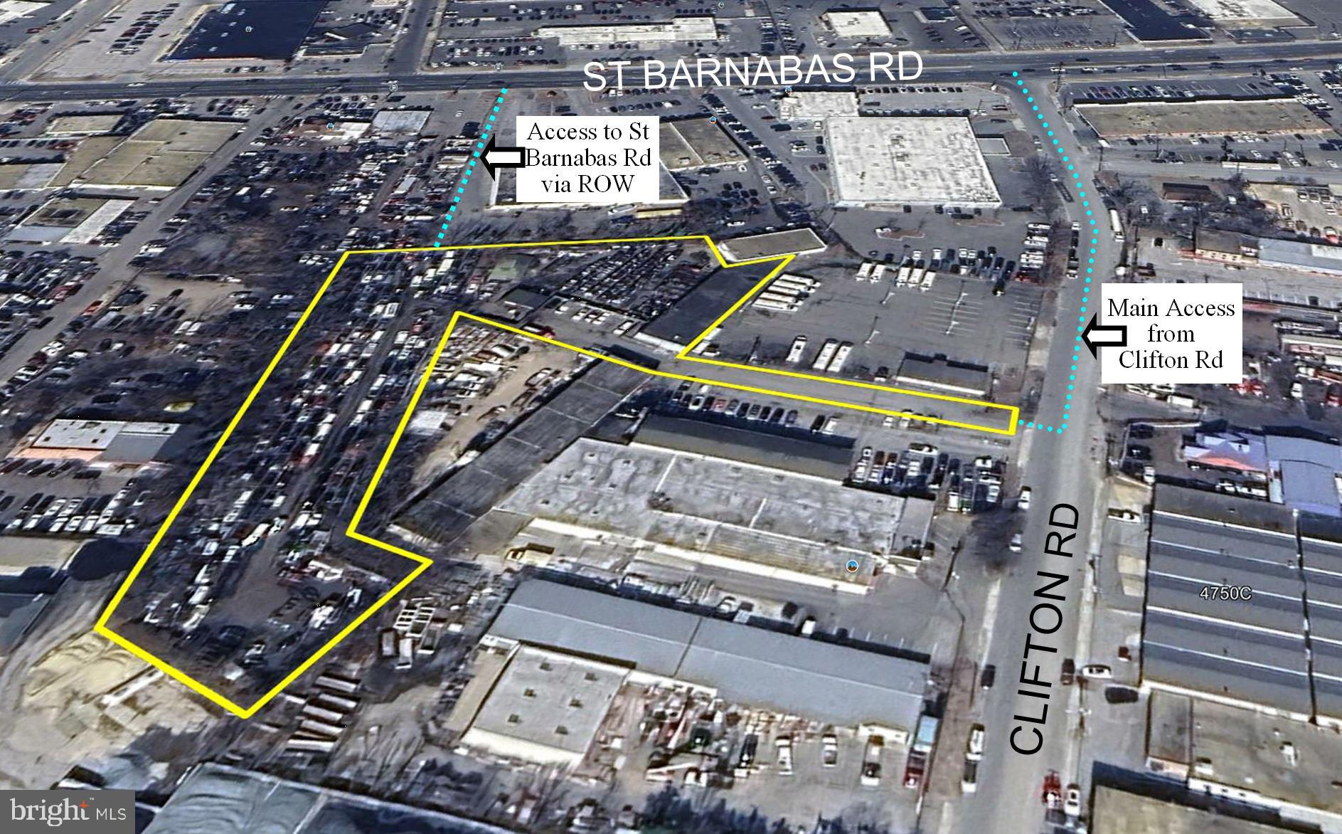 Here’s a Big Opportunity to buy paved Industrially zoned property Inside the Beltway. 2 Contiguous properties to be sold together= 4743 Clifton Rd & 4630 St Barnabas Rd, Temple Hills, MD 20748. Tax Account #s 0493734 & 0649590 The property totals 2.33 acres of IE ZONED land, off of MD Route 414 St Barnabas Rd., inside the Beltway. There is a 6,720 SF Building on the Clifton Rd parcel, as well as a 1,074 SF auto workshop, and a 630 SF storage structure, totaling 8,424 SF. Both properties are currently being used to store cars. The Sellers will need some time to remove all vehicular inventory. Call us for details. This is a highly sought after zoning that permits MANY uses, which includes commercial vehicular sales, rentals, repairs and maintenance. Brand new 5-Ton HVAC System installed in 2025.