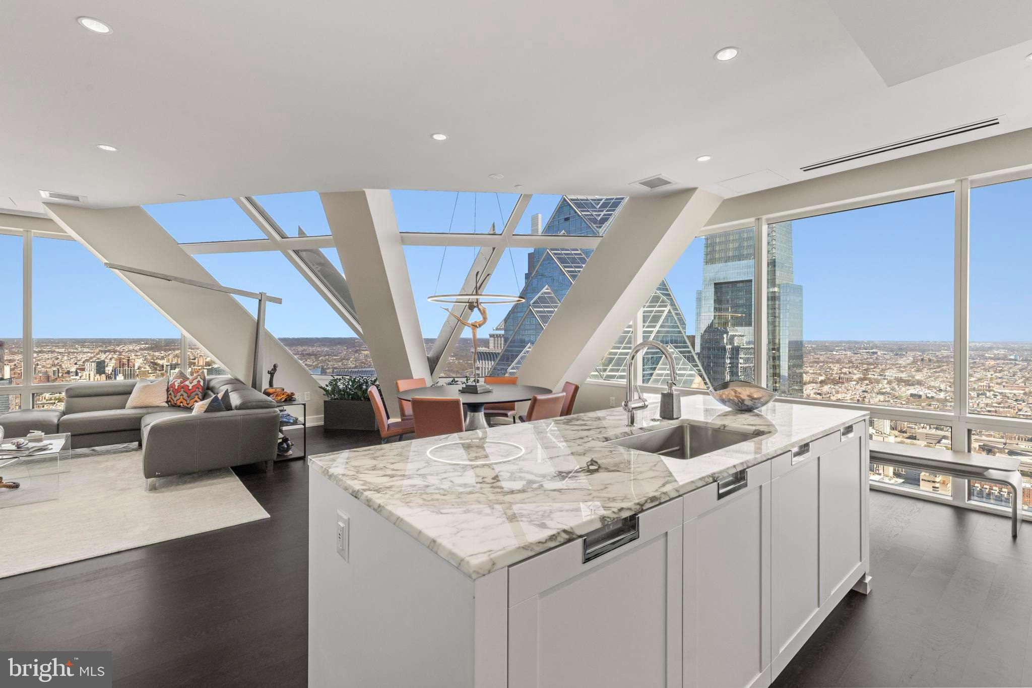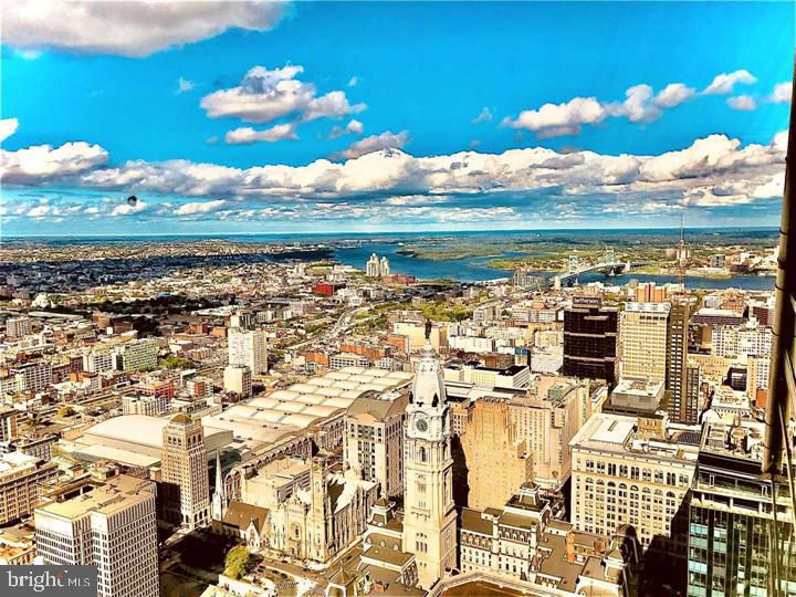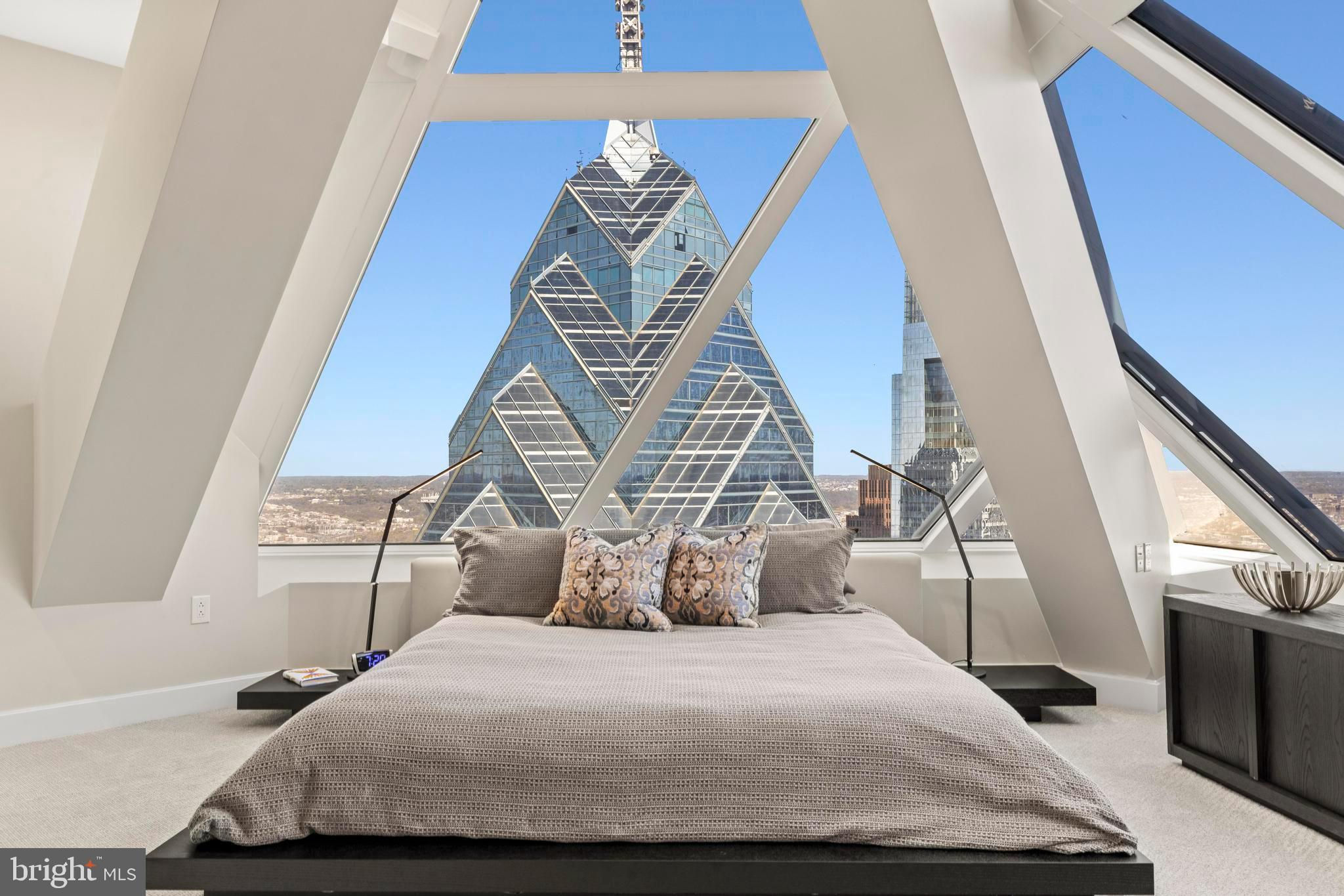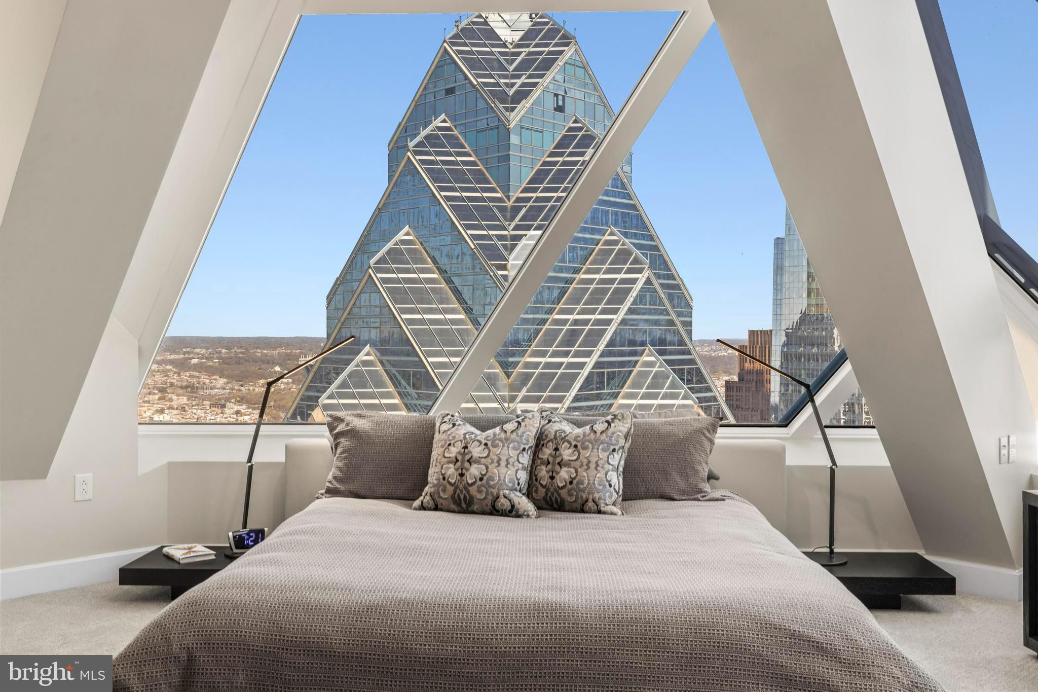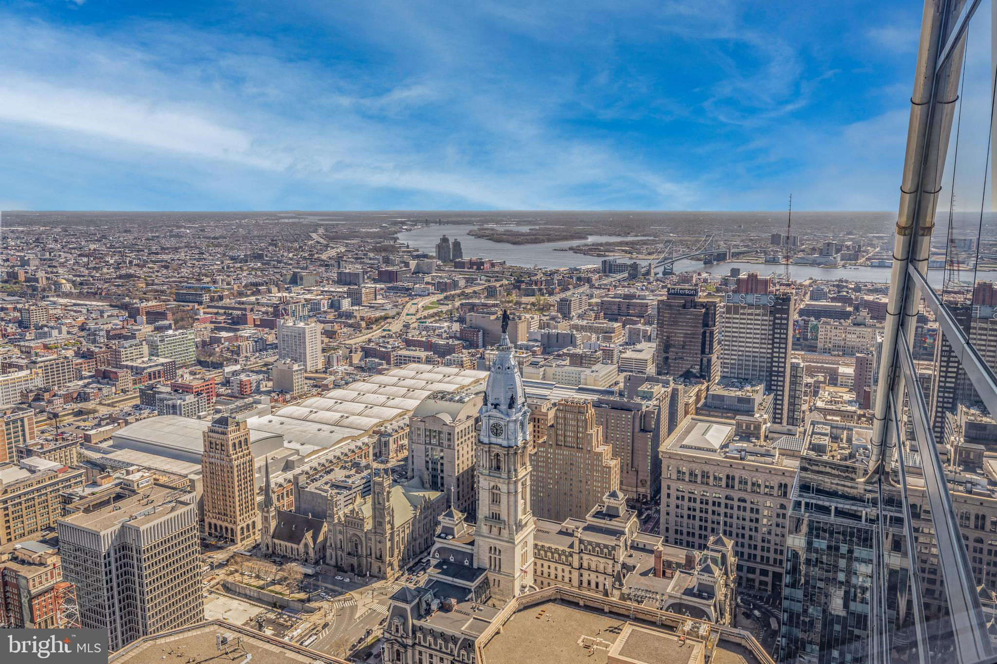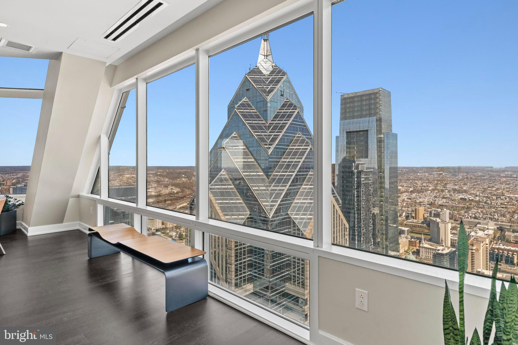 Once in lifetime opportunity to own a stunning penthouse in the sky on the 56th floor, at the pinnacle of Philadelphia’s iconic Two Liberty place. The 56th floor, one of only four exclusive residences, was custom built with top of the line architectural design and unparalleled luxury. This penthouse in the sky soars above the city with panoramic views of both the Schuylkill and Delaware Rivers. One Liberty skyscraper sits directly across from the primary suite, creating a headboard you have to see to believe. Dazzling sunrises and sunsets stretch as far as the eye can see. This is Pennsylvania's second-highest residential floor, your very own observatory in the sky. This residence showcases dramatic convex and concave floor-to-ceiling windows, nearly 11 feet tall, creating a unique sensation of floating above the city. Designed for both elegance and privacy, the expansive open-concept great room anchors the home with a statement curved glass window and gas fireplace, ideally separating the primary suite from the guest suite or private den. The chef’s kitchen features premium Miele appliances, a Sub-Zero refrigerator, wine cooler, and sleek Italian Snaidero cabinetry, a perfect blend of modern design and function. The primary suite is a visual work of art, wrapped in towering convex glass panels and complete with a custom dressing area and oversized walk-in closet. The spa-inspired en-suite bath is appointed in warm grey and white marble, with a soaking tub, glass-enclosed shower, and dual vanities. The spacious second bedroom or den includes another luxurious marble bathroom and oversized closet. A marble powder room and separate laundry area are discreetly tucked away, allowing for effortless living and entertaining. Residents of Two Liberty Place enjoy world-class amenities including 24-hour doorman and security, valet and self-parking with unlimited guest access, private storage, and direct access to the Shops at Liberty Place. The newly reimagined 37th-floor amenity level, renovated in March 2024, offers a state-of-the-art fitness center, pool, massage room, yoga studio, sauna, steam room, business center, multiple boardrooms, and an expansive entertaining lounge with breathtaking city views. There is also a 3rd floor amenity space with breakfast to lunch served from 730am-330pm exclusively for residents and employees of the building. This penthouse was the original developer’s model unit, showcasing the finest finishes and attention to detail, and has been impeccably maintained. Offered unfurnished, with furnishings negotiable. Luxury. Privacy. Iconic Views. Welcome to the pinnacle of Philadelphia living.