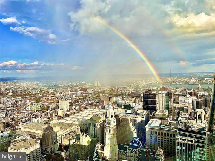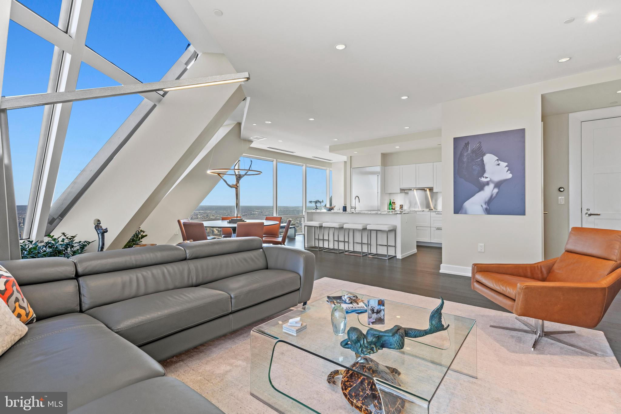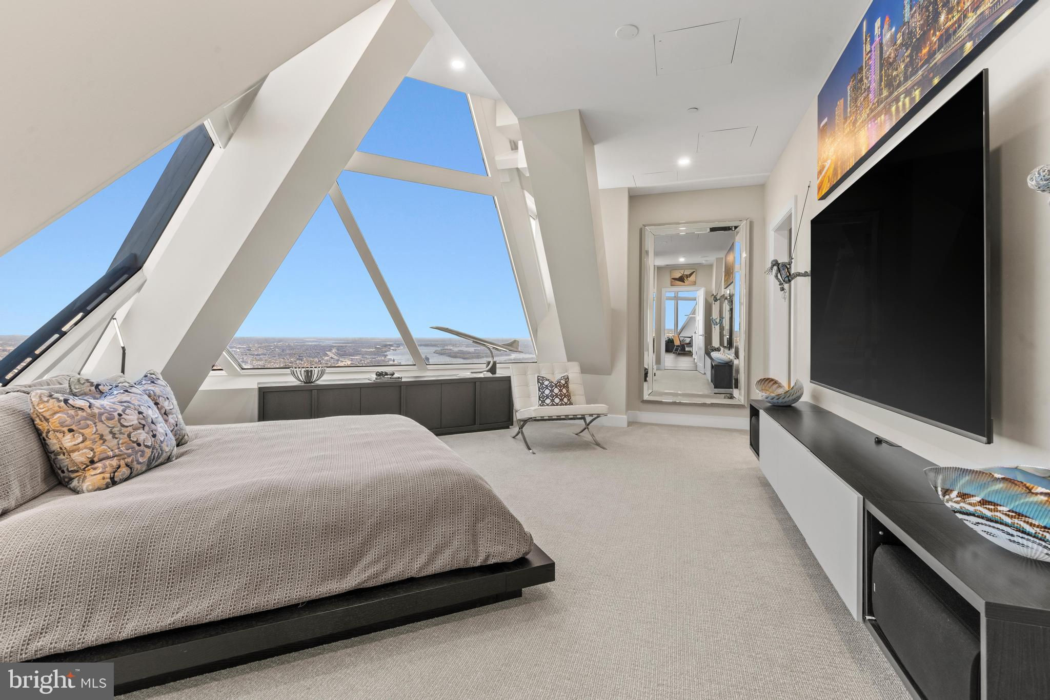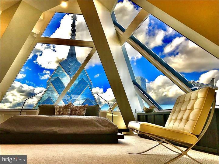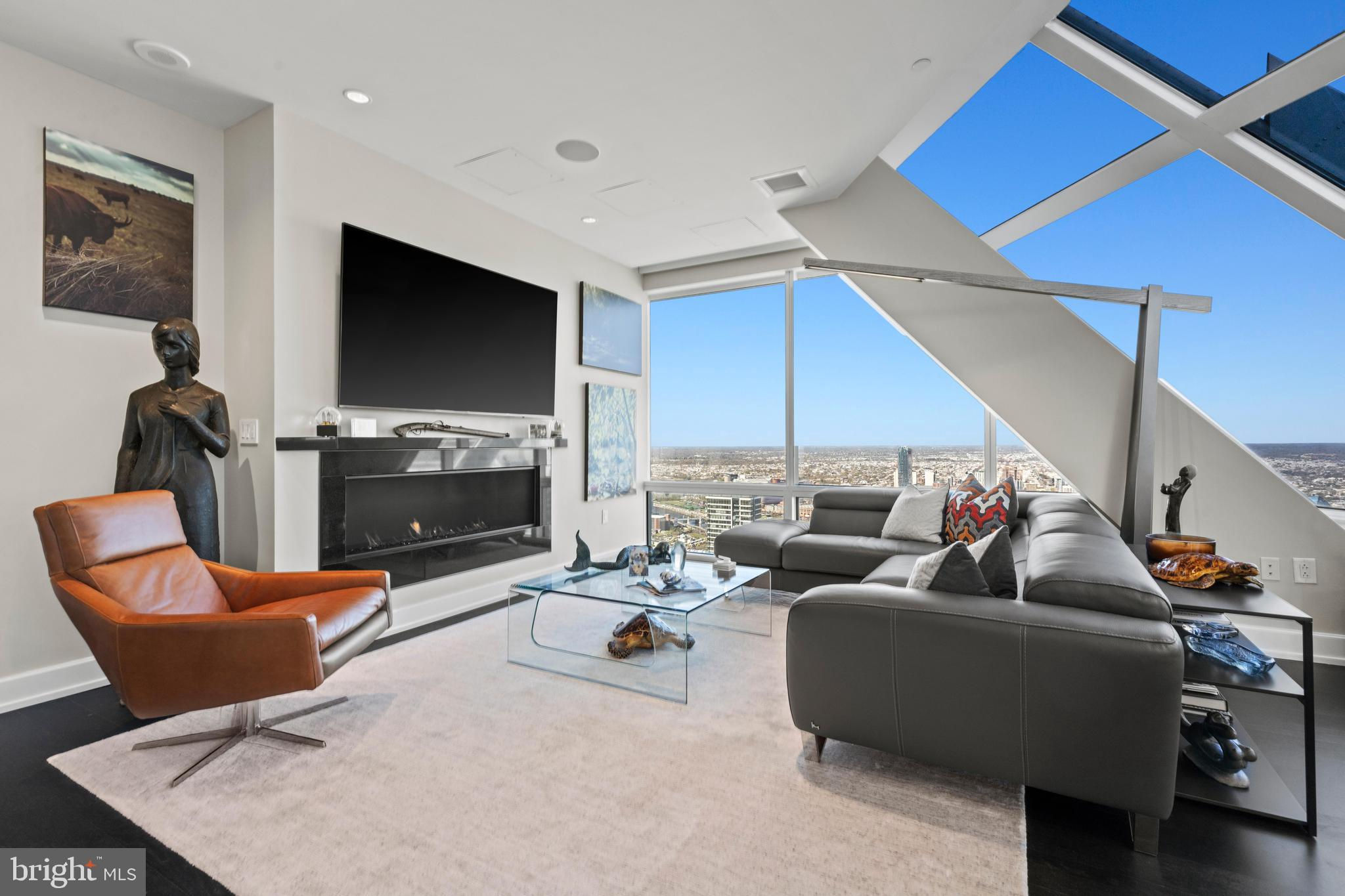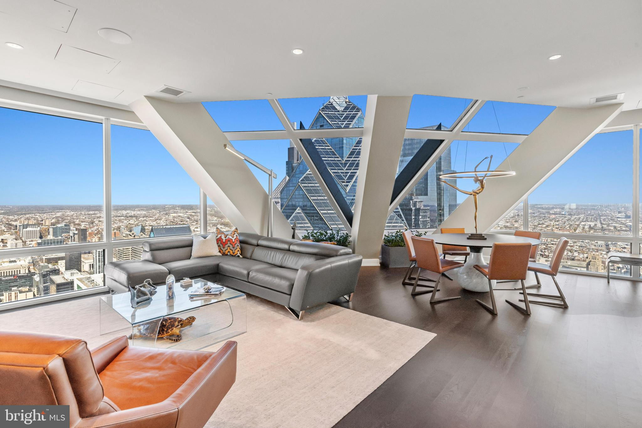 Once in lifetime opportunity to own a stunning penthouse in the sky on the 56th floor, at the pinnacle of Philadelphia’s iconic Two Liberty place. The 56th floor, one of only four exclusive residences, was custom built with top of the line architectural design and unparalleled luxury. This penthouse in the sky soars above the city with panoramic views of both the Schuylkill and Delaware Rivers. One Liberty skyscraper sits directly across from the primary suite, creating a headboard you have to see to believe. Dazzling sunrises and sunsets stretch as far as the eye can see. This is Pennsylvania's second-highest residential floor, your very own observatory in the sky. This residence showcases dramatic convex and concave floor-to-ceiling windows, nearly 11 feet tall, creating a unique sensation of floating above the city. Designed for both elegance and privacy, the expansive open-concept great room anchors the home with a statement curved glass window and gas fireplace, ideally separating the primary suite from the guest suite or private den. The chef’s kitchen features premium Miele appliances, a Sub-Zero refrigerator, wine cooler, and sleek Italian Snaidero cabinetry, a perfect blend of modern design and function. The primary suite is a visual work of art, wrapped in towering convex glass panels and complete with a custom dressing area and oversized walk-in closet. The spa-inspired en-suite bath is appointed in warm grey and white marble, with a soaking tub, glass-enclosed shower, and dual vanities. The spacious second bedroom or den includes another luxurious marble bathroom and oversized closet. A marble powder room and separate laundry area are discreetly tucked away, allowing for effortless living and entertaining. Residents of Two Liberty Place enjoy world-class amenities including 24-hour doorman and security, valet and self-parking with unlimited guest access, private storage, and direct access to the Shops at Liberty Place. The newly reimagined 37th-floor amenity level, renovated in March 2024, offers a state-of-the-art fitness center, pool, massage room, yoga studio, sauna, steam room, business center, multiple boardrooms, and an expansive entertaining lounge with breathtaking city views. There is also a 3rd floor amenity space with breakfast to lunch served from 730am-330pm exclusively for residents and employees of the building. This penthouse was the original developer’s model unit, showcasing the finest finishes and attention to detail, and has been impeccably maintained. Offered unfurnished, with furnishings negotiable. Luxury. Privacy. Iconic Views. Welcome to the pinnacle of Philadelphia living.