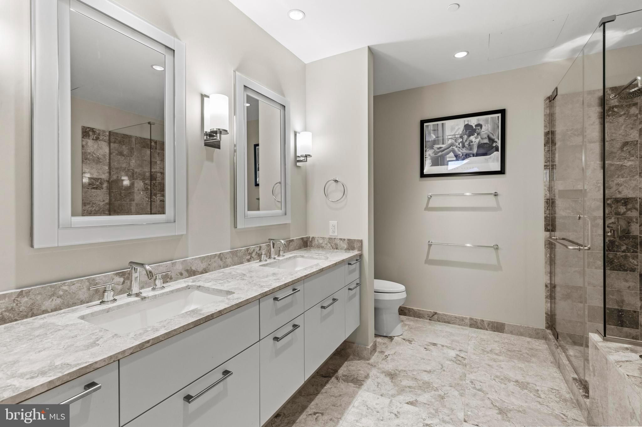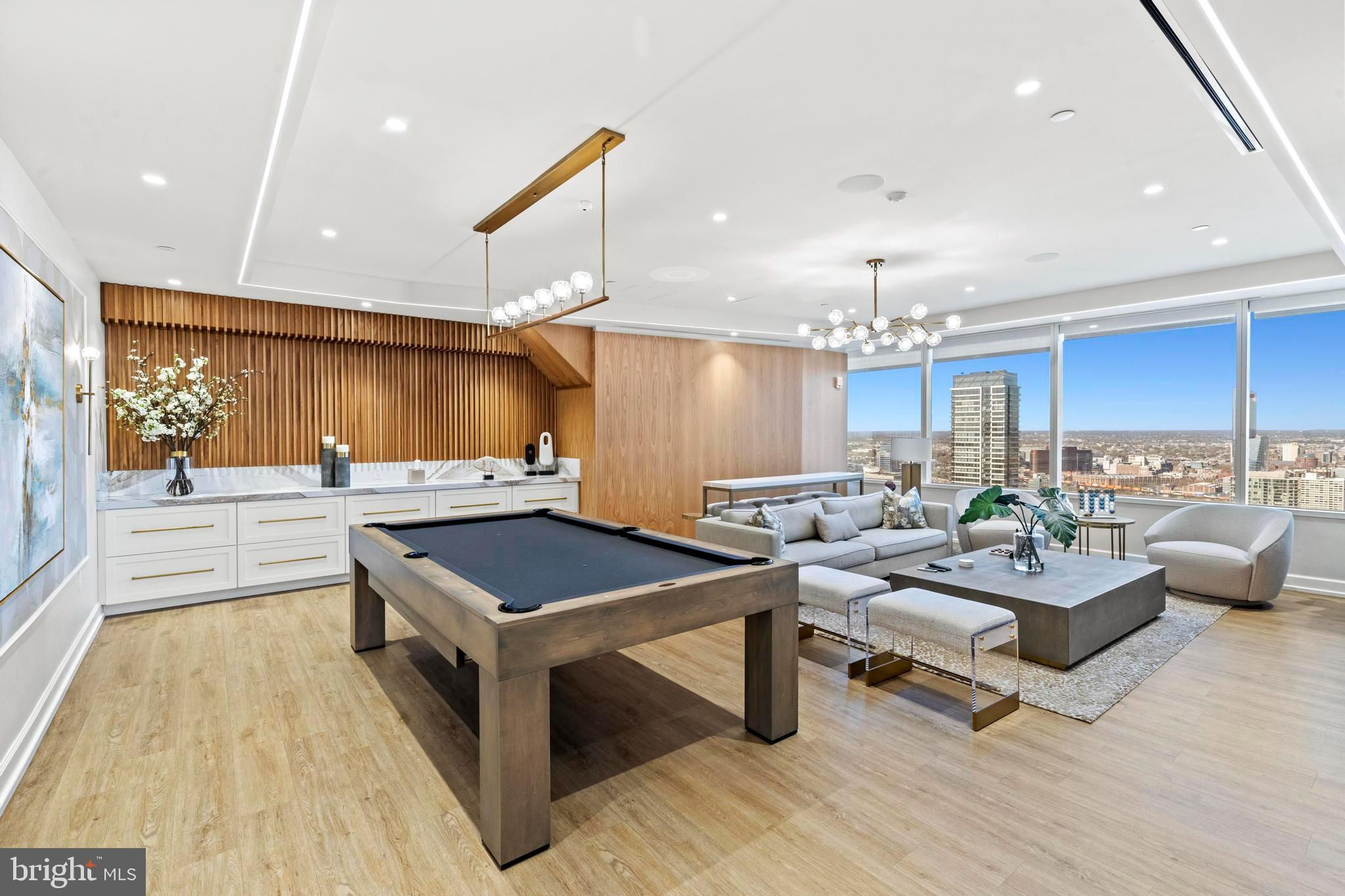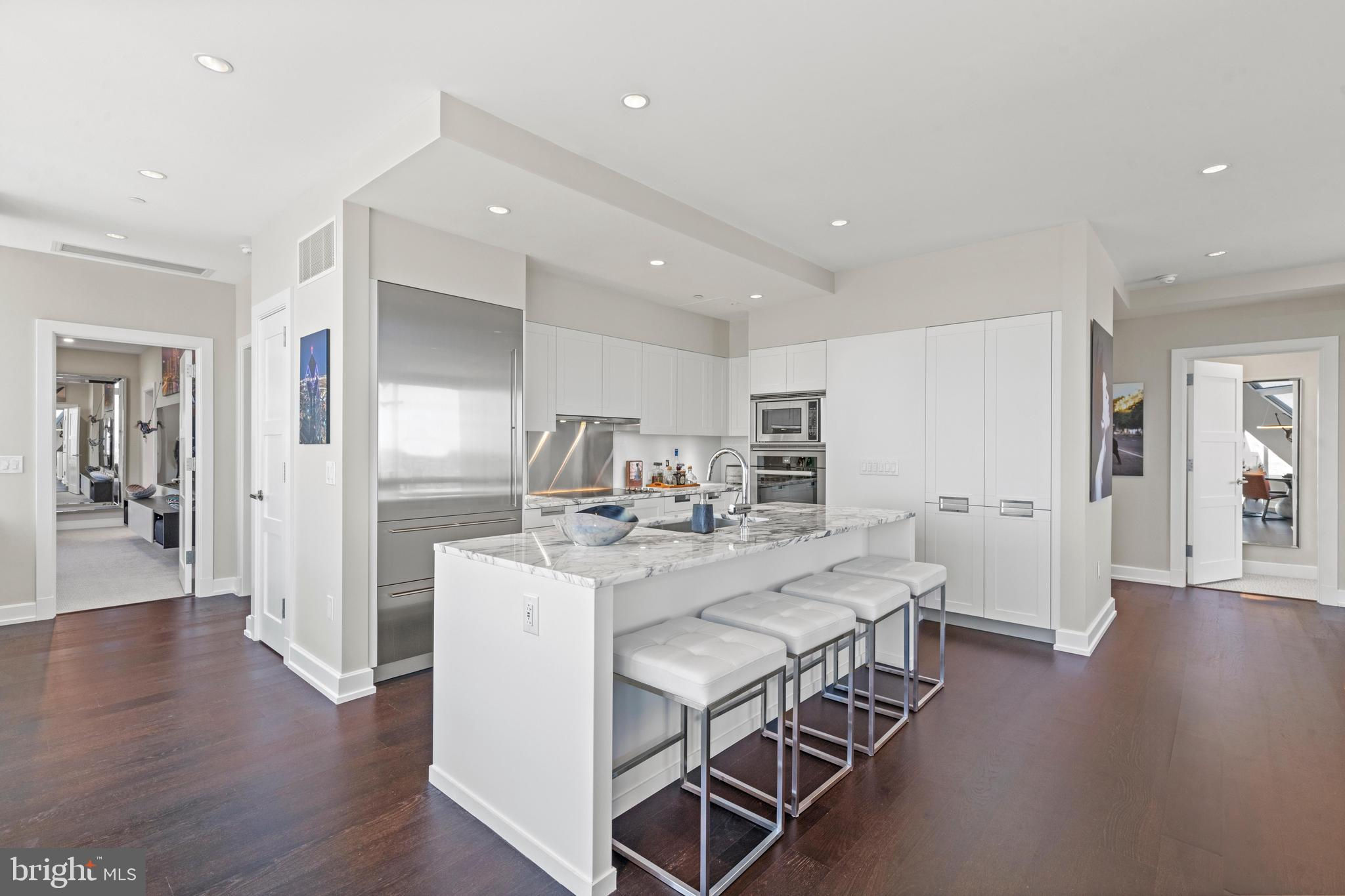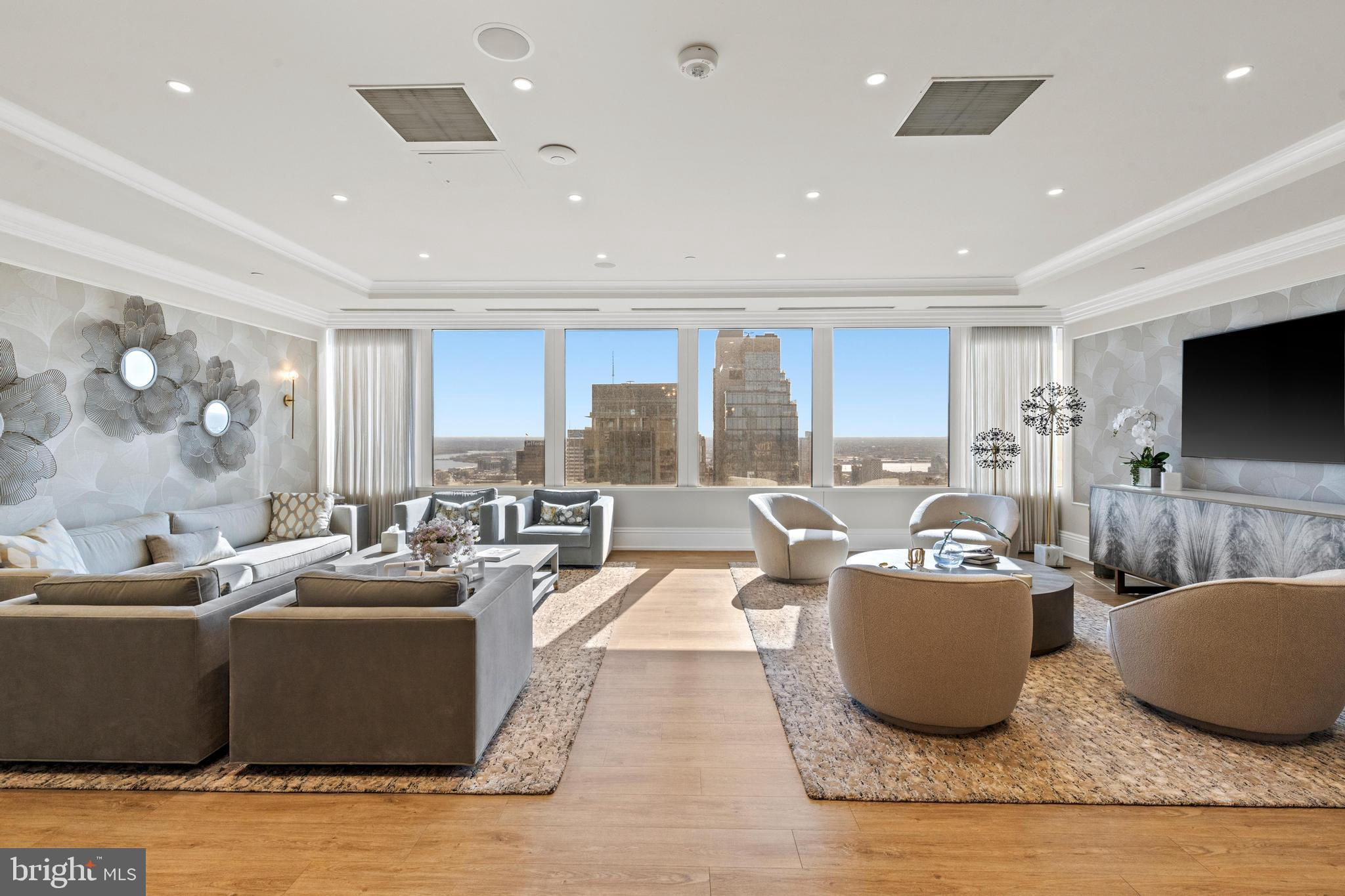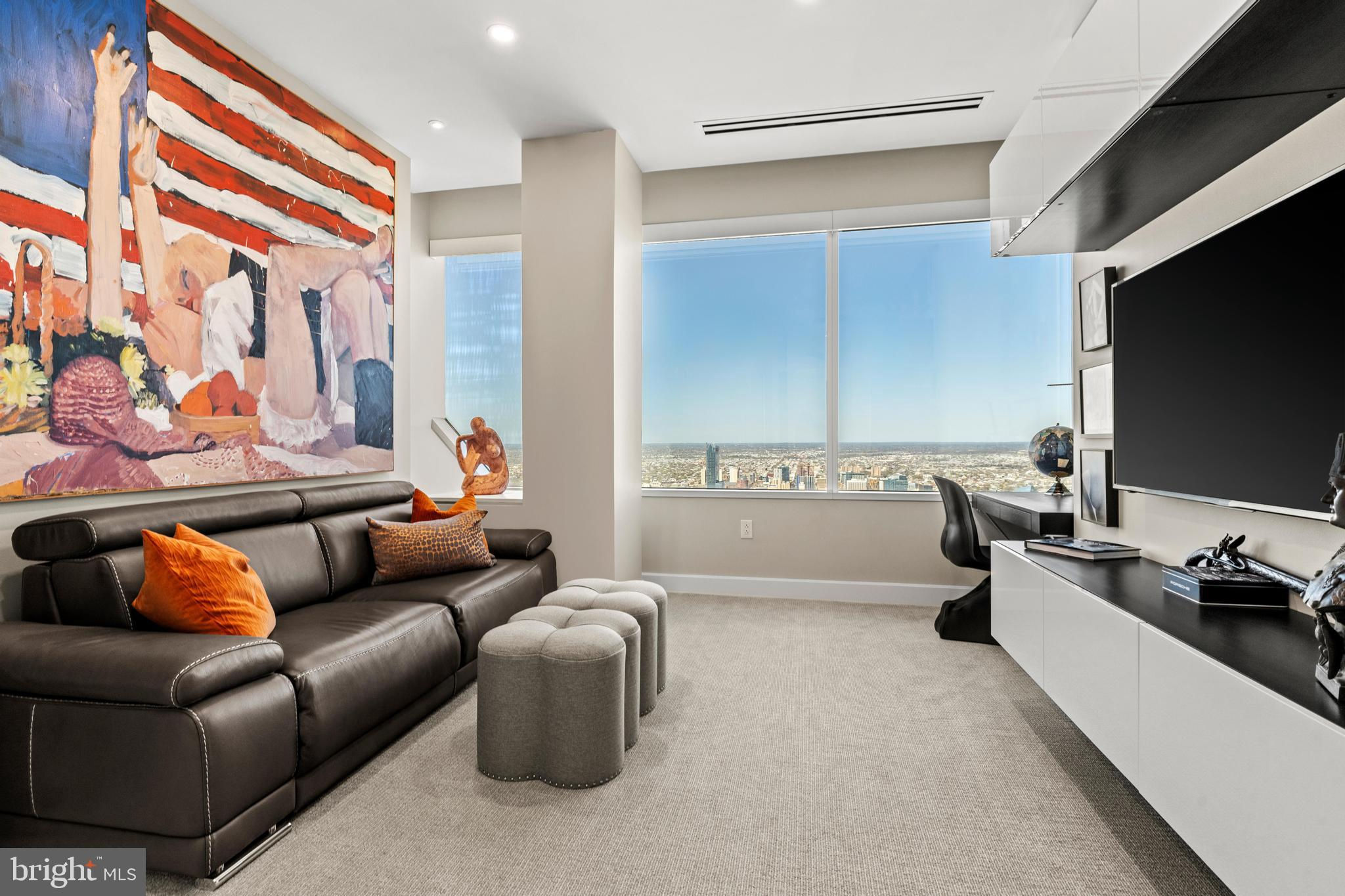 Once in lifetime opportunity to own a stunning penthouse in the sky on the 56th floor, at the pinnacle of Philadelphia’s iconic Two Liberty place. The 56th floor, one of only four exclusive residences, was custom built with top of the line architectural design and unparalleled luxury. This penthouse in the sky soars above the city with panoramic views of both the Schuylkill and Delaware Rivers. One Liberty skyscraper sits directly across from the primary suite, creating a headboard you have to see to believe. Dazzling sunrises and sunsets stretch as far as the eye can see. This is Pennsylvania's second-highest residential floor, your very own observatory in the sky. This residence showcases dramatic convex and concave floor-to-ceiling windows, nearly 11 feet tall, creating a unique sensation of floating above the city. Designed for both elegance and privacy, the expansive open-concept great room anchors the home with a statement curved glass window and gas fireplace, ideally separating the primary suite from the guest suite or private den. The chef’s kitchen features premium Miele appliances, a Sub-Zero refrigerator, wine cooler, and sleek Italian Snaidero cabinetry, a perfect blend of modern design and function. The primary suite is a visual work of art, wrapped in towering convex glass panels and complete with a custom dressing area and oversized walk-in closet. The spa-inspired en-suite bath is appointed in warm grey and white marble, with a soaking tub, glass-enclosed shower, and dual vanities. The spacious second bedroom or den includes another luxurious marble bathroom and oversized closet. A marble powder room and separate laundry area are discreetly tucked away, allowing for effortless living and entertaining. Residents of Two Liberty Place enjoy world-class amenities including 24-hour doorman and security, valet and self-parking with unlimited guest access, private storage, and direct access to the Shops at Liberty Place. The newly reimagined 37th-floor amenity level, renovated in March 2024, offers a state-of-the-art fitness center, pool, massage room, yoga studio, sauna, steam room, business center, multiple boardrooms, and an expansive entertaining lounge with breathtaking city views. There is also a 3rd floor amenity space with breakfast to lunch served from 730am-330pm exclusively for residents and employees of the building. This penthouse was the original developer’s model unit, showcasing the finest finishes and attention to detail, and has been impeccably maintained. Offered unfurnished, with furnishings negotiable. Luxury. Privacy. Iconic Views. Welcome to the pinnacle of Philadelphia living.