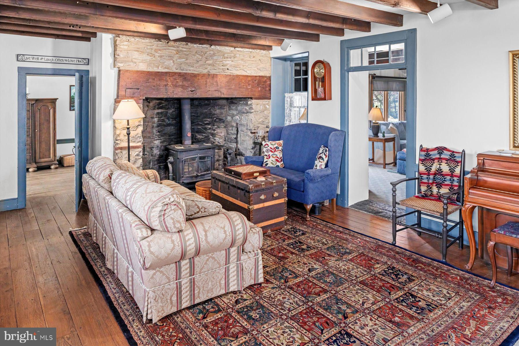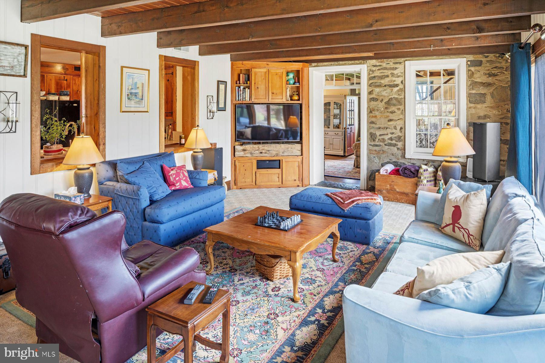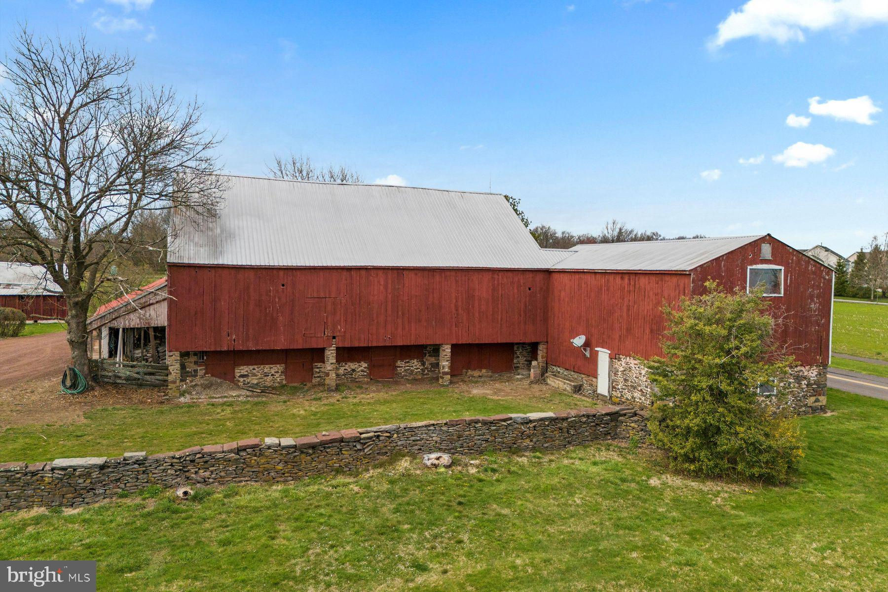 This quintessential 1830s Bucks County stone farmhouse on 8.03 acres with coveted barn, corn-crib, pond, and in-ground swimming pool boasts 4 bedrooms, 4 bathrooms, with tasteful updates throughout. The relative openness of the first floor - an anomaly in old farmhouses – allows for the living and entertaining spaces to flow easily, while still managing to maintain the wonderful level of warmth and coziness that you would expect from a traditional stone farmhouse. The kitchen is large and inviting with a huge stone fireplace, warm woods, and plenty of light that shines through the wall of windows in the large den, dining, and living room. It is bookended with a spacious laundry room/mud room combination, amply sized powder room, and butler’s pantry. There is a great and private flexible space at the bottom of the main staircase that could be used as an office, gym, or additional space for when, undoubtably, guests come to visit you. The primary suite is an unbelievable treat in this antique home: spacious, tons of natural light, large walk-in closet, and a spa-like bathroom with double vanity, soaking tub, and walk-in shower. The three additional bedrooms are charming with wonderful views and share two additional hall bathrooms. The outdoor spaces here will make your home the favorite gathering place for your friends and family - whether it be to make use of the barn that offers endless possibilities for all your hobbies, cars, trucks, four wheelers, and toys, or to enjoy barbecues on the large back patio while enjoying the pool (gunite and refurbished within the last few years) area that offers expansive and panoramic views of the Bucks County countryside. The home has its own solar panels that generate electricity to off-set traditional electric and the property is undergoing hook-up to public sewer. All this just minutes from downtown Doylestown, 25 minutes to New Hope, and easy access to 611 & 413; this property offers the perfect balance of tranquility, country living, and convenience.