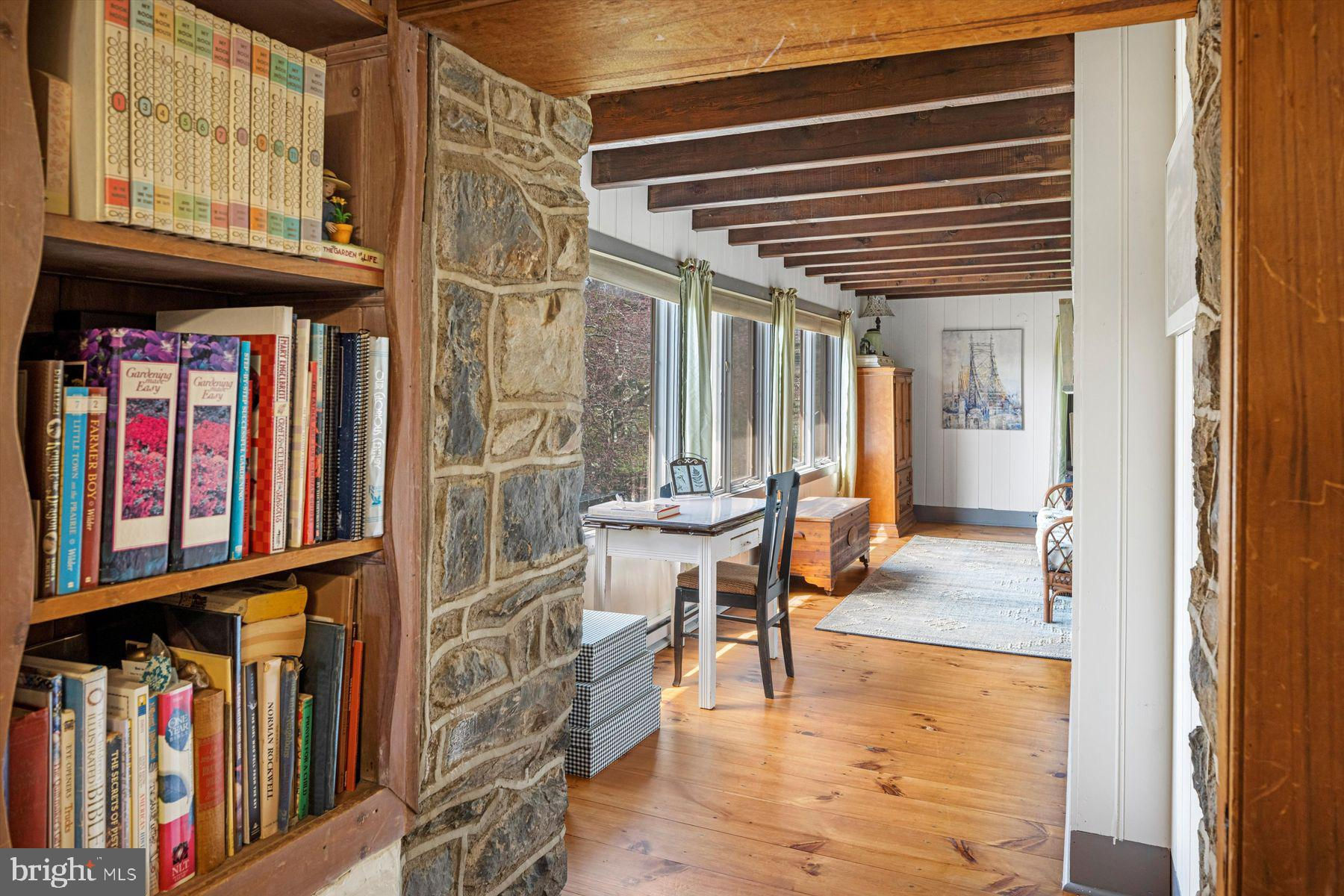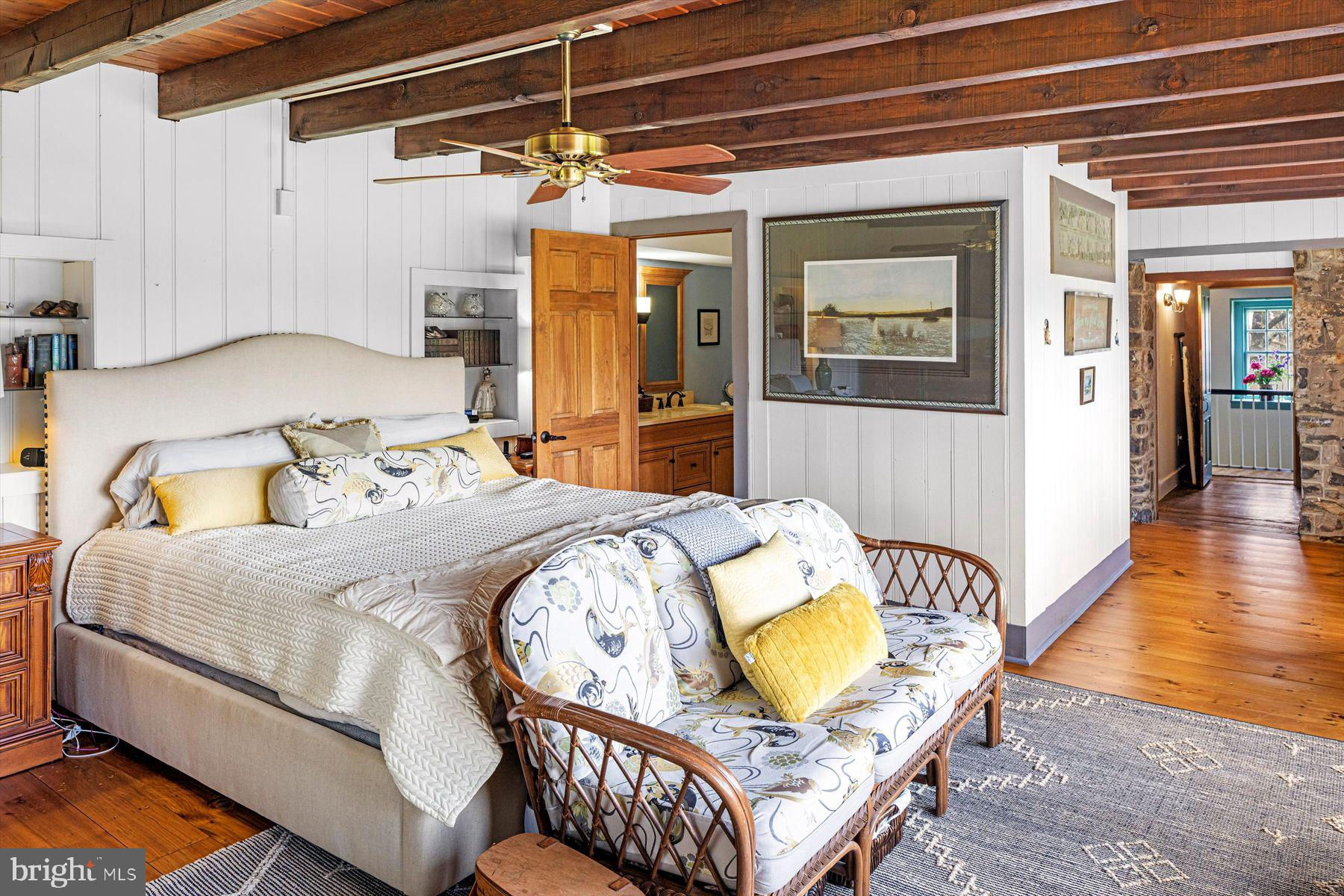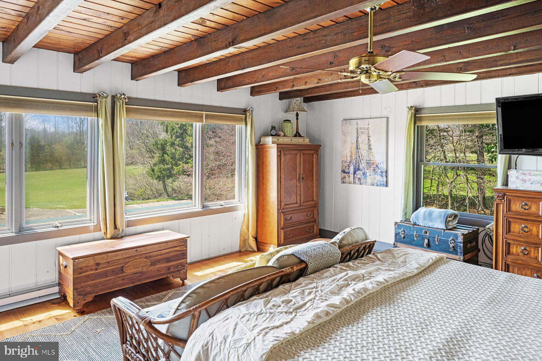 This quintessential 1830s Bucks County stone farmhouse on 8.03 acres with coveted barn, corn-crib, pond, and in-ground swimming pool boasts 4 bedrooms, 4 bathrooms, with tasteful updates throughout. The relative openness of the first floor - an anomaly in old farmhouses – allows for the living and entertaining spaces to flow easily, while still managing to maintain the wonderful level of warmth and coziness that you would expect from a traditional stone farmhouse. The kitchen is large and inviting with a huge stone fireplace, warm woods, and plenty of light that shines through the wall of windows in the large den, dining, and living room. It is bookended with a spacious laundry room/mud room combination, amply sized powder room, and butler’s pantry. There is a great and private flexible space at the bottom of the main staircase that could be used as an office, gym, or additional space for when, undoubtably, guests come to visit you. The primary suite is an unbelievable treat in this antique home: spacious, tons of natural light, large walk-in closet, and a spa-like bathroom with double vanity, soaking tub, and walk-in shower. The three additional bedrooms are charming with wonderful views and share two additional hall bathrooms. The outdoor spaces here will make your home the favorite gathering place for your friends and family - whether it be to make use of the barn that offers endless possibilities for all your hobbies, cars, trucks, four wheelers, and toys, or to enjoy barbecues on the large back patio while enjoying the pool (gunite and refurbished within the last few years) area that offers expansive and panoramic views of the Bucks County countryside. The home has its own solar panels that generate electricity to off-set traditional electric and the property is undergoing hook-up to public sewer. All this just minutes from downtown Doylestown, 25 minutes to New Hope, and easy access to 611 & 413; this property offers the perfect balance of tranquility, country living, and convenience.