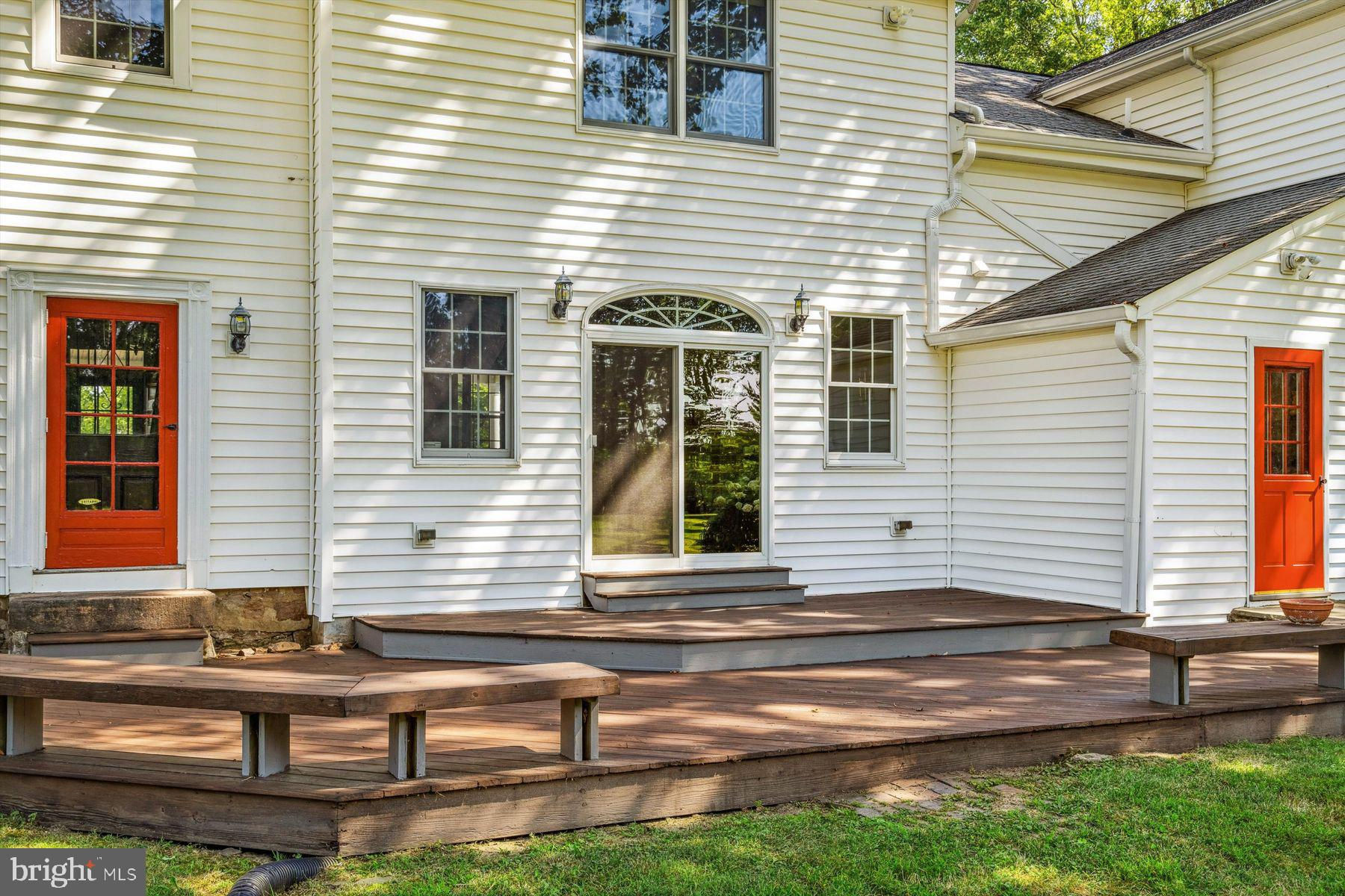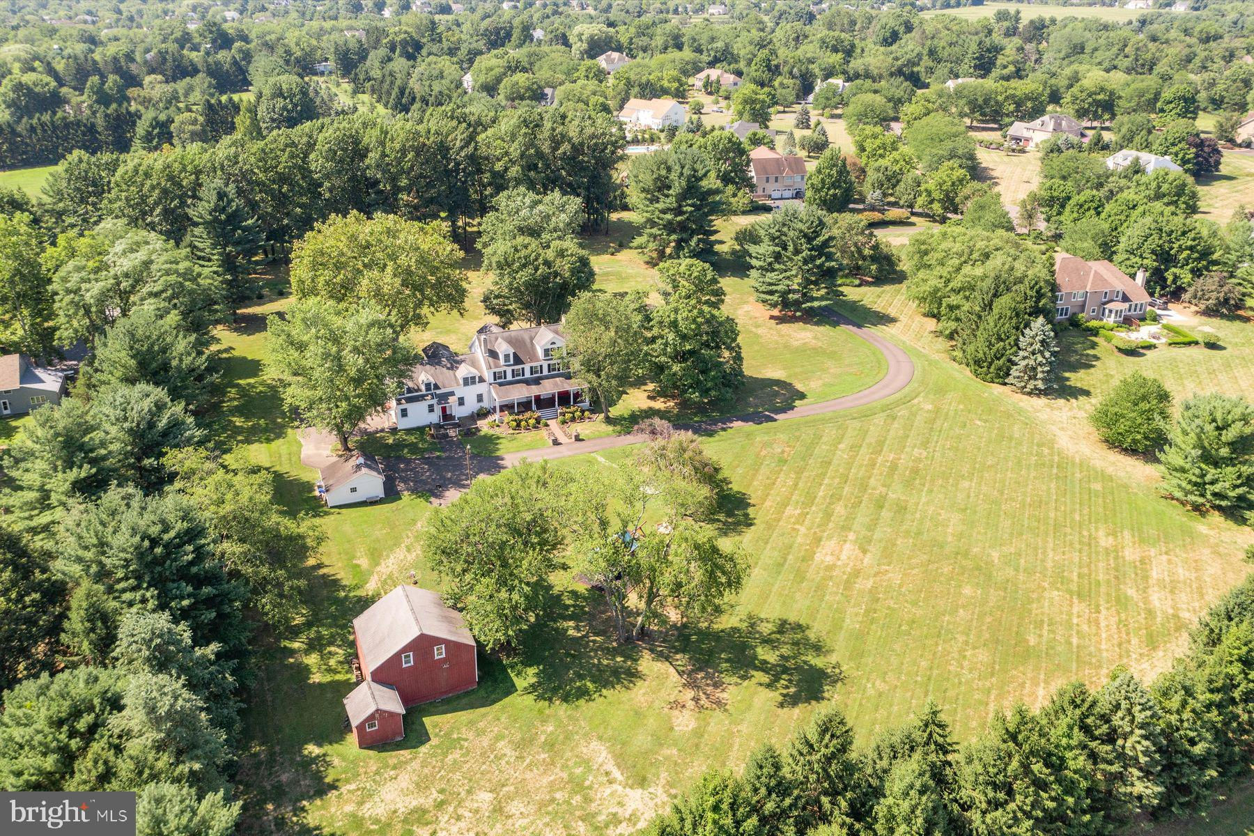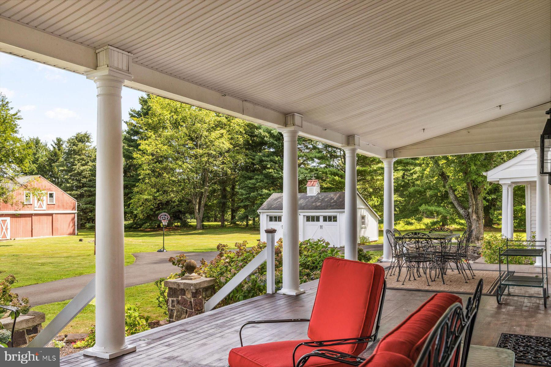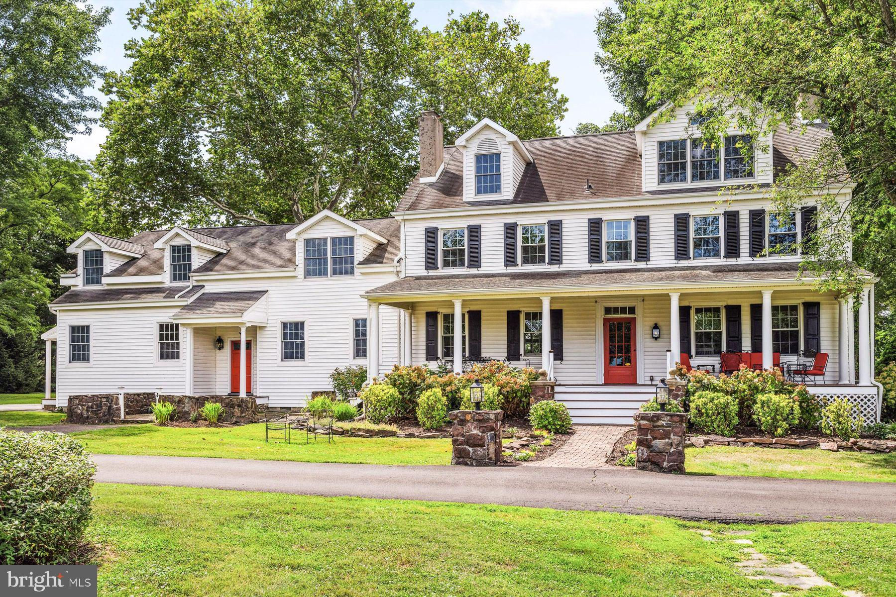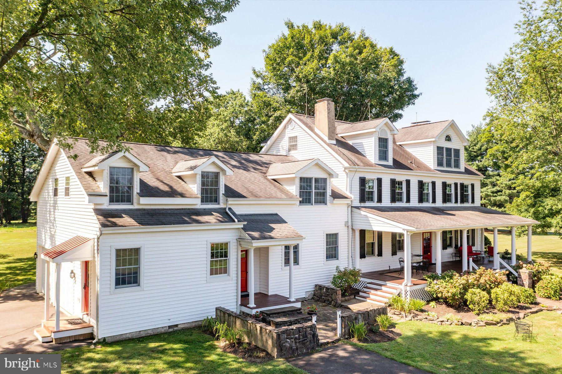 Welcome to the Captain Lambert Homestead (Circa 1780's and 1810), a picturesque retreat nestled at the end of a private cul-de-sac and enveloped by preserved land on three sides. Newer additions and renovations in 2002 and 2023 have further enhanced this special home. The captivating property, with its long private driveway approach, exudes charm from the moment you arrive. The inviting covered front porch, adorned with elegant mahogany floors, sets the tone for the warmth and character that awaits inside. It is difficult to describe the sheer enjoyment of entertaining on the porch in all seasons, while watching sports and fun activities on the sweeping lawn and taking in views of breathtaking sunsets from a very special perch! This exceptional residence offers a blend of classic charm and modern sophistication across a flexible floor plan with 5 bedrooms, 3.1 bathrooms, and a wealth of versatile spaces. The earlier section of the home features handsome old pine board flooring, original millwork, built-ins, and multiple decorative fireplaces, showcasing the beauty of yesteryear. The newer addition (2002) and significant renovation (2023) provide living space up and down, and a stunning kitchen with Italian Carrara marble countertops, a huge island with deep drawer storage, ship lap and barn wood detailing, and elegant DeVol brass lighting fixtures with push-button switches. The kitchen is complemented by a breakfast/TV room, with sliding doors to an inviting deck, a convenient mudroom entrance with handy storage, a large coat closet, and an adjacent laundry and powder room. Top-of-the-line stainless steel appliances include a Bertazzoni range with 6 induction burners, Bosch refrigerator, Bosch dishwasher, and a wine refrigerator. Numerous pantries, deep drawer storage, and even a child-friendly area have been well thought out. The center island with barn beam support has ample room for seating and invites everyone into the kitchen- a fabulous space to welcome all! And through the kitchen is access to the former attached 2-car garage- now converted into a home gym with specialty vinyl "wood" flooring, a split system HVAC, and oversized white board- a great home gym but offering a perfect space for a home office or potential additional living quarters. The second-floor houses generous bedrooms, many featuring handsome pine board floors. A spacious game/playroom with built-in shelving provides endless possibilities for any type of gathering, while a large, secluded room could serve as in-law quarters, a music room, or an art studio. The two hallway tile baths on this level, one with a tub, offer convenience and comfort. The third floor is dedicated to a luxurious main bedroom or guest suite, finished with cherry flooring, complete with a private office or potential dressing closet and a full bath featuring a footed tub and shower with frameless shower doors. A large picture window with window seat showcases views of the expansive property. Step outside to discover a sprawling lawn that ensures privacy and tranquility. The rear deck and front porch are ideal for entertaining, and there's ample space for a pool. The charming red barn with open beams and a floored second level, along with a detached 2-car garage, provide additional storage and functionality. Situated in prestigious Upper Makefield Township, this property offers access to the desirable Valley View neighborhood while maintaining a serene, bucolic lifestyle. And if you enjoy farming, this property is ideal for gardens or crops. Its excellent location provides easy access to Princeton, I-95, Philadelphia, airports, and shore points. With low taxes, zoned HVAC, great care, attention to detail, and unparalleled charm, this exceptional property is a once-in-a-lifetime opportunity to own the homestead of your dreams. Don't miss your chance to make this extraordinary property your forever home.