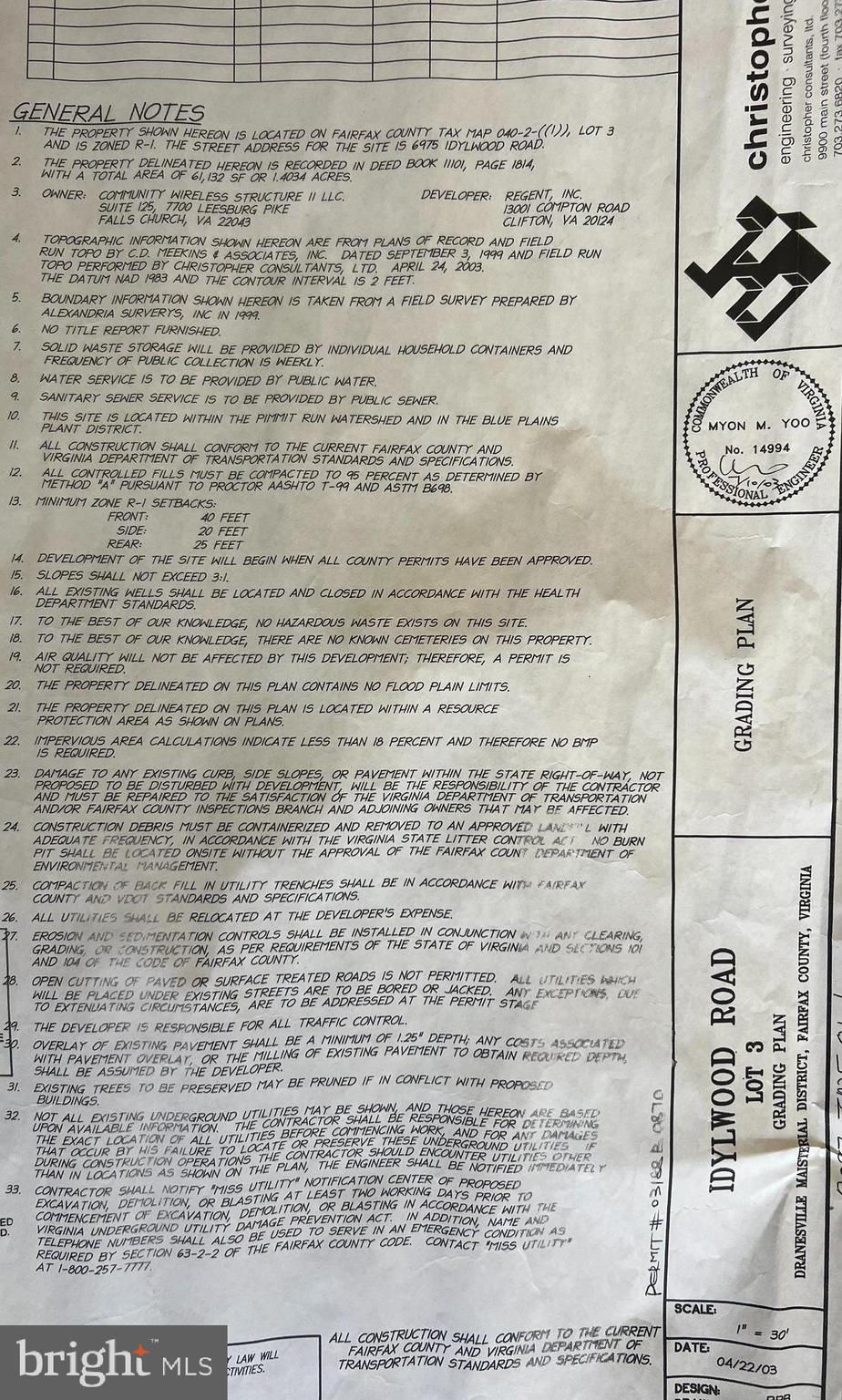 PRICE ADJUSTMENT - AMAZING VALUE - LOT/LAND WITH POSSIBILITY FOR SUBDIVISION - PERFECT FOR DEVELOPERS - Located in the Lee Highway community of Falls Church. Adjacent to the Dulles Toll Road, VA-695, and I-66. Prime location, minutes to Tysons Corner, Dulles Airport, Wolf Trap, Inova Fairfax Medical Campus Reston Town Center, and the DC/MD line. ** 1.40-acre lot, 61,132 square feet - The lot is connected to public utilities (single family home on site) - Documents provided: Plat, Topographic Map, Vicinity Map, General Notes from the Developer from 2003, Impervious Area & Tree Cover Calculations, Aerial View.** RESIDENTIAL HOME ON SITE IS TENANT OCCUPIED AND CANNOT BE VIEWED.