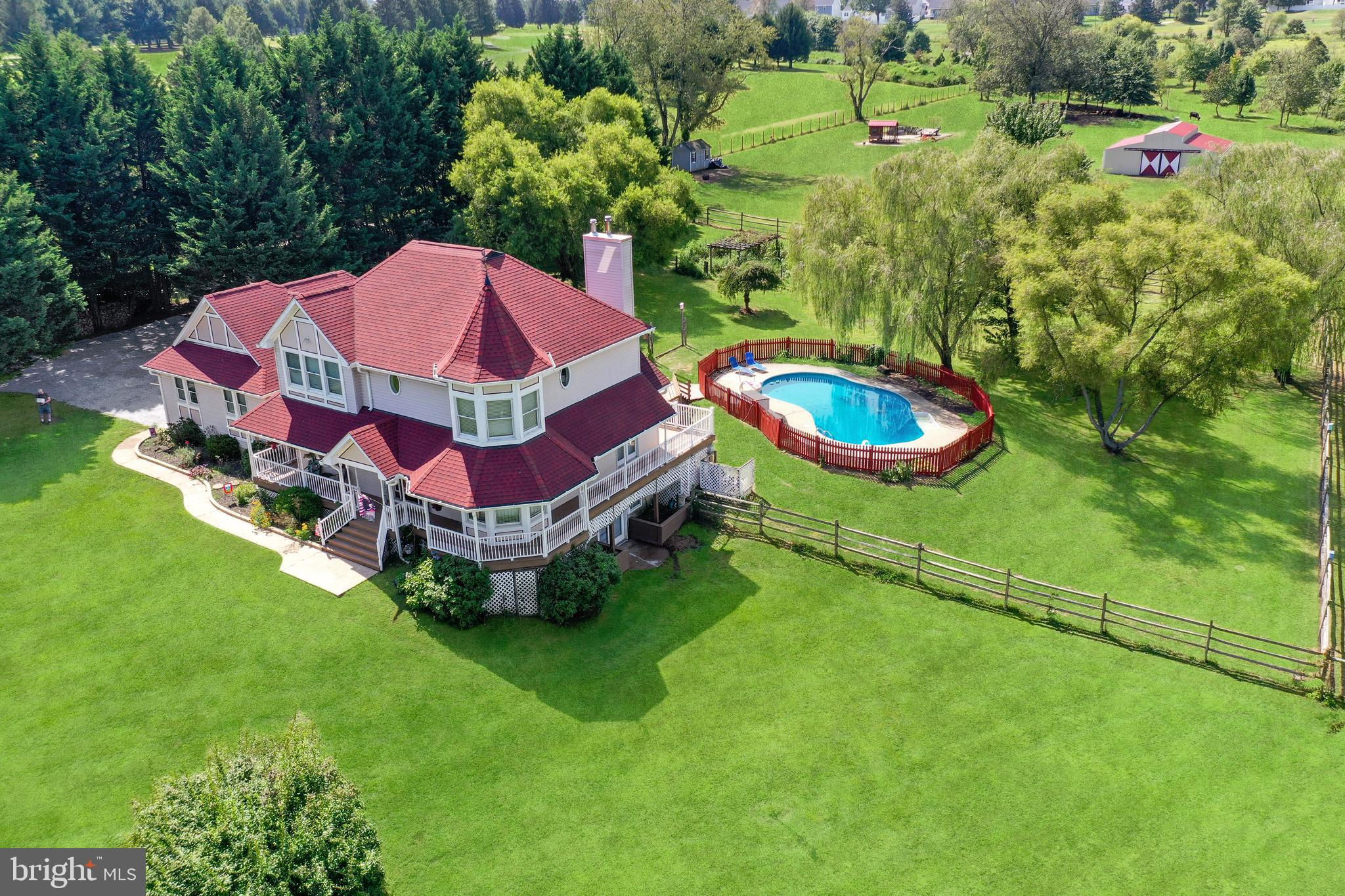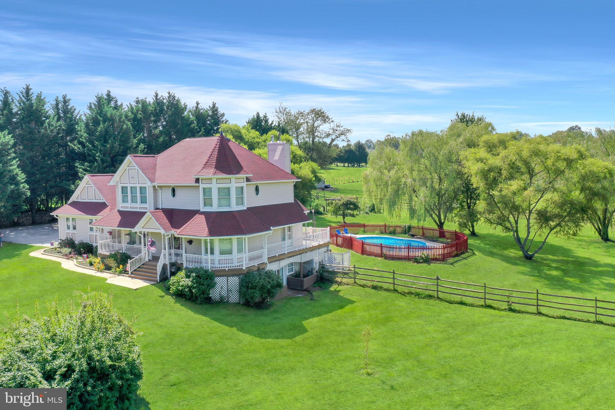 Victorian Home on 14+ acres with in-ground swimming pool, pond, 36' x 36' horse barn, approximately 12 acres fenced pasture, storage shed, and walk-in shed. Brazilian cherry hardwood floors in herringbone pattern * wood stove with decorative tile backsplash in living room * primary bedroom suite with bow window, walk-in closet, private bath with soaking, jetted tub and separate corner enclosed shower * lower level family room/recreation room with LVP wood tone flooring and pellet stove. Covered front and side wrap-around porch with access to breakfast nook and living room. Rear wooden deck and patio with built-in benches. Updates include roof (2019), gutters (2020), HVAC (2018), pool liner (2019), and pool filter (2019). Within minutes to APG, I-95, Rte. #22, retail shops and restaurants. See MLS documents for detailed brochure and Seller disclosures.