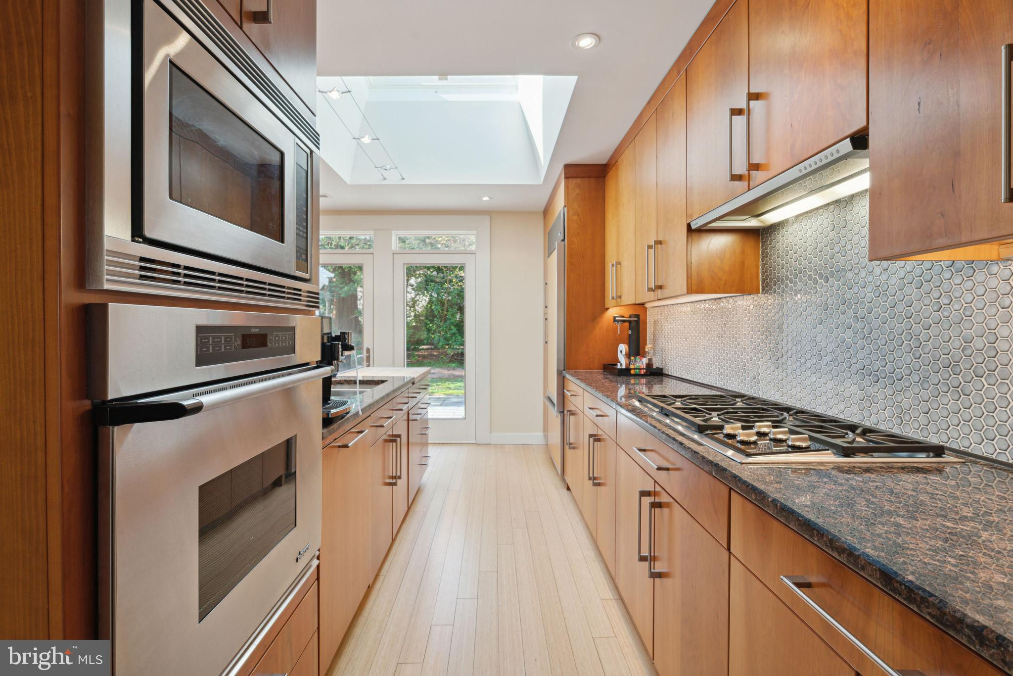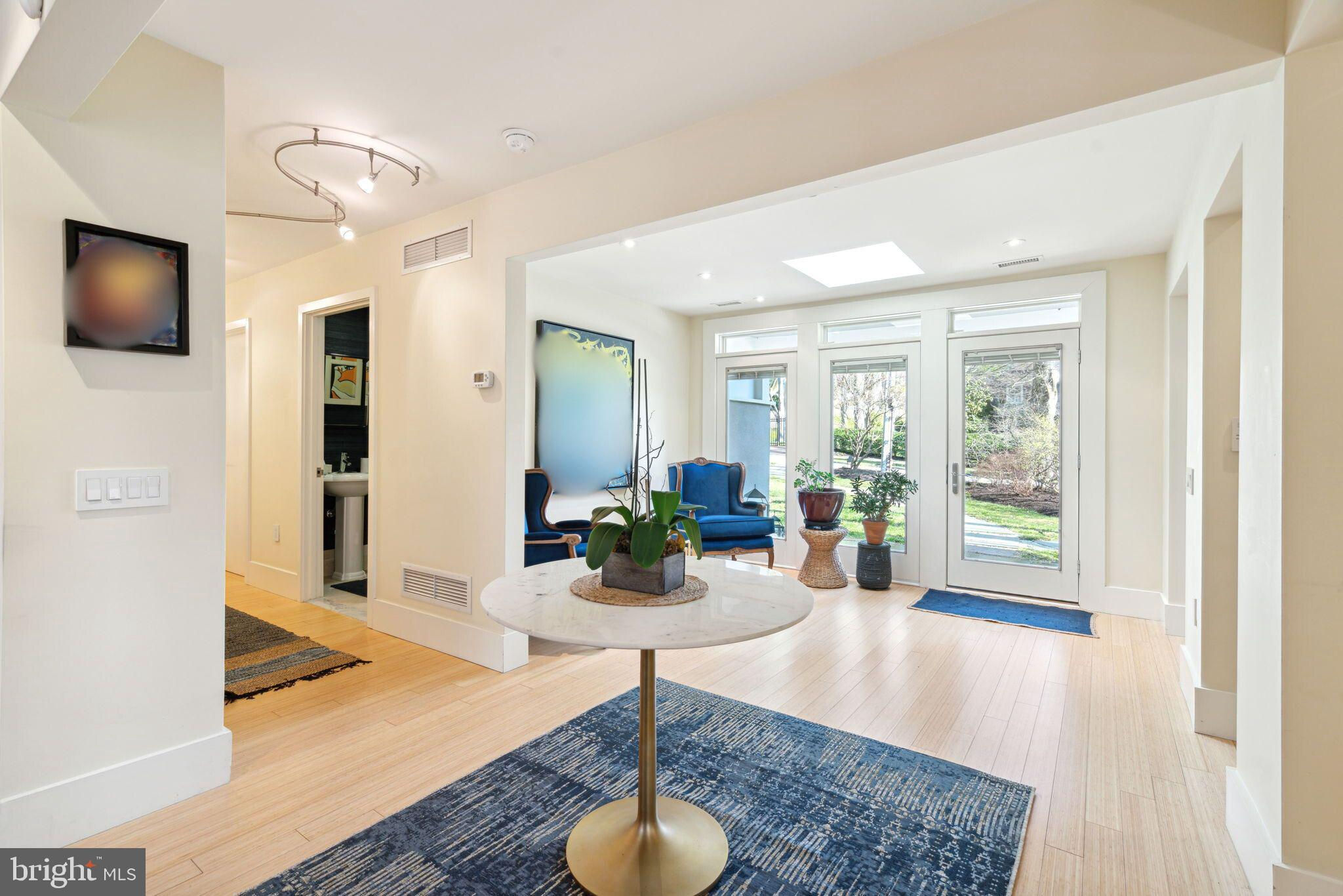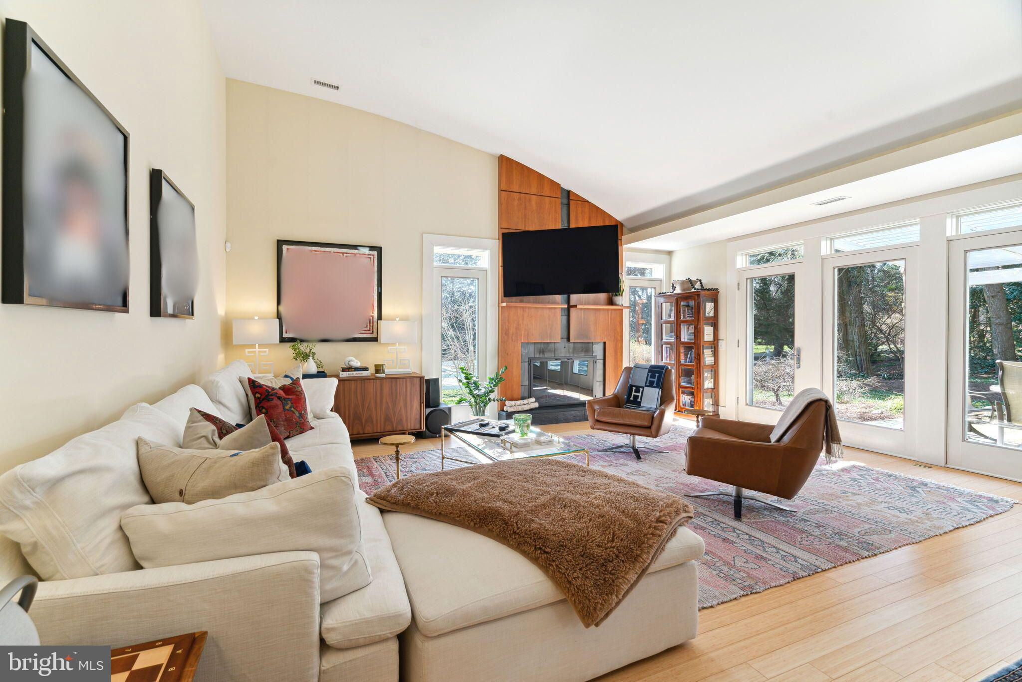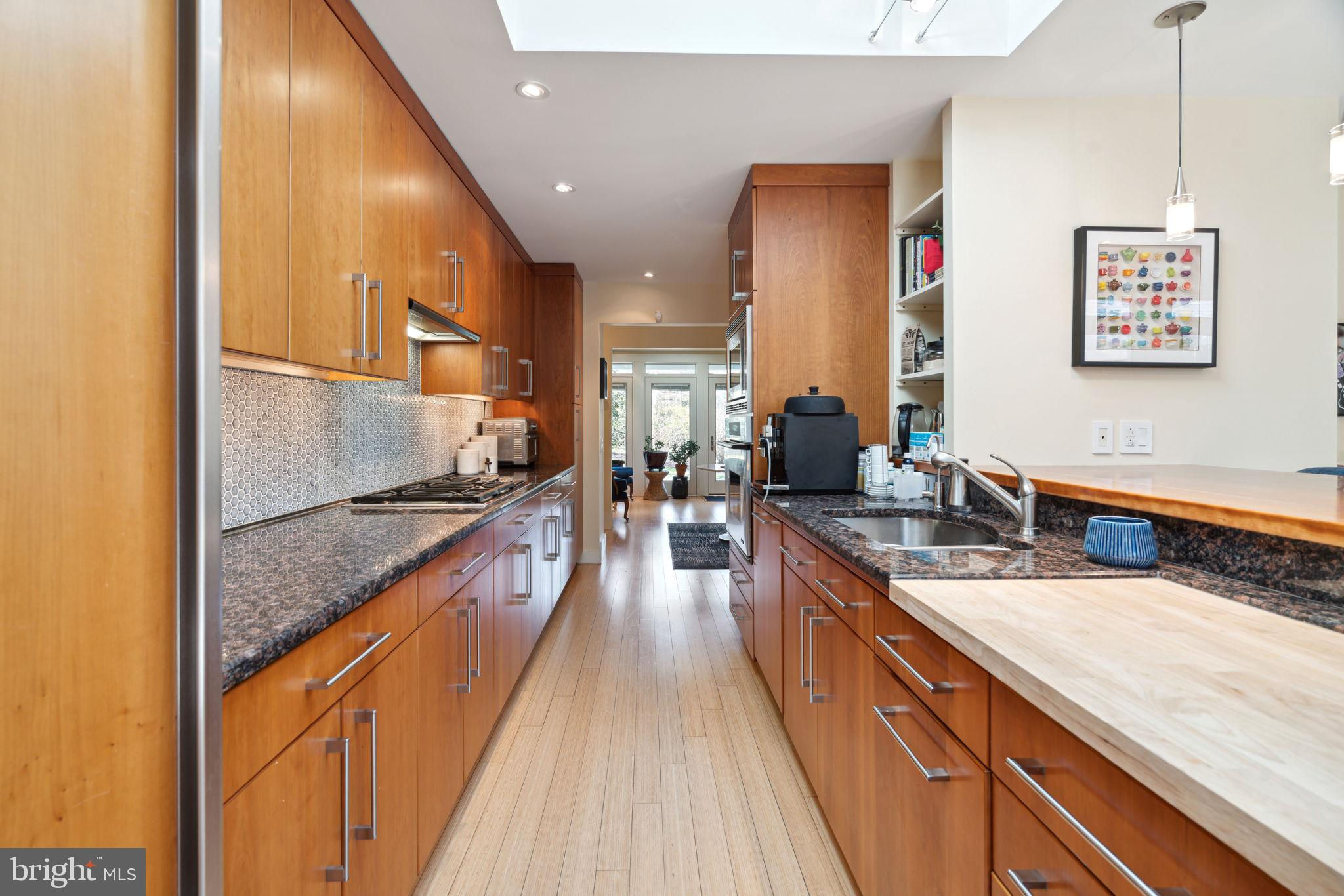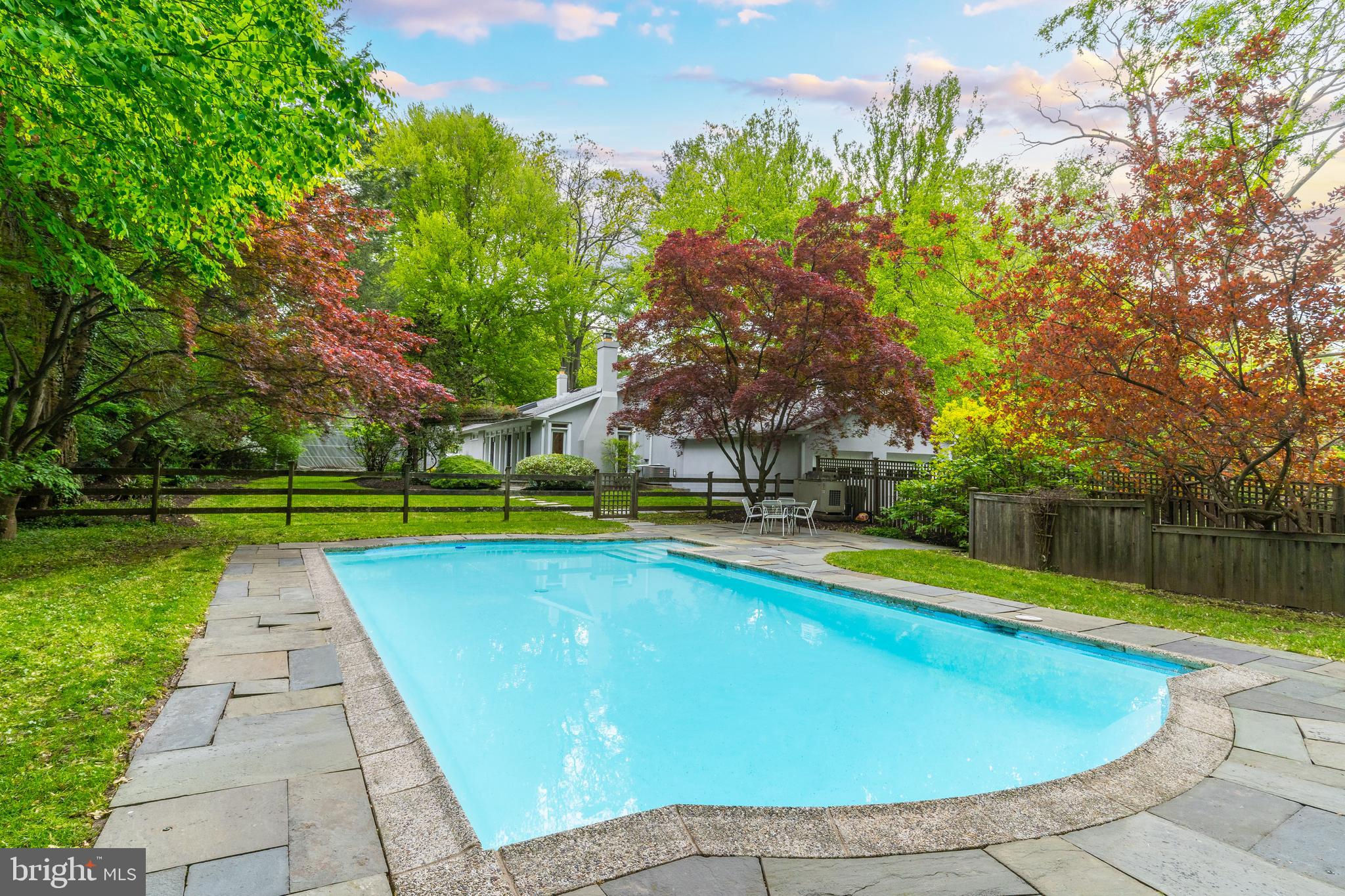 Welcome to 7616 Huron Street, an architecturally thoughtful and very functional one level home, beautifully situated on a lovely private lot in a very desirable Chestnut Hill location. This home was completely renovated in 2004, transforming this space into a home with incredible light filled rooms and modern design elements throughout. Welcoming entry foyer leads to an open and bright living and dining area with a gas fireplace plus dramatic vaulted ceilings, skylights, walls of windows and doors overlooking the tranquil patio and garden. This space is open to the Chef’s kitchen which includes custom cabinets, butcher block and granite counter tops, Dacor wall oven plus a microwave/convection oven, Wolf gas cooktop, Sub-Zero refrigerator and a breakfast bar. Just down the hall you will find an expansive Primary suite oasis including a large bedroom plus a sitting area or office area. This lovely room has wonderful garden views through the many windows and doors. 2 walk-in closets with custom closet built-ins. Each closet has its own entry into a separate vanity toilet area and is connected by an oversized double sided shower. A 2nd bedroom suite with dressing area, great closet spaces and its own bathroom make this the perfect room for guests. The two rooms at the front of the home could serve as a 3rd bedroom and sitting area or office space. Property can be restored into a four bedroom by converting current sitting room next to bedroom 3. Continuing on to the basement and the garage, you will find an open pantry/storage area, built-in cabinetry and a mudroom. The basement includes a full bathroom and exterior access. This could be a great space for a media room/play room/home gym/home office. Light hardwood floors plus first floor laundry and powder room, generator, a greenhouse, 2 car garage with interior access and skylights throughout. The garden is very private with a pool. Entertain and enjoy the lovely Pergola covered flagstone patio with a gas grill connected to a gas line. Easy walk to Germantown Avenue commercial corridor, train station, Wissahickon trails and so convenient to Center City