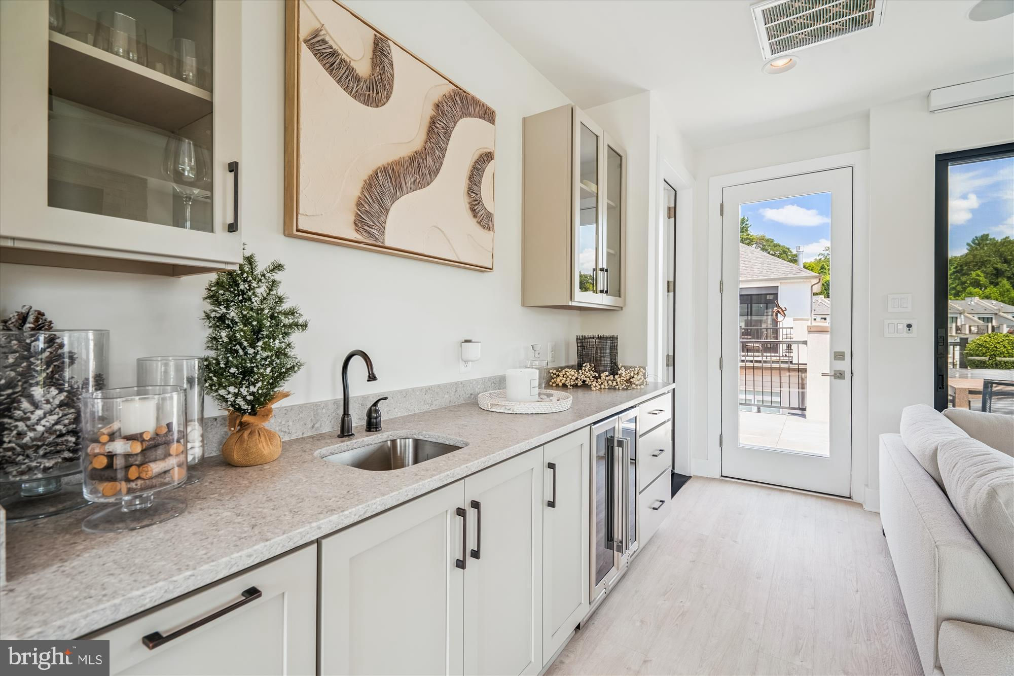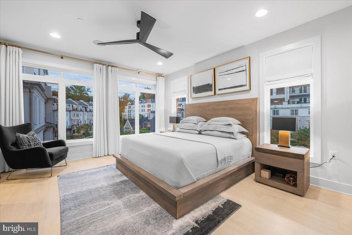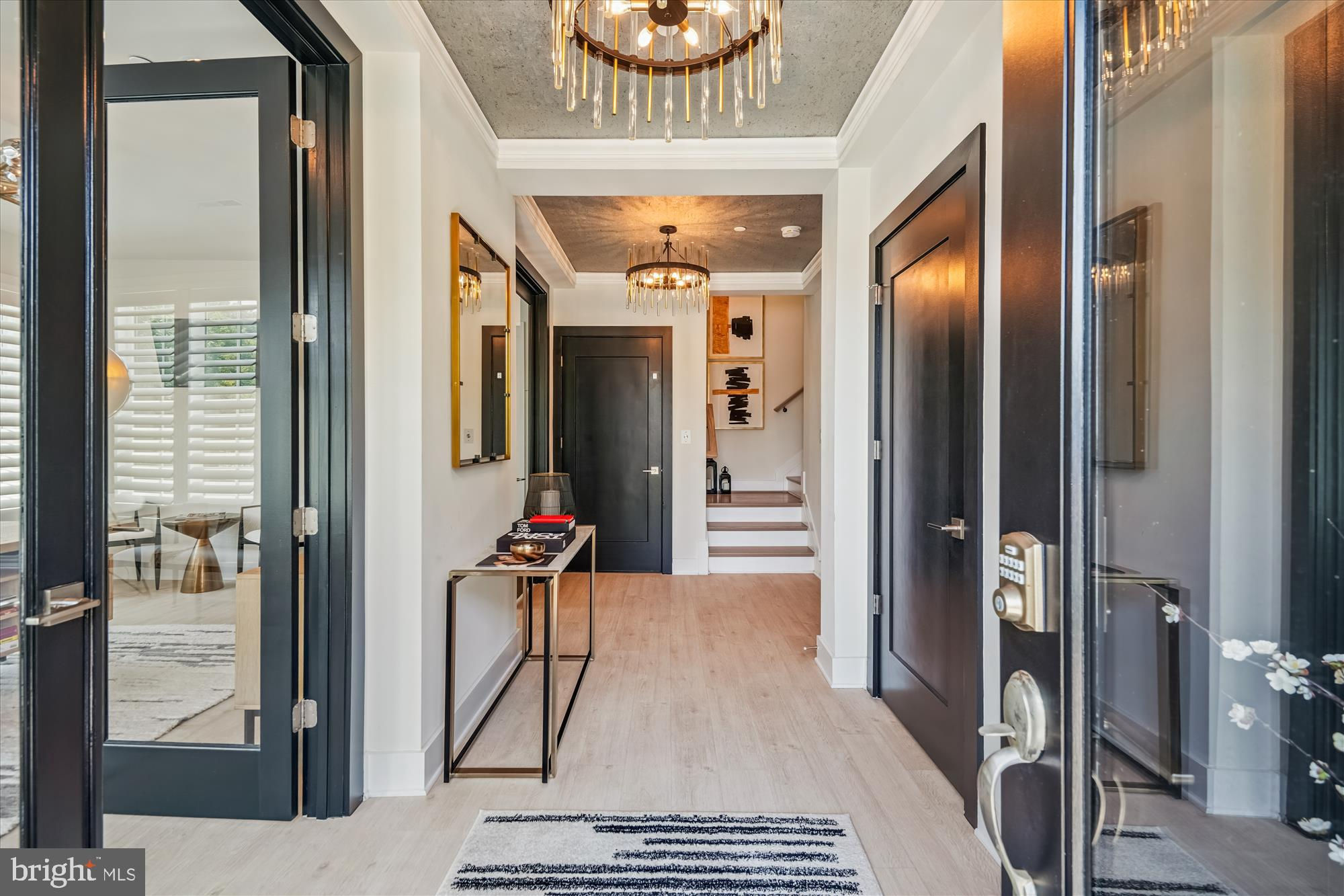 Welcome home to this exquisite end-unit rowhome in coveted Quarry Springs! Thoughtfully and graciously upgraded, this sun-soaked beauty showcases top-of-the-line improvements that include Restoration Hardware light fixtures, custom window panels and drapes, additional built-ins, plantation shutters, sliding glass panels that open the upper level family room to two roof terraces. Enjoy electric screens and electric shades that allow you to fully open or screen in the top floor, complemented by an outdoor kitchen and grill area. The entry foyer greets guests with a custom-painted ceiling, lacquered doors, and dual RH chandeliers. The office includes a discreet "inner office" designed to house printers and office equipment while maintaining the beauty of the main corner office. An elevator provides convenient access to all four floors. On the next level, you'll find the centerpiece of the home: the kitchen. Boasting a 12-ft island and gourmet appliances, it's flanked on each end with the generously sized dining and living rooms, bar/coffee counters, and dual walk-in pantries. Two gas fireplaces add warmth and charm to the space. The third level owner's suite features an elegant entry foyer, an expansive walk-in closet with custom built-ins, and a spa-like bath. Additionally, there are two more bedrooms and a full bath, as well as a spacious laundry room complete with cabinetry. The top-level family room features includes beverage/bar area, a coffered ceiling, and walls of retractable glass that open onto dual terraces. From the front terrace, enjoy serene, treetop views, while many rooms offer spectacular views of the fountain - particularly striking at night! Quarry Springs offers a host of amenities, including a sparkling outdoor pool, fitness center, party and entertaining rooms, walking paths, a waterfall, gardens, and even a dog park! This corner lot offers a premium view of the entrance fountain and gardens, as well as unobstructed treetop views from the front roof terrace, enhancing your enjoyment of the foliage. With 24-hour security and a gated entrance, peace of mind is paramount. This location offers convenient access to 495/270 for easy commuting to DC and Tysons, along with proximity to two airports and the shopping and dining options of Potomac Village and Bethesda. Don’t miss the opportunity to make this stunning property your new home!