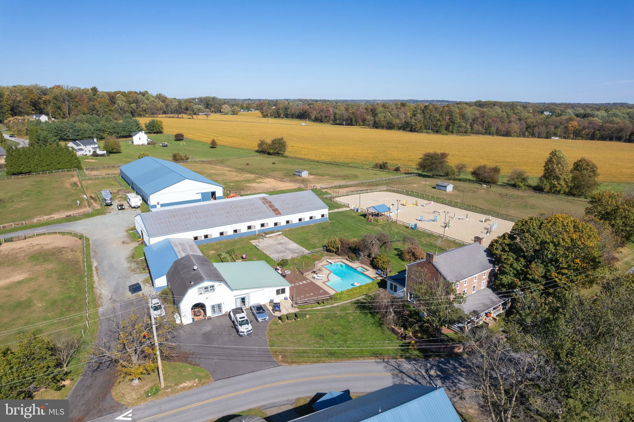 Welcome to Brownstone Farm, a stunning equestrian training center and historic residence set on 12.7± beautifully maintained acres. Originally constructed circa 1772, this solid brick three-story farmhouse blends timeless architecture with modern updates and offers an exceptional opportunity for both gracious country living and professional equestrian pursuits. The main residence invites you in with a wide 10-foot front porch and a grand entry hall flanked by elegant parlors. The remodeled kitchen (2018) features custom cabinetry with a hand-painted finish, soapstone countertops, a farmhouse sink, subway tile backsplash, stainless steel appliances, and a butcher-block center island with prep sink. A cozy breakfast area with a wall of windows and exposed brick adds warmth and light. Adjacent, the formal dining room boasts built-in china cabinets and a charming corner wood-burning fireplace. Additional living spaces include a great room with arched openings, hardwood floors, and a fireplace plus a formal parlor ideal for entertaining with another fireplace. The first floor also offers a convenient laundry room with utility sink and a full bath featuring a soapstone vanity. Upstairs, the second floor hosts four generously sized bedrooms and a full bath with clawfoot tub. The third floor provides THREE additional bedrooms with adjoining sitting or sewing rooms / flexible spaces that can serve as offices, craft rooms, or extra storage. Step outside to your own private retreat. The L-shaped Anthony Sylvan in-ground pool (8’ deep) with adjoining hot tub is surrounded by a 25’ x 15’ patio, an island-themed pool house, fire pit area, and a sports court with basketball hoop. Raised flower beds and mature landscaping complete this peaceful setting. A two bedroom loft apartment with downstairs studio offers full amenities and is currently leased & perfect for generating supplemental income or accommodating guests. Equestrians will appreciate the exceptional facilities: Main Barn (built 2009): 35 stalls with windows, two tack rooms, three wash stalls (2 heated) with hot/cold water, three tack-up stalls, feed room, hay and straw storage, heated office, heated bathroom, and laundry. Second Barn: Seven additional stalls, wash stall with hot/cold water, tack and feed rooms, blanket storage & machine storage bays. Indoor Riding Arena (built 2010): 80’ x 200’, sand footing, LED lighting, heated viewing room, and spectator seating. Outdoor Ring (built 2020): 100’ x 240’, excellent base with sand footing, observation deck with electric and ceiling fan. Fenced paddocks and open pasture complete the setup for a working equestrian facility. Hacking path around the perimeter of the property. Brownstone Farm is as functional as it is picturesque, offering an established setting for lessons, training, and equestrian shows with proven cash flow potential. Whether you’re seeking a turnkey equestrian operation, a country retreat, or a blend of both—this remarkable property delivers history, character, and opportunity in equal measure.