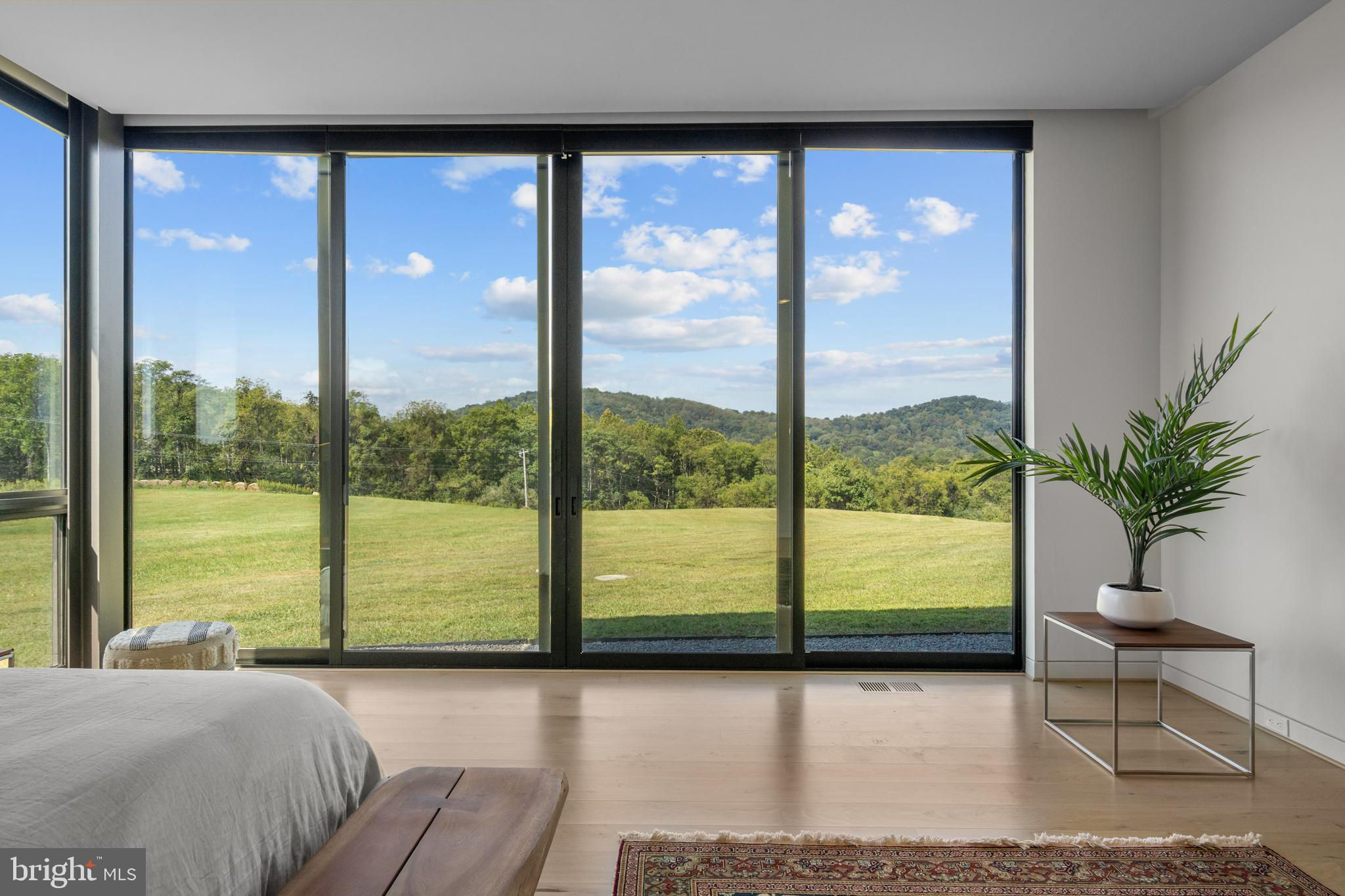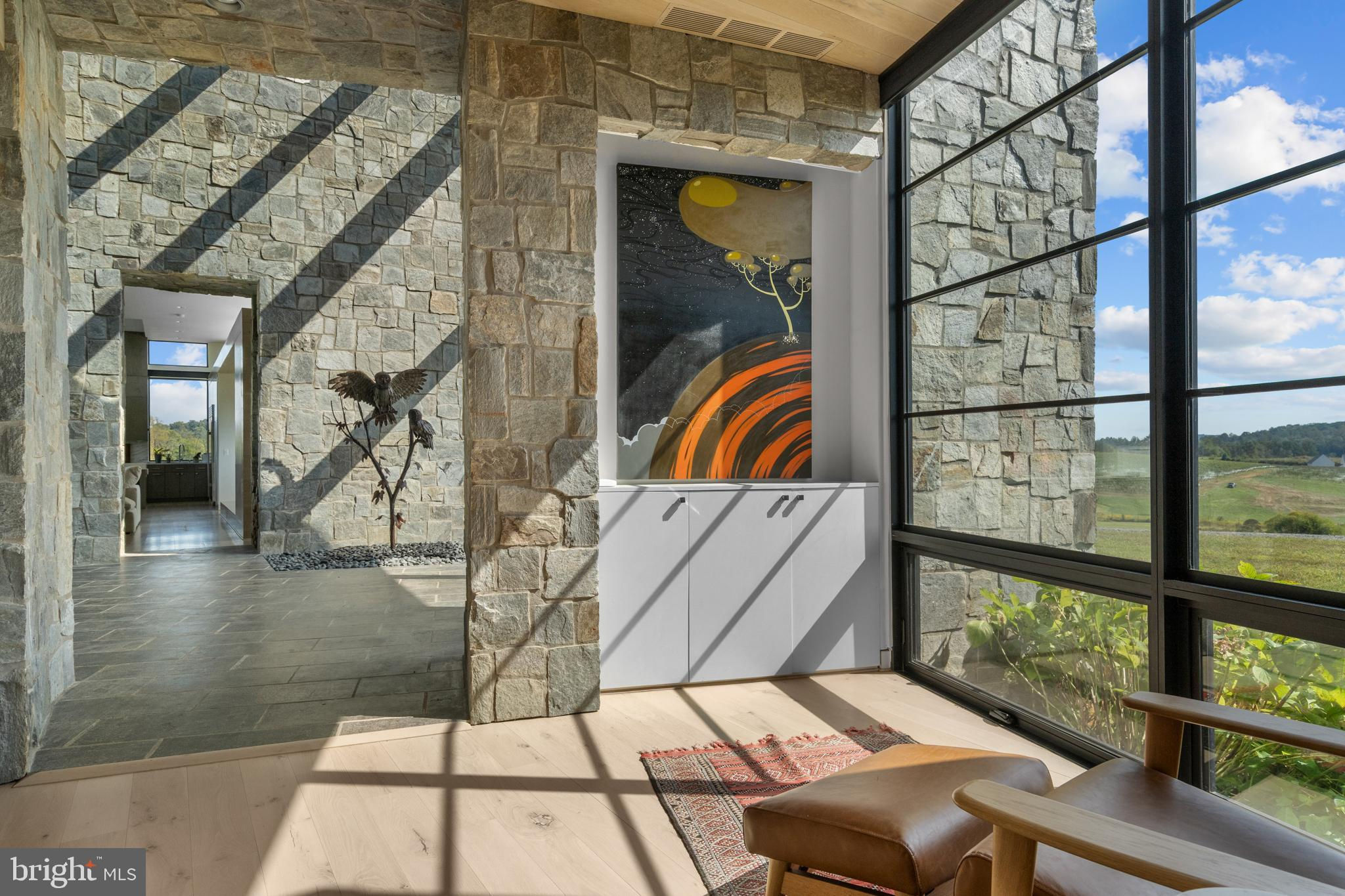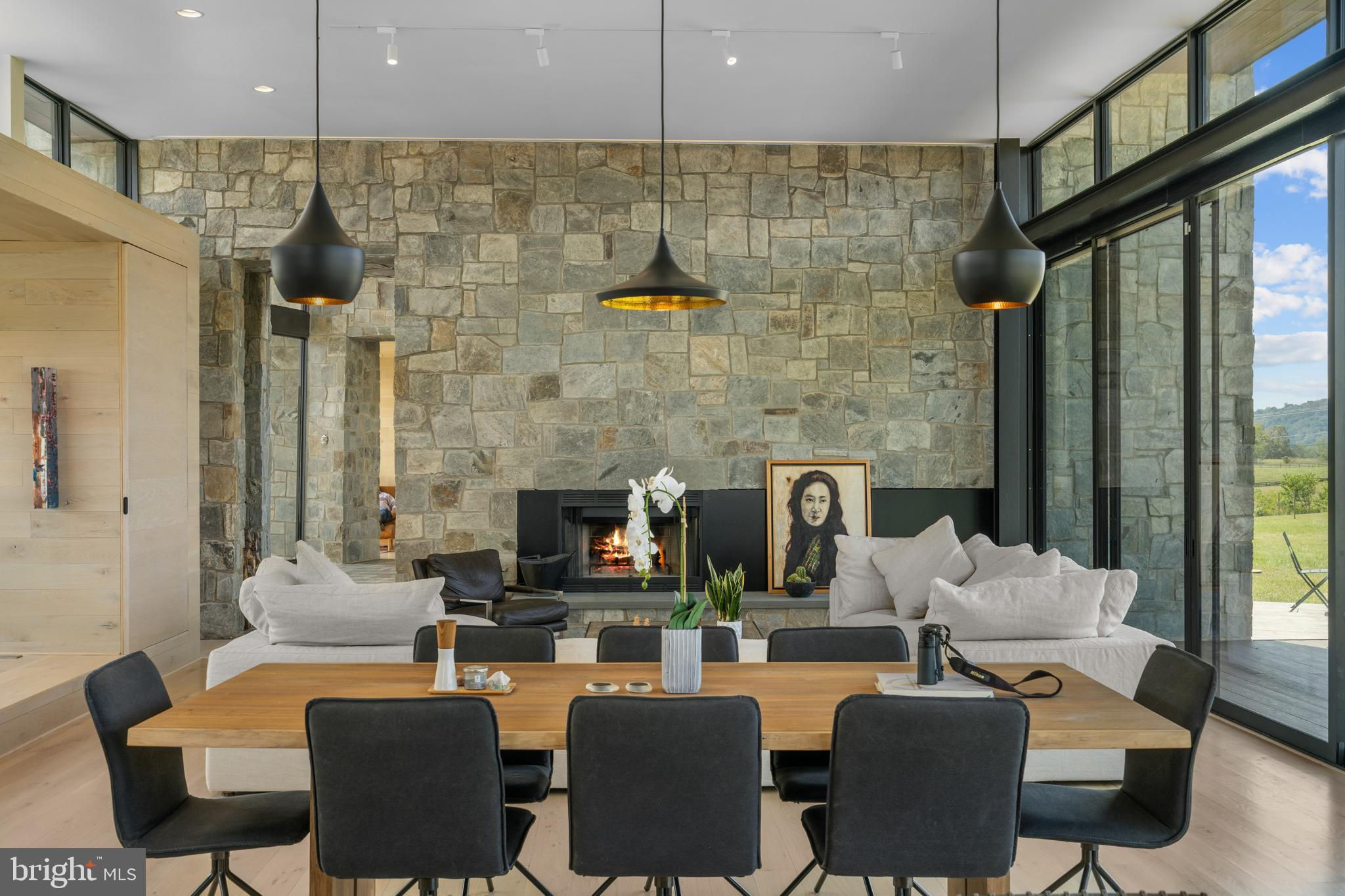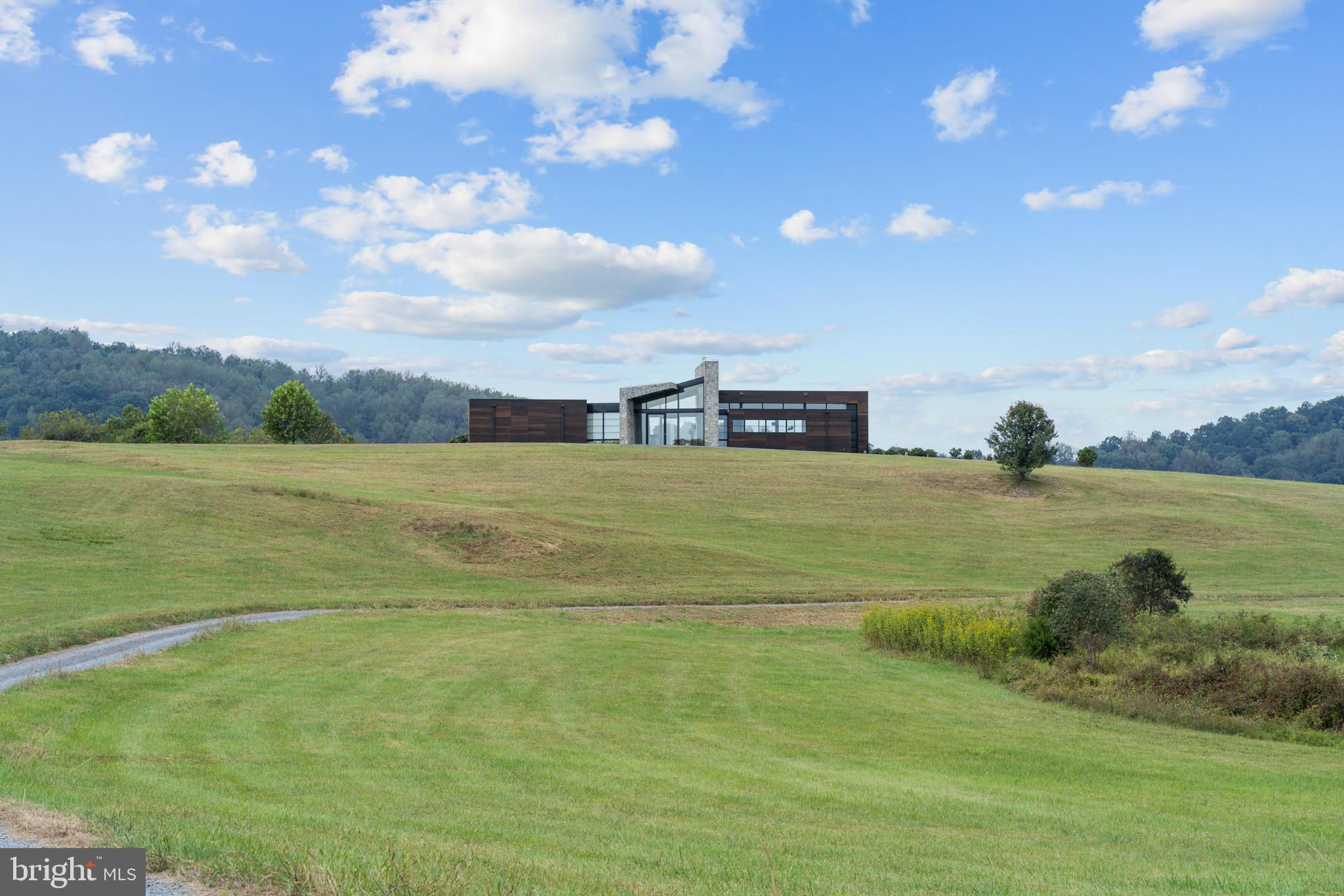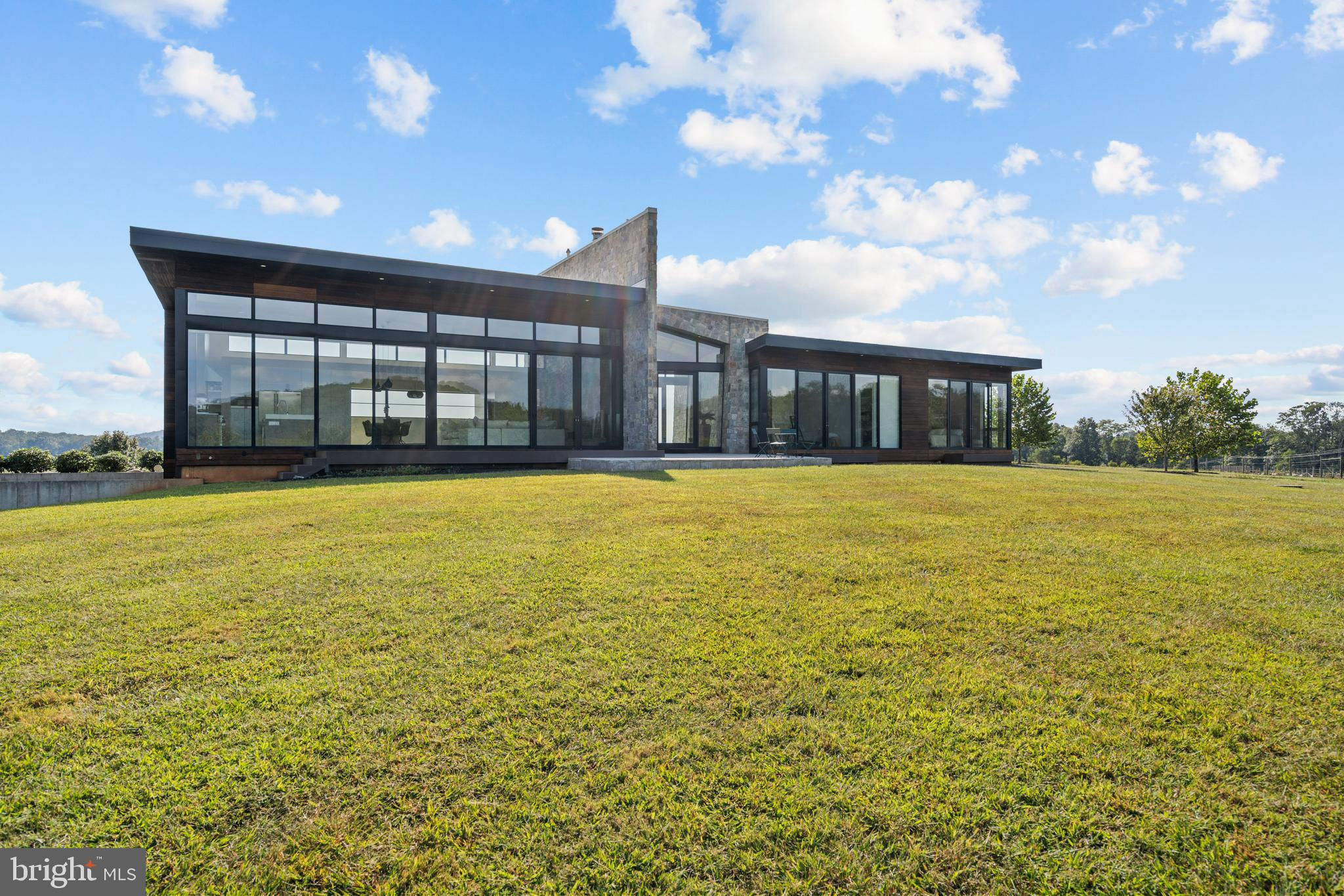 Amidst rolling hayfields and sweeping mountain views, House of Sky is a modern retreat designed for serenity and connection to nature. The striking stone-and-wood exterior opens to expansive western windows framing the Blue Ridge horizon. Designed by Lavinia Pasquina Fici and John Nahra, the home blends artistry with function in an exceptional 53-acre setting with hayfields, vineyard, and orchard. Inside, the open kitchen/dining/living space soars with 15’ ceilings, bleached white oak floors, and walls of glass. Custom Cabico cabinetry, Brazilian granite, Caesarstone, and top appliances—Wolf, Sub-Zero, Bosch, and Grohe—make the kitchen a chef’s dream. Sliding doors lead to terraces for outdoor dining and entertaining. The primary suite features floor-to-ceiling windows, a luxurious travertine bath with soaking tub, radiant heat, and spacious closet. A second bedroom with built-in bunks, private library, and lower-level wine cellar complete the home. Additional highlights include a garage, well-equipped laundry, and radiant floors. Located just 5 minutes from Washington, VA, and 10 minutes from Sperryville, this extraordinary property offers modern design, peaceful solitude, and proximity to fine dining, boutique shops, and the best of Rappahannock living.