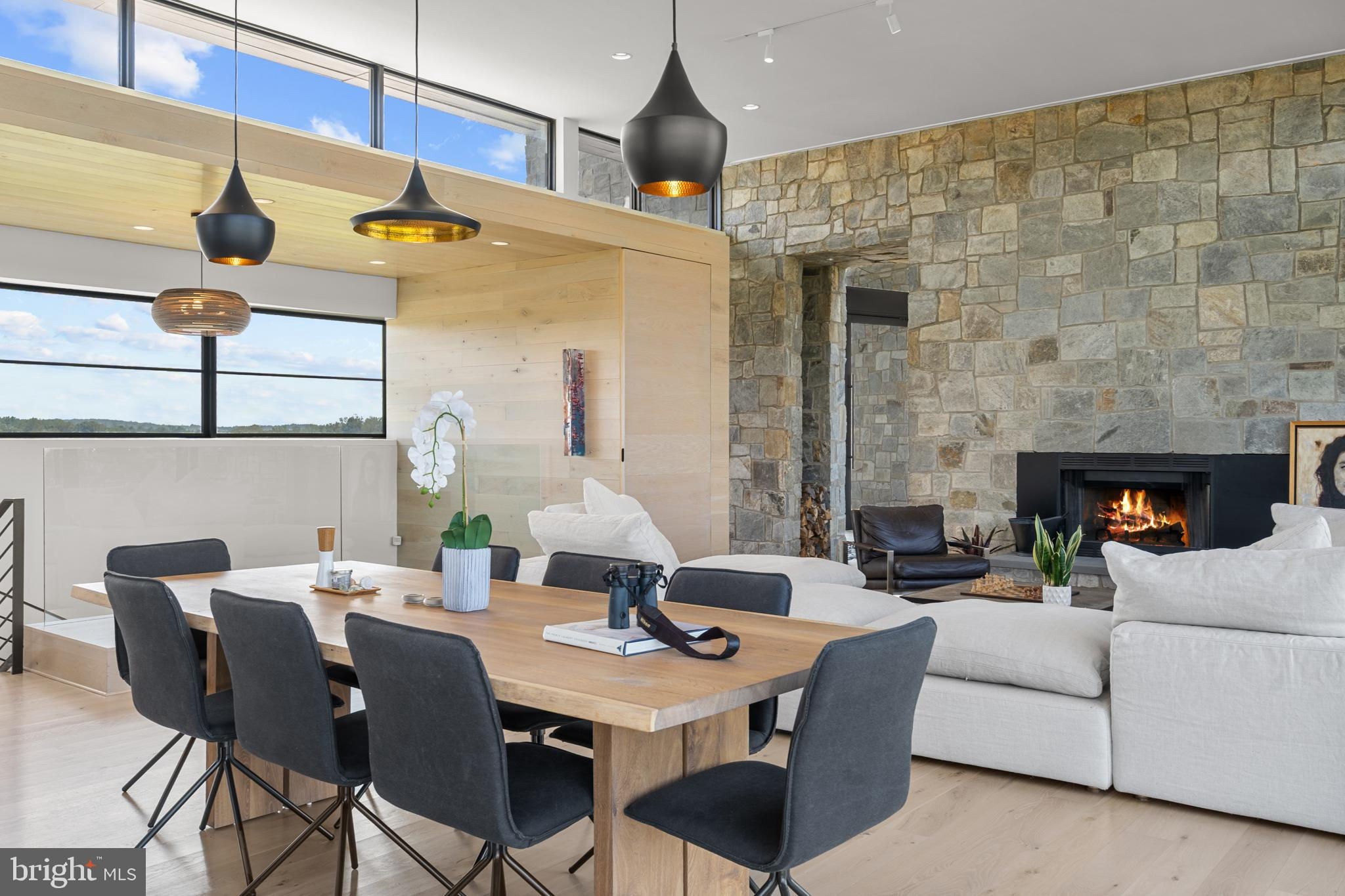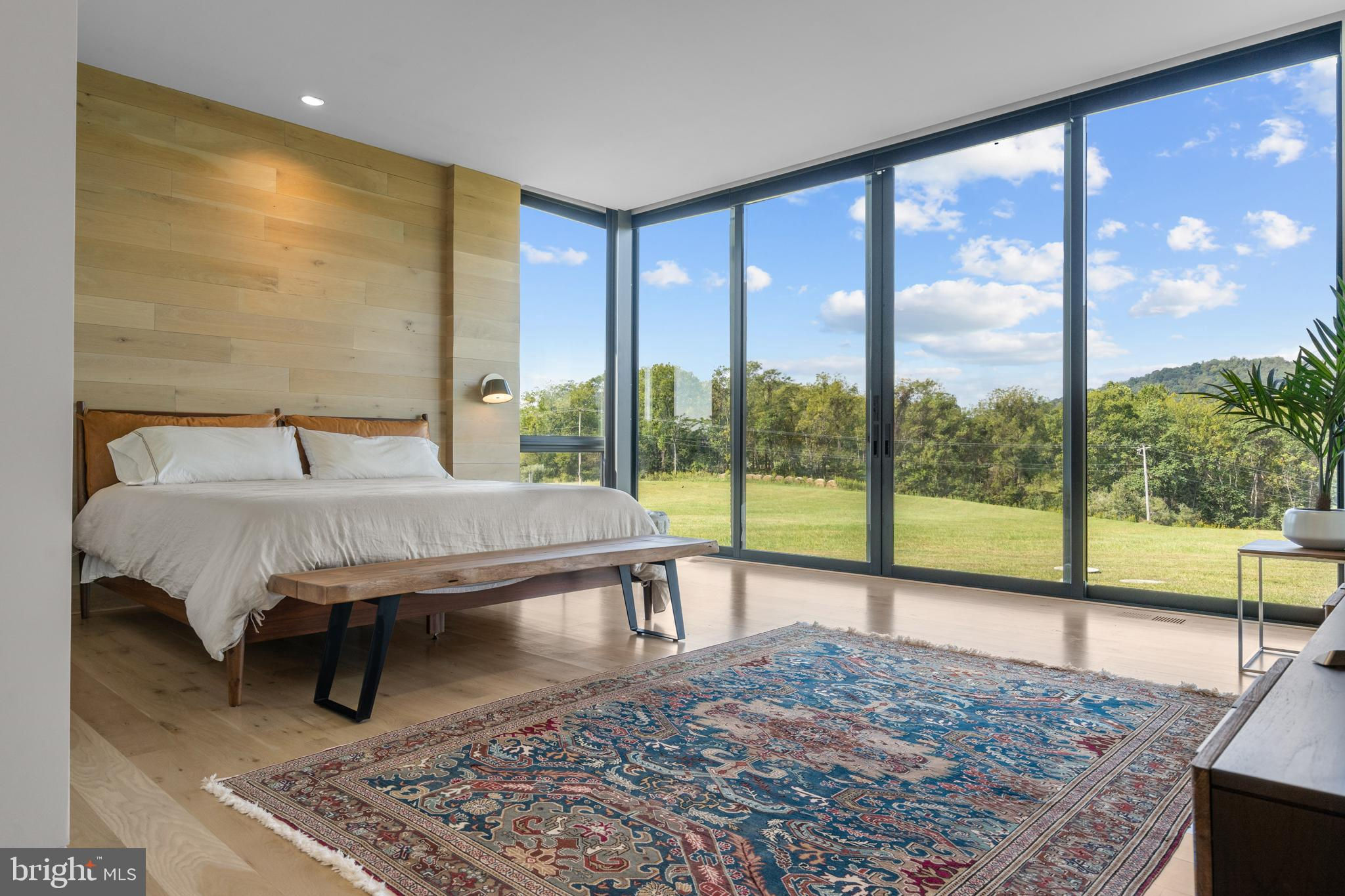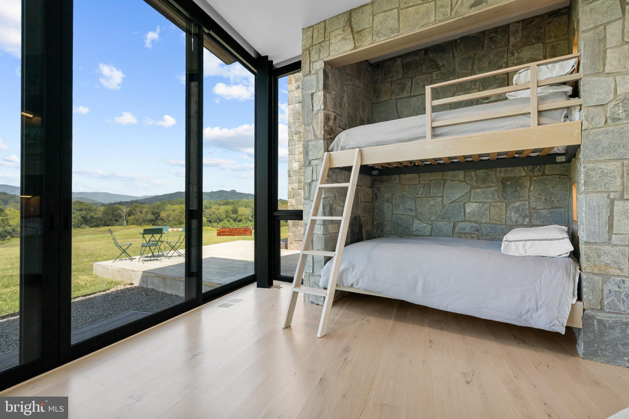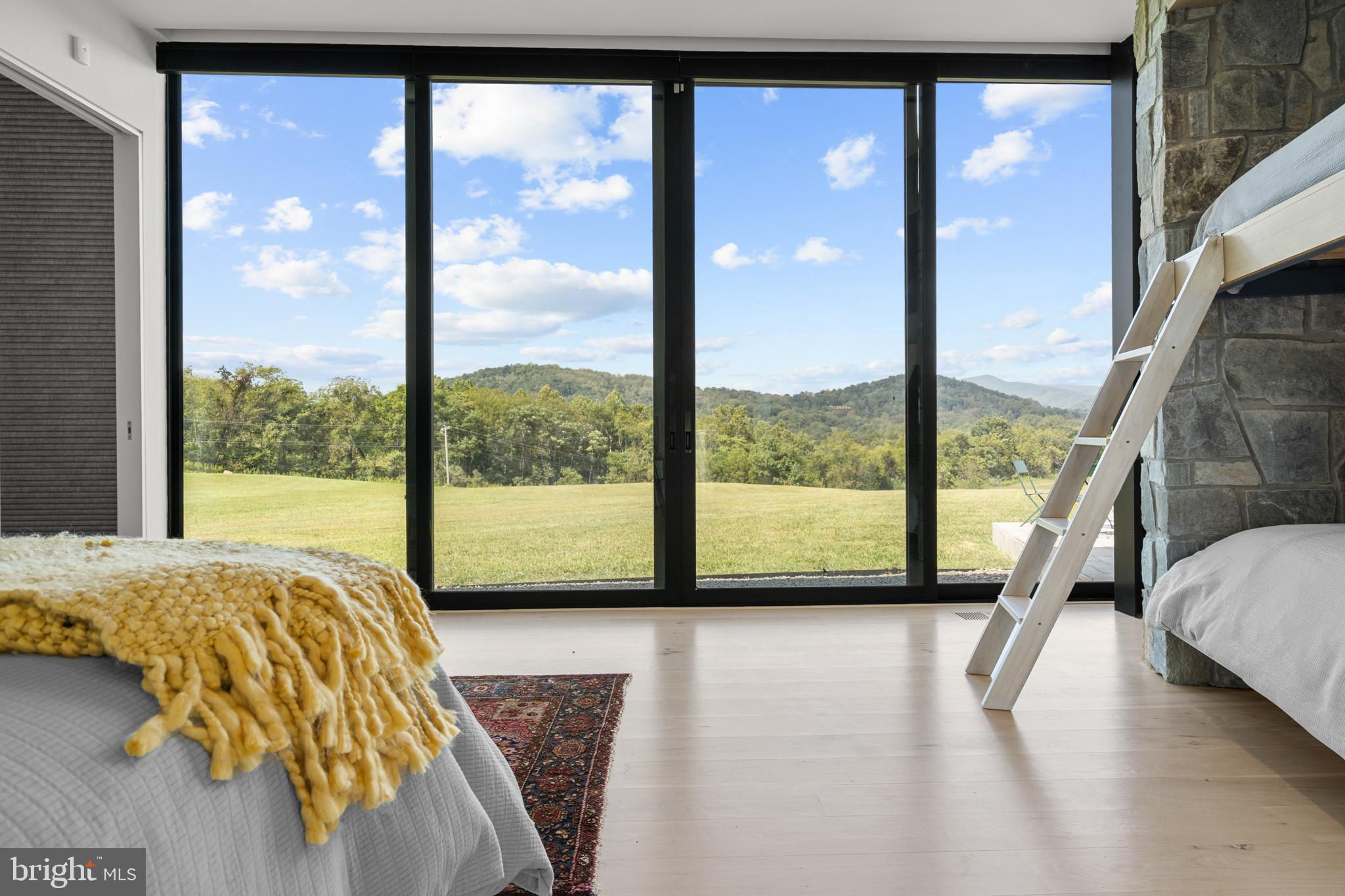 Amidst rolling hayfields and sweeping mountain views, House of Sky is a modern retreat designed for serenity and connection to nature. The striking stone-and-wood exterior opens to expansive western windows framing the Blue Ridge horizon. Designed by Lavinia Pasquina Fici and John Nahra, the home blends artistry with function in an exceptional 53-acre setting with hayfields, vineyard, and orchard. Inside, the open kitchen/dining/living space soars with 15’ ceilings, bleached white oak floors, and walls of glass. Custom Cabico cabinetry, Brazilian granite, Caesarstone, and top appliances—Wolf, Sub-Zero, Bosch, and Grohe—make the kitchen a chef’s dream. Sliding doors lead to terraces for outdoor dining and entertaining. The primary suite features floor-to-ceiling windows, a luxurious travertine bath with soaking tub, radiant heat, and spacious closet. A second bedroom with built-in bunks, private library, and lower-level wine cellar complete the home. Additional highlights include a garage, well-equipped laundry, and radiant floors. Located just 5 minutes from Washington, VA, and 10 minutes from Sperryville, this extraordinary property offers modern design, peaceful solitude, and proximity to fine dining, boutique shops, and the best of Rappahannock living.