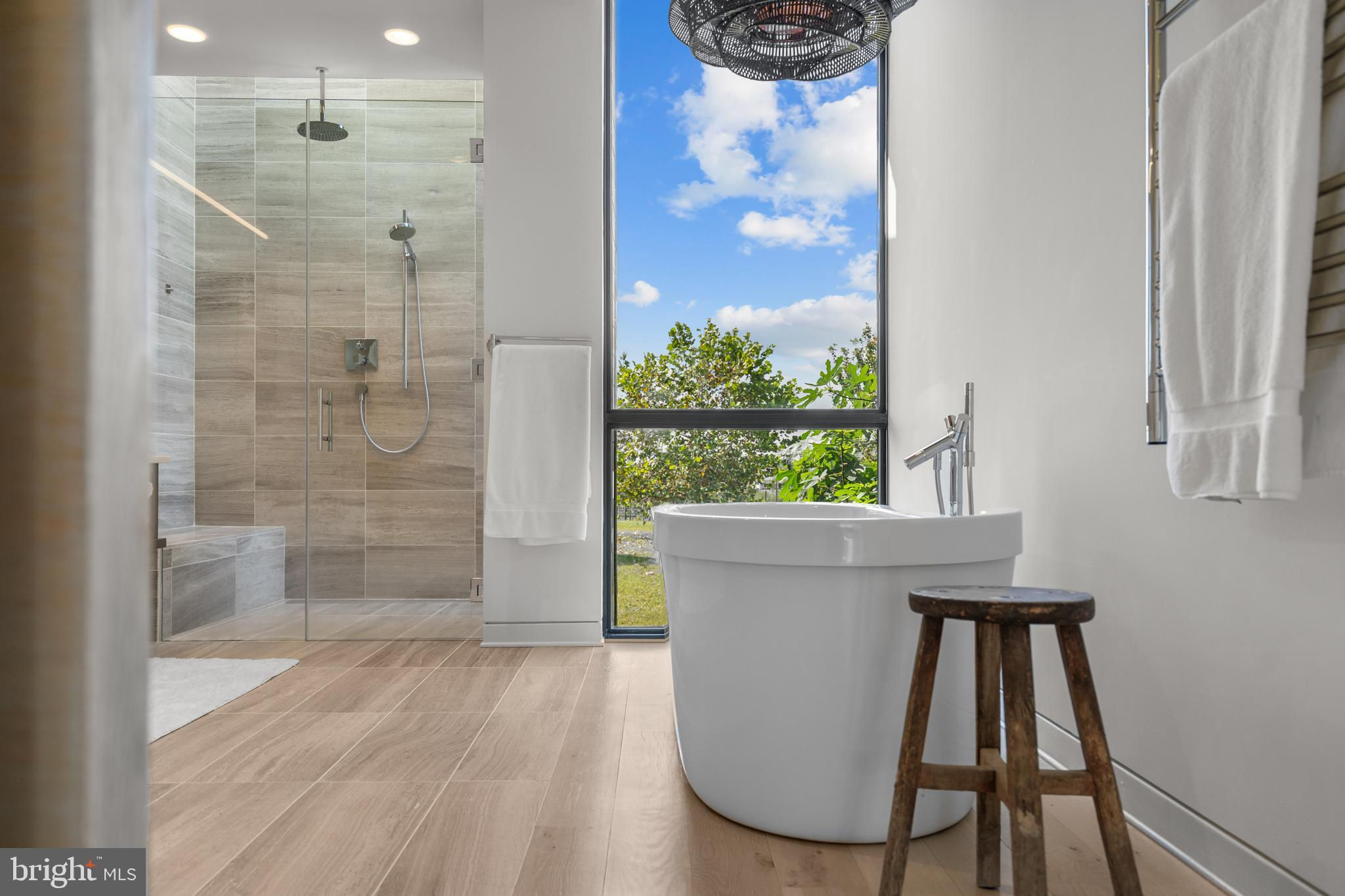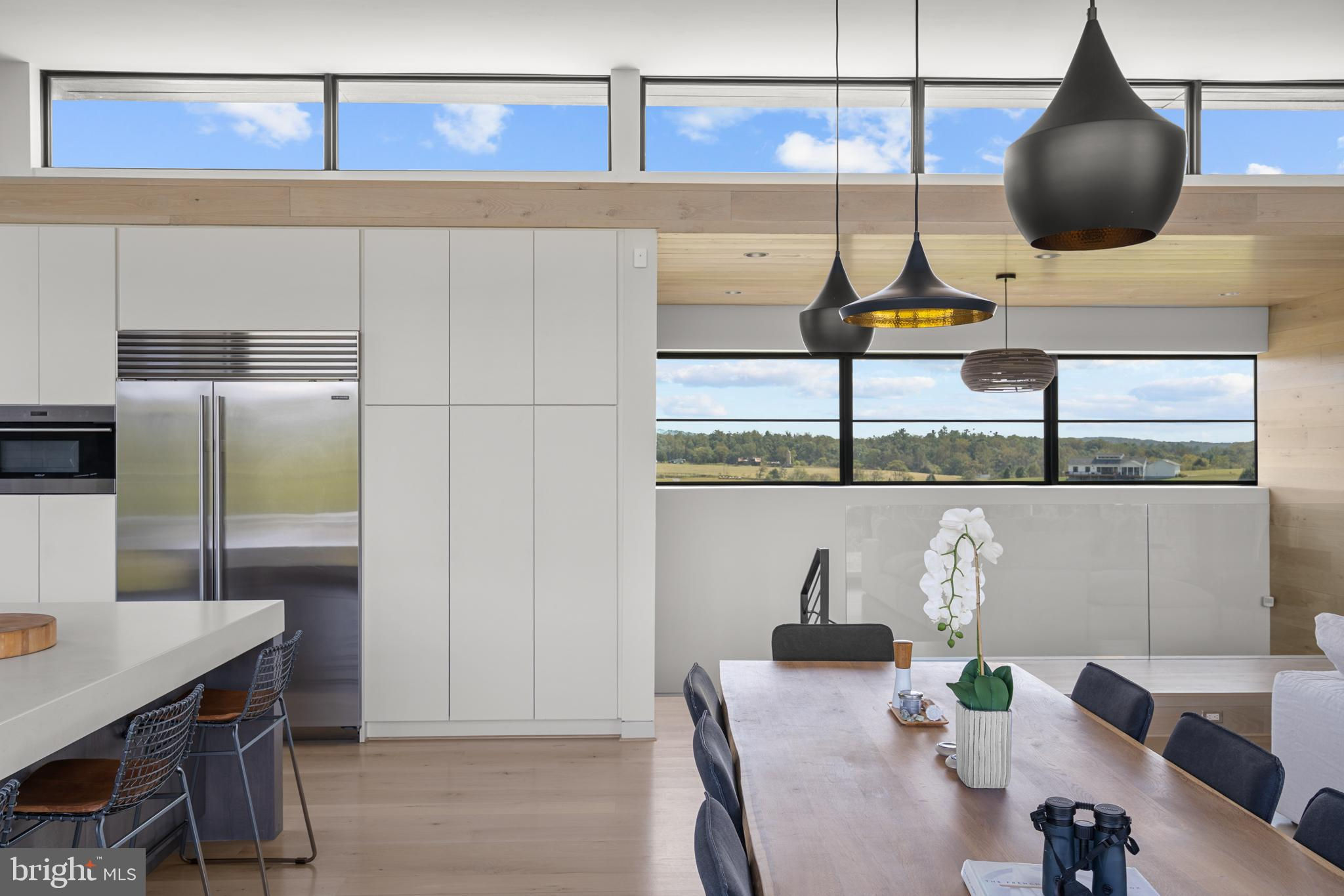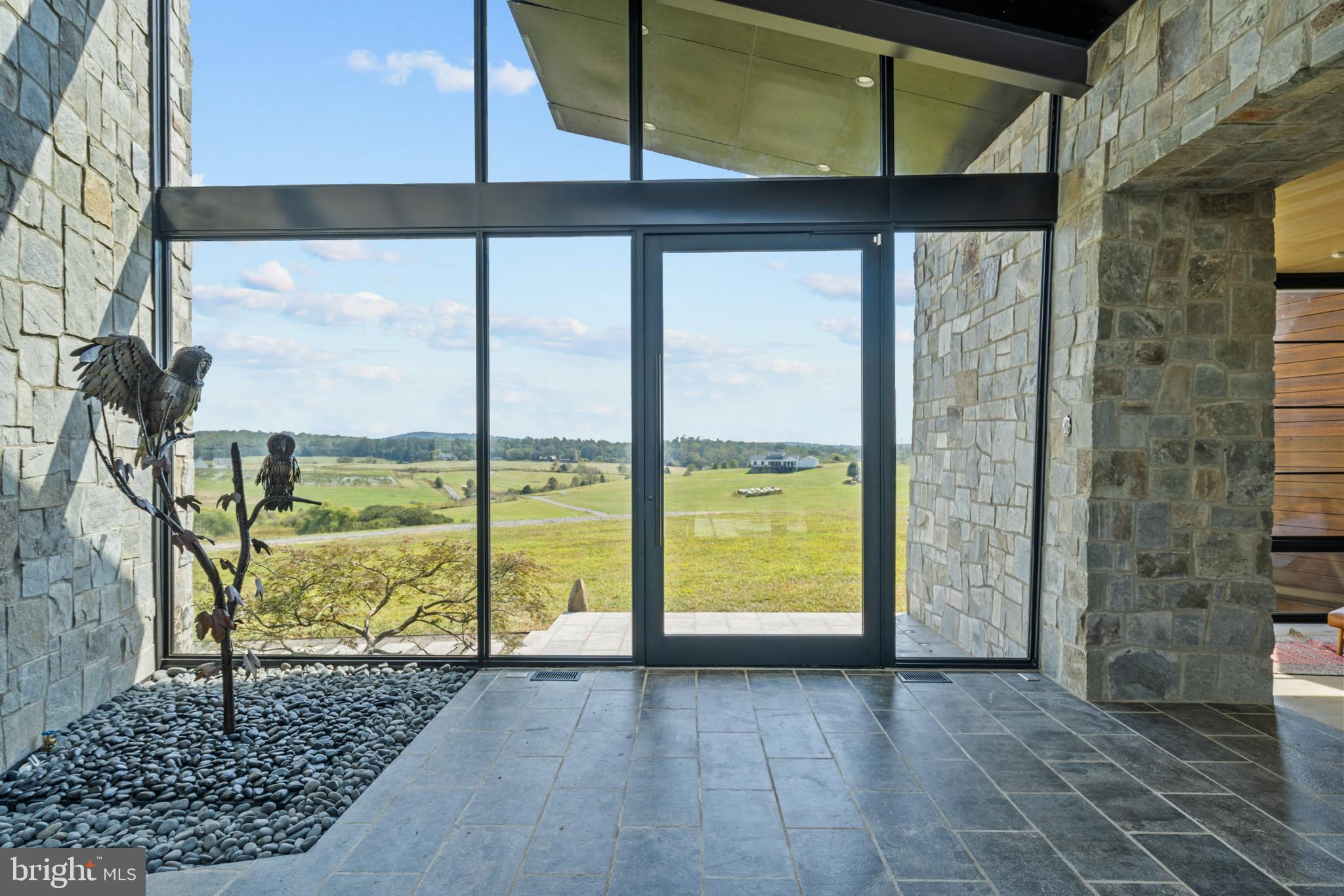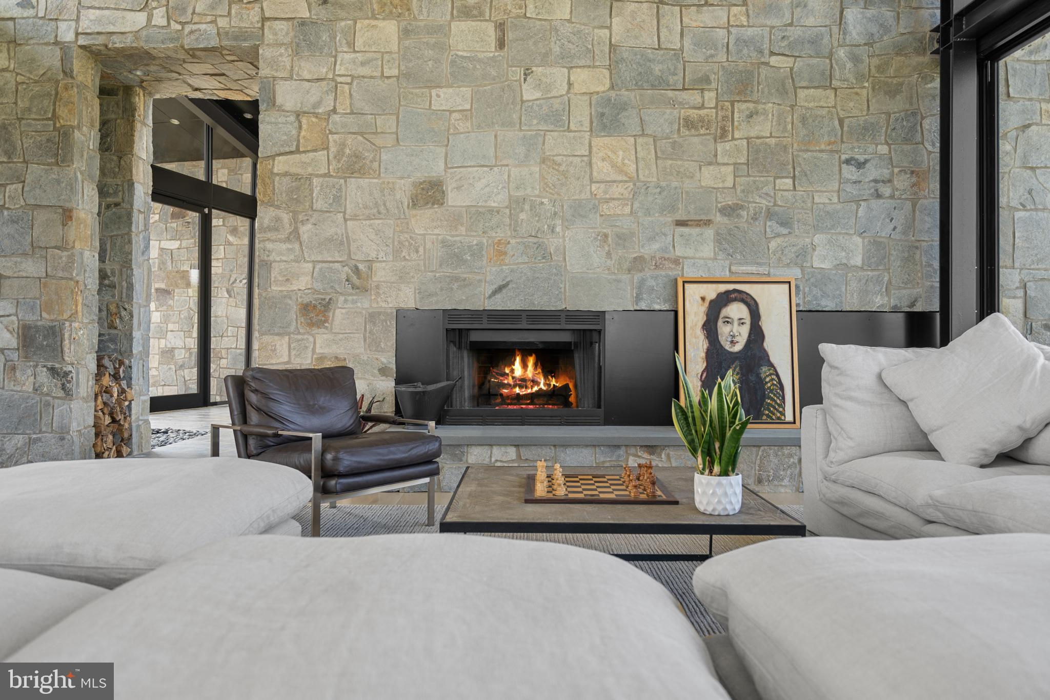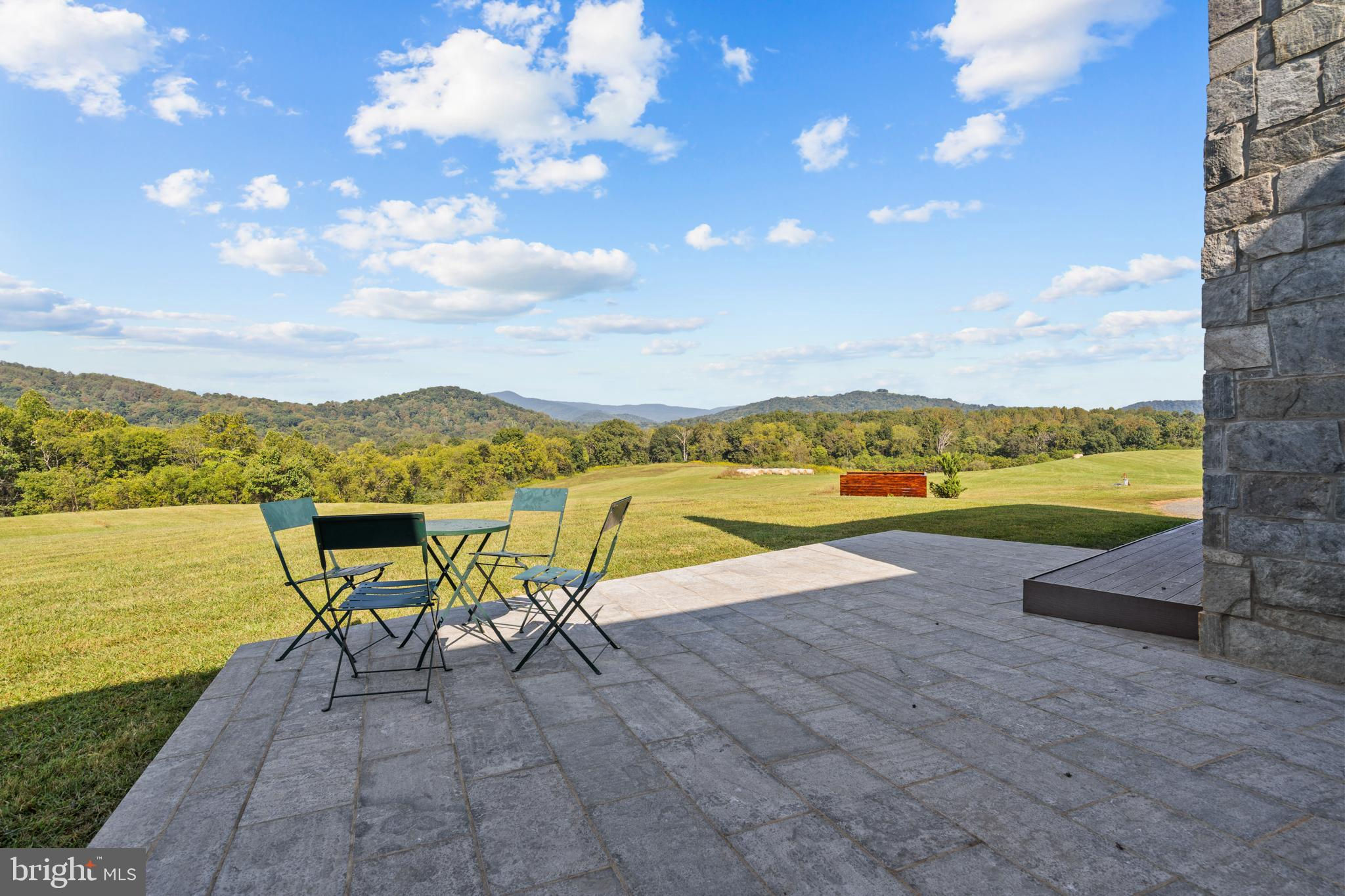 Amidst rolling hayfields and sweeping mountain views, House of Sky is a modern retreat designed for serenity and connection to nature. The striking stone-and-wood exterior opens to expansive western windows framing the Blue Ridge horizon. Designed by Lavinia Pasquina Fici and John Nahra, the home blends artistry with function in an exceptional 53-acre setting with hayfields, vineyard, and orchard. Inside, the open kitchen/dining/living space soars with 15’ ceilings, bleached white oak floors, and walls of glass. Custom Cabico cabinetry, Brazilian granite, Caesarstone, and top appliances—Wolf, Sub-Zero, Bosch, and Grohe—make the kitchen a chef’s dream. Sliding doors lead to terraces for outdoor dining and entertaining. The primary suite features floor-to-ceiling windows, a luxurious travertine bath with soaking tub, radiant heat, and spacious closet. A second bedroom with built-in bunks, private library, and lower-level wine cellar complete the home. Additional highlights include a garage, well-equipped laundry, and radiant floors. Located just 5 minutes from Washington, VA, and 10 minutes from Sperryville, this extraordinary property offers modern design, peaceful solitude, and proximity to fine dining, boutique shops, and the best of Rappahannock living.
