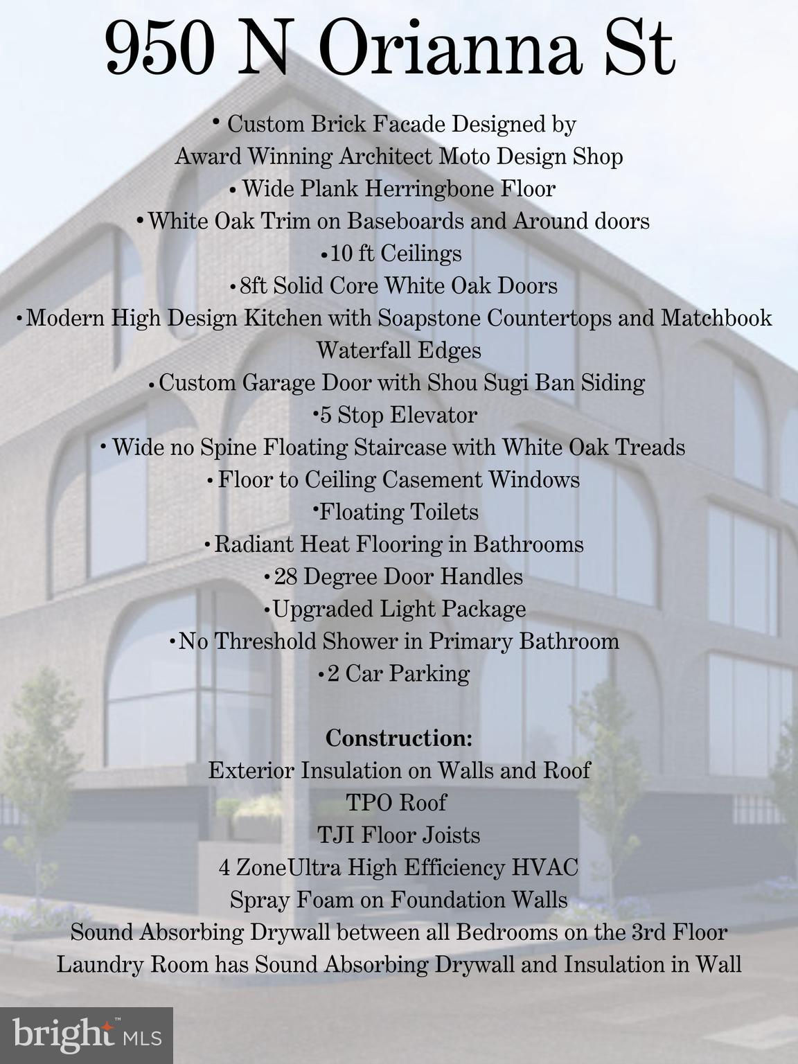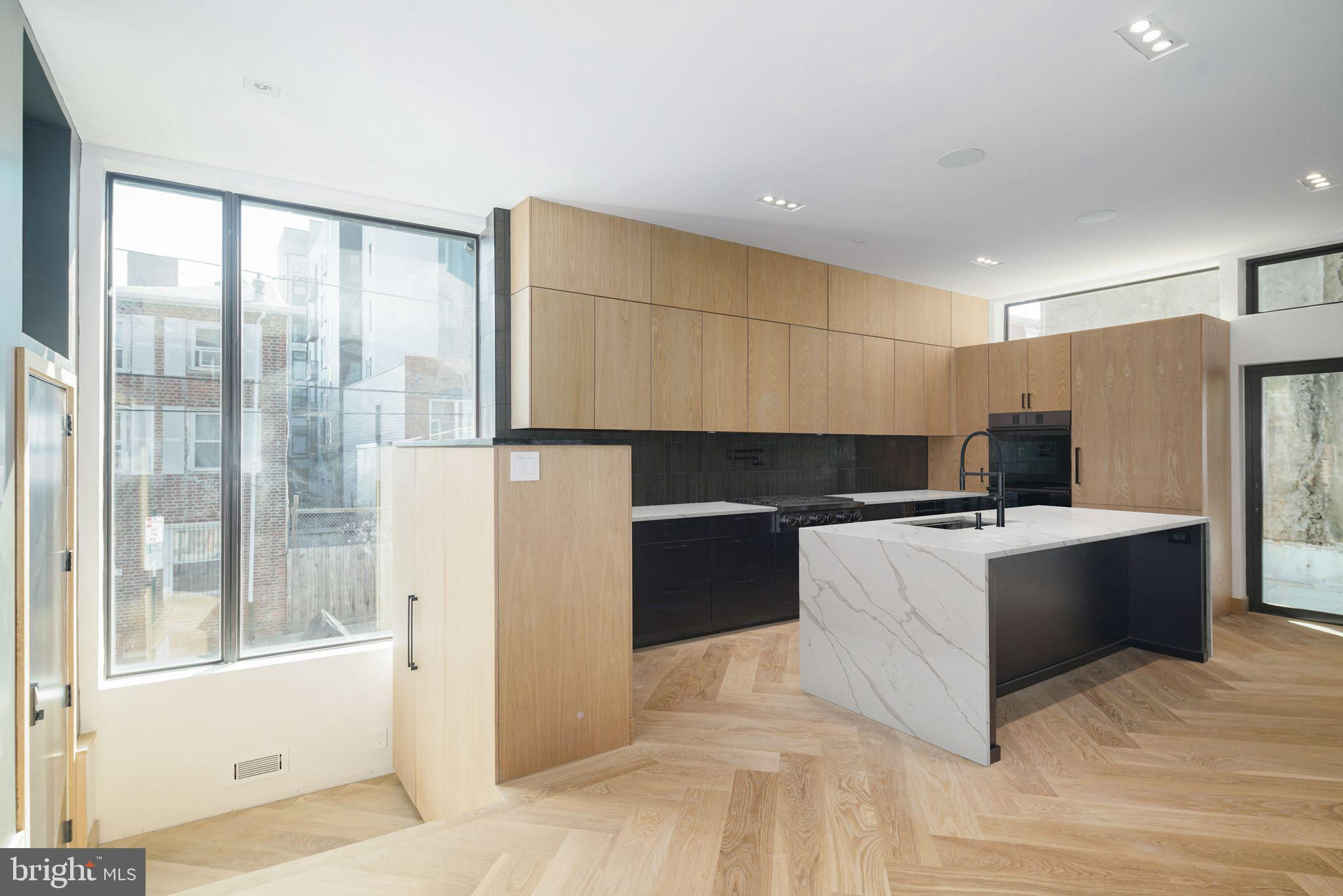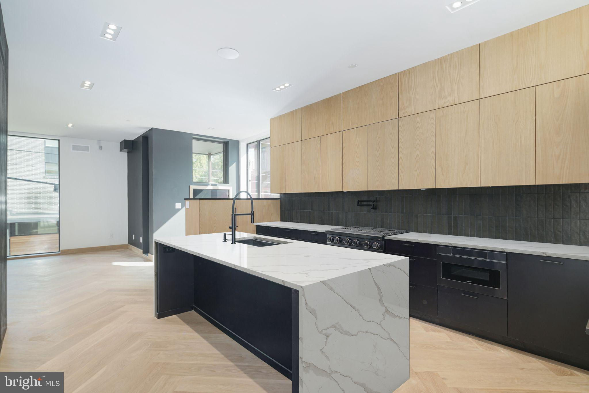 This new construction masterpiece isn't just a home; it's a statement. A rare opportunity to own a piece of architectural excellence designed by award winning architect, Moto DesignShop, that seamlessly blends high-end luxury with everyday comfort, PLUS a full 10 year tax abatement. (the old one!) As you walk up the front stairs & through the stately front door, you'll be greeted by the grandeur of this 32 ft wide residence. The warm, natural tones of the oak floors & trim, mixed with matte black accents create an inviting atmosphere through every corner of this stunning residence. Pass the sunken foyer & you’ll find yourself in the sleek & sultry kitchen. White oak upper cabinets & matte black lower cabinets are a classic pairing that won’t go out of style. High end appliances are hidden behind matching oak cabinetry, for that ultimate high end feel. With seating at the island, the kitchen seamlessly flows into the dining & living area. The open, yet distinct spaces on the first floor are a showcase of sophistication. The living room starts with 10 ft floor to ceilings windows. Light floods the room. This inviting room with gas fireplace will become the heart of the home. Beyond the living room is the dining room. A patio with sliding glass door is the perfect spot to grill & get some fresh air. A large walk in pantry & powder room finish off this floor. As you explore, you'll notice that every detail has been meticulously considered. White oak hardwood floors paired with white oak baseboard & door trim & 8ft solid core white oak doors give the entire residence a warm & inviting feeling. Custom built staircase detail is a real showpiece. 28 degree handles are something you knew you never had to have until now. Dimmable, trimless recessed lights offer an interesting detail. All bathrooms feature penny round tiles, matte black fixtures, floating toilets, one piece matte white vanities, rounded white oak vanities with matching trimmed mirrors, cement look tiles & whisper quiet exhaust fans. 4 zone HVAC so you can easily control the temperature in the house. This home doesn't just offer luxury, it offers ease & convenience. The 2 car garage ensures your vehicles are safe. The laundry room is on the 2nd floor & has side by side Samsung washer & dryer. The 5 stop elevator connects all levels, from the basement to the roof deck. The top floor, the primary suite level is your own private oasis to start & end each day. The expansive bedroom is flooded with light with its 10 ft floor to ceiling windows. This bathroom is a retreat where you can relax & rejuvenate. A spacious walk-in shower with dual shower heads & a glass door, provides a seamless transition from the rest of the bathroom. Prefer a bath? Unwind in the deep soaking tub as you look out into the city. An oversized dual vanity with ample counter space, elegant rounded cabinet, backlight mirror, & skylight making getting ready a joy. Enjoy privacy & functionality with a separate toilet room. You will find plenty of storage space for your linens with nooks strategically placed throughout. Between the bathroom & bedroom is a spacious walk-in closet with skylight. Build the closet of your dreams! A bonus space on this level with powder room & wet bar option has endless possibilities. With five bedrooms in total, this home offers flexibility to fit everyone’s needs. The second floor has 3 generously sized bedrooms, each with ample closet space & 2 bathrooms. The basement of the home has the 5th bedroom suite, with attached bathroom.The roof deck is where you'll be mesmerized by sweeping views of the surrounding area. You are on top of the city in this space. Nestled in the heart of Northern Liberties, local amenities & parks within just blocks, everything you need is just moments away. **Countertops virtually staged with Marble countertops to show alternate option if you do not like the soapstone. Seller will replace countertops with acceptable offer.