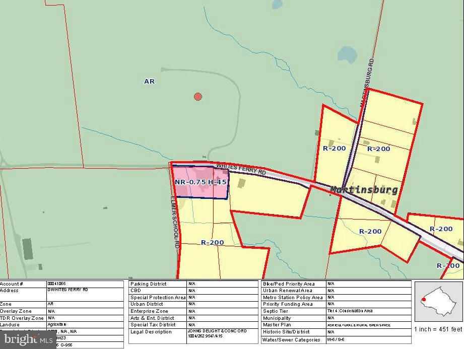 Beautiful and private 136.2 gently rolling acres in the western Montgomery County Agricultural Reserve. This property offers a mix of cleared farmland and forest with excellent road access along both Whites Ferry Rd and Martinsburg Rd. There are remnants of a home on the property. AR Zoning provides potential for up to five residential lots (min 25 acres each). Just minutes from recreational opportunities along the Potomac River and the lovely small town of Poolesville that offers some of the highest rated schools in the state. The main entrance to the property is on Whites Ferry Rd near the intersection with Elmer School Rd. Please do not enter the property without prior approval.